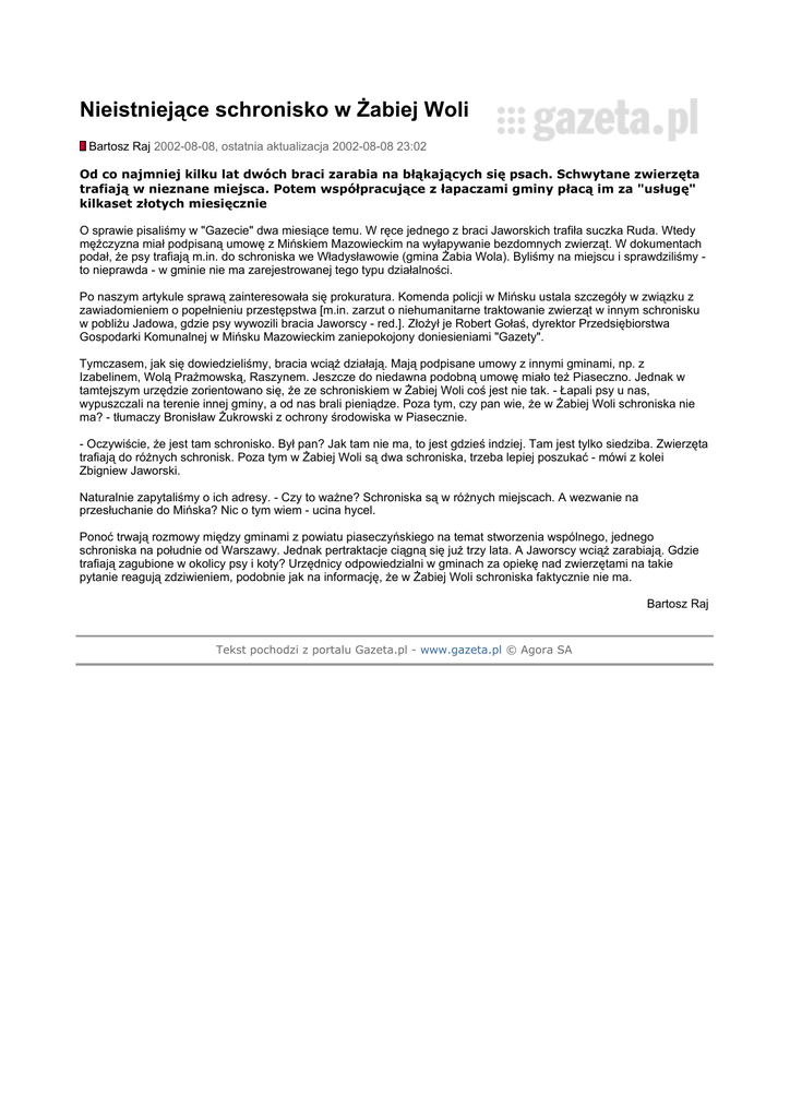 Nieistniejące schronisko w Żabiej Woli Bartosz Raj 2002-08-08, ostatnia aktualizacja 2002-08-08 23:02 Od co najmniej kilku lat dwóch braci zarabia na błąkających się psach. Schwytane zwierzęta trafiają w nieznane miejsca. Potem współpracujące z łapaczami gminy płacą im za "usługę" kilkaset złotych miesięcznie O sprawie pisaliśmy w "Gazecie" dwa miesiące temu. W ręce jednego z braci Jaworskich trafiła suczka Ruda. Wtedy mężczyzna miał podpisaną umowę z Mińskiem Mazowieckim na wyłapywanie bezdomnych zwierząt. W dokumentach podał, że psy trafiają m.in. do schroniska we Władysławowie (gmina Żabia Wola). Byliśmy na miejscu i sprawdziliśmy to nieprawda - w gminie nie ma zarejestrowanej tego typu działalności. Po naszym artykule sprawą zainteresowała się prokuratura. Komenda policji w Mińsku ustala szczegóły w związku z zawiadomieniem o popełnieniu przestępstwa [m.in. zarzut o niehumanitarne traktowanie zwierząt w innym schronisku w pobliżu Jadowa, gdzie psy wywozili bracia Jaworscy - red.]. Złożył je Robert Gołaś, dyrektor Przedsiębiorstwa Gospodarki Komunalnej w Mińsku Mazowieckim zaniepokojony doniesieniami "Gazety". Tymczasem, jak się dowiedzieliśmy, bracia wciąż działają. Mają podpisane umowy z innymi gminami, np. z Izabelinem, Wolą Prażmowską, Raszynem. Jeszcze do niedawna podobną umowę miało też Piaseczno. Jednak w tamtejszym urzędzie zorientowano się, że ze schroniskiem w Żabiej Woli coś jest nie tak. - Łapali psy u nas, wypuszczali na terenie innej gminy, a od nas brali pieniądze. Poza tym, czy pan wie, że w Żabiej Woli schroniska nie ma? - tłumaczy Bronisław Żukrowski z ochrony środowiska w Piasecznie. - Oczywiście, że jest tam schronisko. Był pan? Jak tam nie ma, to jest gdzieś indziej. Tam jest tylko siedziba. Zwierzęta trafiają do różnych schronisk. Poza tym w Żabiej Woli są dwa schroniska, trzeba lepiej poszukać - mówi z kolei Zbigniew Jaworski. Naturalnie zapytaliśmy o ich adresy. - Czy to ważne? Schroniska są w różnych miejscach. A wezwanie na przesłuchanie do Mińska? Nic o tym wiem - ucina hycel. Ponoć trwają rozmowy między gminami z powiatu piaseczyńskiego na temat stworzenia wspólnego, jednego schroniska na południe od Warszawy. Jednak pertraktacje ciągną się już trzy lata. A Jaworscy wciąż zarabiają. Gdzie trafiają zagubione w okolicy psy i koty? Urzędnicy odpowiedzialni w gminach za opiekę nad zwierzętami na takie pytanie reagują zdziwieniem, podobnie jak na informację, że w Żabiej Woli schroniska faktycznie nie ma. Bartosz Raj Tekst pochodzi z portalu Gazeta.pl - www.gazeta.pl © Agora SA