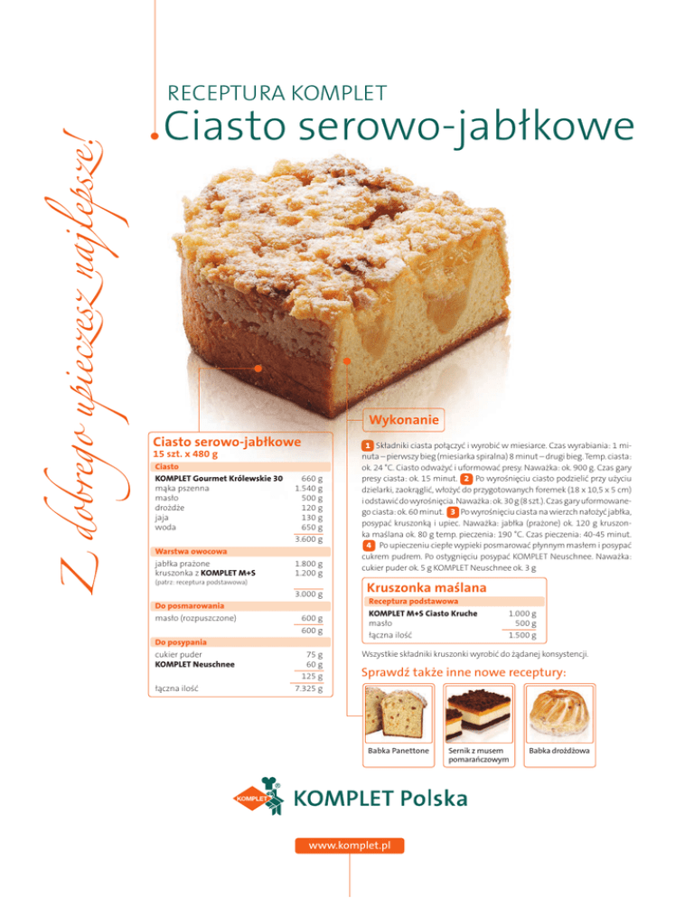 RECEPTURA KOMPLET Ciasto serowo-jabłkowe Wykonanie Ciasto serowo-jabłkowe 15 szt. x 480 g Ciasto KOMPLET Gourmet Królewskie 30 mąka pszenna masło drożdże jaja woda 660 g 1.540 g 500 g 120 g 130 g 650 g 3.600 g Warstwa owocowa jabłka prażone kruszonka z KOMPLET M+S (patrz: receptura podstawowa) 1.800 g 1.200 g 3.000 g Do posmarowania masło (rozpuszczone) Do posypania cukier puder KOMPLET Neuschnee łączna ilość 600 g 600 g 75 g 60 g 125 g 7.325 g 1 Składniki ciasta połączyć i wyrobić w miesiarce. Czas wyrabiania: 1 minuta – pierwszy bieg (miesiarka spiralna) 8 minut – drugi bieg. Temp. ciasta: ok. 24 °C. Ciasto odważyć i uformować presy. Naważka: ok. 900 g. Czas gary presy ciasta: ok. 15 minut. 2 Po wyrośnięciu ciasto podzielić przy użyciu dzielarki, zaokrąglić, włożyć do przygotowanych foremek (18 x 10,5 x 5 cm) i odstawić do wyrośnięcia. Naważka: ok. 30 g (8 szt.). Czas gary uformowanego ciasta: ok. 60 minut. 3 Po wyrośnięciu ciasta na wierzch nałożyć jabłka, posypać kruszonką i upiec. Naważka: jabłka (prażone) ok. 120 g kruszonka maślana ok. 80 g temp. pieczenia: 190 °C. Czas pieczenia: 40-45 minut. 4 Po upieczeniu ciepłe wypieki posmarować płynnym masłem i posypać cukrem pudrem. Po ostygnięciu posypać KOMPLET Neuschnee. Naważka: cukier puder ok. 5 g KOMPLET Neuschnee ok. 3 g Kruszonka maślana Receptura podstawowa KOMPLET M+S Ciasto Kruche masło łączna ilość 1.000 g 500 g 1.500 g Wszystkie składniki kruszonki wyrobić do żądanej konsystencji. Sprawdź także inne nowe receptury: Babka Panettone www.komplet.pl Sernik z musem pomarańczowym Babka drożdżowa