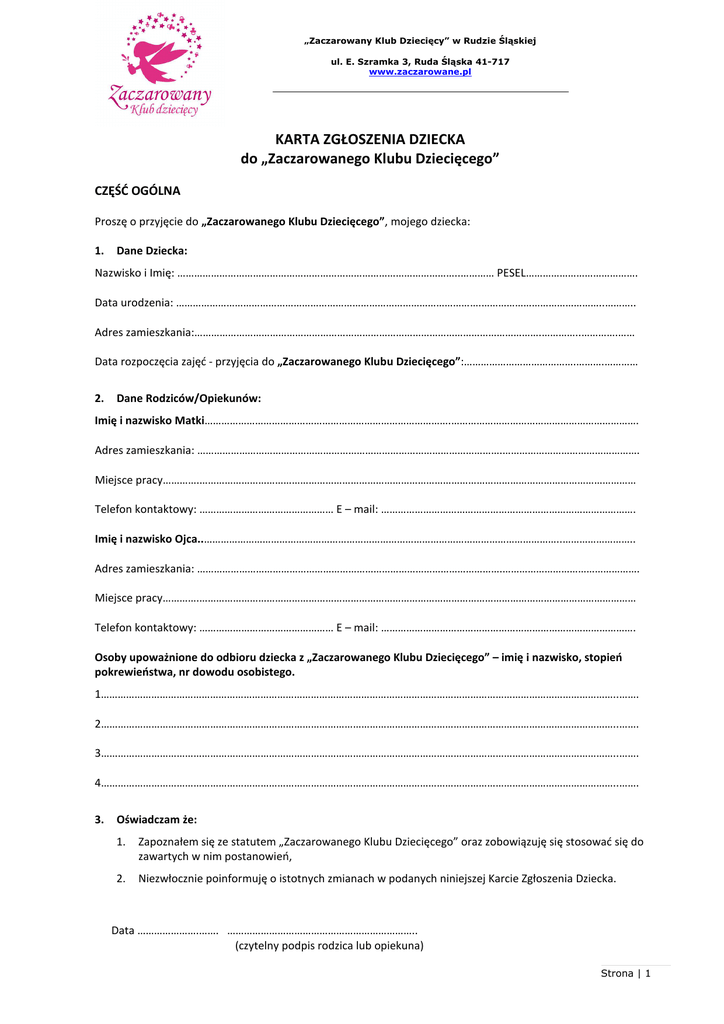 „Zaczarowany Klub Dziecięcy” w Rudzie Śląskiej ul. E. Szramka 3, Ruda Śląska 41-717 www.zaczarowane.pl KARTA ZGŁOSZENIA DZIECKA do „Zaczarowanego Klubu Dziecięcego” CZĘŚĆ OGÓLNA Proszę o przyjęcie do „Zaczarowanego Klubu Dziecięcego”, mojego dziecka: 1. Dane Dziecka: Nazwisko i Imię: ………………………………………………………………………………………..………… PESEL…………………………………. Data urodzenia: ……………………………………………………………………………………………….……………………………………..……….. Adres zamieszkania:…………………………………………………………………………………………………………….…………..………….…… Data rozpoczęcia zajęć - przyjęcia do „Zaczarowanego Klubu Dziecięcego”:………………………………….……….………… 2. Dane Rodziców/Opiekunów: Imię i nazwisko Matki…………………………………………………………………………….…………………………………………………………. Adres zamieszkania: ……………………………………………………………………………………………….…………………………………………. Miejsce pracy………….………………………………………………………………………………………………………………………………………… Telefon kontaktowy: ………………………………………… E – mail: ………………………………………………………………………………. Imię i nazwisko Ojca..………………………………………………………………………………………………………………..…………………….. Adres zamieszkania: ……………………………………………………………………………………………….…………………………………………. Miejsce pracy………….………………………………………………………………………………………………………………………………………… Telefon kontaktowy: ………………………………………… E – mail: ………………………………………………………………………………. Osoby upoważnione do odbioru dziecka z „Zaczarowanego Klubu Dziecięcego” – imię i nazwisko, stopień pokrewieństwa, nr dowodu osobistego. 1…………………………………………………………………………………………………………………………………………………………………..……. 2…………………………………………………………………………………………………………………………………………………………………..……. 3…………………………………………………………………………………………………………………………………………………………………..……. 4…………………………………………………………………………………………………………………………………………………………………..……. 3. Oświadczam że: 1. Zapoznałem się ze statutem „Zaczarowanego Klubu Dziecięcego” oraz zobowiązuję się stosować się do zawartych w nim postanowień, 2. Niezwłocznie poinformuję o istotnych zmianach w podanych niniejszej Karcie Zgłoszenia Dziecka. Data ………………….……. ………………………………………………………….. (czytelny podpis rodzica lub opiekuna) Strona | 1 „Zaczarowany Klub Dziecięcy” w Rudzie Śląskiej ul. E. Szramka 3, Ruda Śląska 41-717 www.zaczarowane.pl CZĘŚĆ SZCZEGÓŁOWA Proszę zaznaczyć te stwierdzenia, które najbardziej charakteryzują Państwa dziecko przez podkreślenie: Informacje ogólne o dziecku: − Potrafi samo się ubrać − Ubiera się z niewielką pomocą osób dorosłych − Wymaga pomocy przy ubieraniu − Samo radzi sobie z jedzeniem − Trzeba je karmić − Pamięta o potrzebach fizjologicznych i radzi sobie samo − Zgłasza swoje potrzeby ale wymaga pomocy przy pójściu do toalety − Trzeba je pilnować, bo zapomina o zgłaszaniu potrzeb fizjologicznych − Inne uwagi dotyczące dziecka: …………………………………………………………………………………………………………………………………… …………………………………………………………………………………..………………………………………………… Jedzenie − Praktycznie je wszystko, nie ma specjalnych upodobań. − Je wiele potraw, ale nie lubi i nie chce jeść:………………………………………………………………… − Jest niejadkiem. − Dziecko ma specjalne potrzeby związane z jedzeniem: − Jest alergikiem uczulonym na:………………………………………………………………………… − Inne (jakie)………………………………………………………….…………………………………………. Informacje o stanie zdrowia dziecka. 1. − − − Jak często dziecko choruje (właściwe podkreślić): rzadziej niż 1 x na kwartał, 2 – 3 razy w kwartale, częściej. Na jakie choroby najczęściej? Proszę wymienić: …………….……………………………………………………………………………………………………………………… 2. Jakie choroby zakaźne przebyło dziecko? Proszę wymienić: ……………………………………………………………………………………………………………………………………. 3. Inne istotne przebyte choroby: ……………………….……………………………………………....