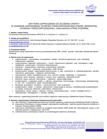 KRYTERIA ZAPROSZENIA DO ZŁOŻENIA OFERTY W ZAKRESIE ZAPEWNIENIA OCHRONY PRZECIWPOŻAROWEJ PRZEZ JEDNOSTKĘ OCHRONY PRZECIWPOŻAROWEJ: ZAKŁADOWĄ STRAŻ POŻARNĄ 1. Nazwa i adres firmy: Szczecińska Stocznia Remontowa GRYFIA S. A. Szczecin ul. Ludowa 13. 2. Osoby do kontaktów: w sprawach technicznych: Administracja Majątku Bogusław Siewiera, tel. 517 438 297 ; e-mail: [email protected]; w sprawach organizacyjnych: Kierownik Działu Zakupów i Logistyki Mariusz Pawlak, tel. 91 4242 748; e-mai: [email protected]. 3. Przedmiot oferty: Świadczenie usługi zapewnienia ochrony przeciwpożarowej SSR „Gryfia” poprzez jednostkę Zakładowej Straży Pożarnej. 4. Zakres prac do wykonania organizowanie i samodzielne prowadzenie działań ratowniczo-gaśniczych oraz likwidacja miejscowych zagrożeń, rozpoznawanie zagrożeń pożarowych i innych miejscowych zagrożeń oraz wynikająca z tego działalność prewencyjna ( kontrolno-rozpoznawcza), szkolenie i doskonalenie zawodowe pracowników jednostki, szkolenie wstępne i okresowe pracowników SSR „Gryfia”, podejmowanie działań organizacyjno-technicznych w celu utrzymania w należytej gotowości sprzętu ratowniczo gaśniczego i zaplecza technicznego, wykonywanie zadań specjalistycznych przy pomocy sprzętu będącego w dyspozycji, pełnienie asyst podczas realizacji w stoczni prac pożarowo niebezpiecznych, pełnienie asyst podczas tankowania i zdawania paliwa statkowego, podejmowanie i realizacja zadań z zakresu ratownictwa technicznego, chemicznego, ekologicznego w tym min. rozstawianie zapór przeciwolejowych, likwidacja powstałych wycieków i zanieczyszczeń wód portowych, podejmowanie zadań z zakresu ratownictwa medycznego tj. pomocy przedlekarskiej (współdziałanie ze służbą medyczną- lekarzem, ratownikiem medycznym), świadczenie innych usług z zakresu ochrony przeciwpożarowej i innych rodzajów ochron i zabezpieczeń wynikających z potrzeb zakładu. Stan osobowy i organizację jednostki musi określić regulamin organizacyjny Zakładowej Straży Pożarnej. 6. Sprawy organizacyjne dotyczące funkcjonowania jednostki: a) stan osobowy i organizację jednostki musi określić regulamin organizacyjny Zakładowej Straży Pożarnej; b) pracownicy Wykonawcy muszą posiadać odpowiednie kwalifikacje i warunki psycho-fizyczne określone w Ustawie i Rozporządzeniu MSW; c) wykonawca zobowiązany będzie do przejęcia pracowników SSR Gryfia SA wykonujących usługi w tym zakresie zgodnie z zapisami par. 23(1) KP; d) zainteresowany zobowiązany będzie do przestrzegania tajemnicy służbowej. 7. Tryb złożenia oferty: Zaproszenie do składania ofert. Zastrzegamy sobie prawo swobodnej decyzji względem wyboru ofert, negocjacji uzupełniających z wybranym oferentem, a także nieprzyjęcia żadnej z ofert bez konieczności podania przyczyny a także prawo do zmiany treści warunków w każdej chwili i w każdy sposób. Niniejszy dokument nie tworzy przetargu ani aukcji oraz nie stanowi zaproszenia do złożenia ofert w przetargu ani aukcji. Treść niniejszego dokumentu nie stanowi oferty w rozumieniu art. 66 k.c. 8. Kryteria oceny: a) zamawiający oczekuje podania ceny ryczałtowej za wykonanie zakresu prac oraz ceny jednostkowej za roboczogodzinę, b) wybór wykonawcy nastąpi na podstawie kryteriów w postaci ceny i jakości tj. oceny doświadczenia Wykonawcy w realizowaniu opisanych zadań. 9. Miejsce i termin złożenia oferty: Oferty należy składać listownie na adres: ul. Ludowa 13, 71-700 Szczecin w terminie do dnia 27.09.2012r. z dopiskiem „ochrona p-poż”. 10. Warunki płatności: Oczekiwany termin płatności to 60 dni od daty otrzymania faktury. 11. Termin ważności oferty: Oczekuje się 60 dniowego okresu ważności oferty. 12. Dane kontaktowe: Oferent przedstawi w ofercie wykaz osób do kontaktów. 13. Termin i forma rozpatrywania ofert: a) przyjęcie oferty nastąpi w formie podpisania umowy przez obie strony; b) brak powiadomienia przez SSR Gryfia SA o wybraniu oferty jest równoznaczne z jej odrzuceniem. 2