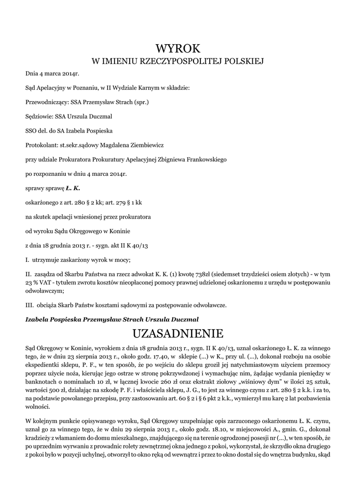 WYROK W IMIENIU RZECZYPOSPOLITEJ POLSKIEJ Dnia 4 marca 2014r. Sąd Apelacyjny w Poznaniu, w II Wydziale Karnym w składzie: Przewodniczący: SSA Przemysław Strach (spr.) Sędziowie: SSA Urszula Duczmal SSO del. do SA Izabela Pospieska Protokolant: st.sekr.sądowy Magdalena Ziembiewicz przy udziale Prokuratora Prokuratury Apelacyjnej Zbigniewa Frankowskiego po rozpoznaniu w dniu 4 marca 2014r. sprawy sprawę Ł. K. oskarżonego z art. 280 § 2 kk; art. 279 § 1 kk na skutek apelacji wniesionej przez prokuratora od wyroku Sądu Okręgowego w Koninie z dnia 18 grudnia 2013 r. - sygn. akt II K 40/13 I. utrzymuje zaskarżony wyrok w mocy; II. zasądza od Skarbu Państwa na rzecz adwokat K. K. (1) kwotę 738zł (siedemset trzydzieści osiem złotych) - w tym 23 % VAT - tytułem zwrotu kosztów nieopłaconej pomocy prawnej udzielonej oskarżonemu z urzędu w postępowaniu odwoławczym; III. obciąża Skarb Państw kosztami sądowymi za postępowanie odwoławcze. Izabela Pospieska Przemysław Strach Urszula Duczmal UZASADNIENIE Sąd Okręgowy w Koninie, wyrokiem z dnia 18 grudnia 2013 r., sygn. II K 40/13, uznał oskarżonego Ł. K. za winnego tego, że w dniu 23 sierpnia 2013 r., około godz. 17.40, w sklepie (...) w K., przy ul. (...), dokonał rozboju na osobie ekspedientki sklepu, P. F., w ten sposób, że po wejściu do sklepu groził jej natychmiastowym użyciem przemocy poprzez użycie noża, kierując jego ostrze w stronę pokrzywdzonej i wymachując nim, żądając wydania pieniędzy w banknotach o nominałach 10 zł, w łącznej kwocie 260 zł oraz ekstrakt ziołowy „wiśniowy dym” w ilości 25 sztuk, wartości 500 zł, działając na szkodę P. F. i właściciela sklepu, J. G., to jest za winnego czynu z art. 280 § 2 k.k. i za to, na podstawie powołanego przepisu, przy zastosowaniu art. 60 § 2 i § 6 pkt 2 k.k., wymierzył mu karę 2 lat pozbawienia wolności. W kolejnym punkcie opisywanego wyroku, Sąd Okręgowy uzupełniając opis zarzuconego oskarżonemu Ł. K. czynu, uznał go za winnego tego, że w dniu 29 sierpnia 2013 r., około godz. 18.10, w miejscowości A., gmin. G., dokonał kradzieży z włamaniem do domu mieszkalnego, znajdującego się na terenie ogrodzonej posesji nr (...), w ten sposób, że po uprzednim wyrwaniu z prowadnic rolety zewnętrznej okna jednego z pokoi, wykorzystał, że skrzydło okna drugiego z pokoi było w pozycji uchylnej, otworzył to okno ręką od wewnątrz i przez to okno dostał się do wnętrza budynku, skąd zabrał w celu przywłaszczenia różne środki płatnicze w postaci 6.500,- zł, 240 euro, 6 dolarów oraz kasetkę metalową z zawartością biżuterii, tablet marki M. i portfel z zawartością dowodu osobistego wystawionego na nazwisko A. K., wszystko łącznej wartości co najmniej 10.000,- zł, działając na szkodę T. i A. K., to jest za winnego przestępstwa z art. 279 § 1 k.k. i za to na podstawie powołanego przepisu, wymierzył mu karę 1 roku i 2 miesięcy pozbawienia wolności. Wskazane powyżej kary zostały połączone, w wyniku czego oskarżonemu wymierzona została kara łączna 2 lat pozbawienia wolności, na poczet której zaliczono okres rzeczywistego pozbawienia wolności w sprawie od dnia 29 sierpnia 2013 r. do dnia 18 grudnia 2013 r. Nadto opisywanym wyrokiem orzeczono w przedmiocie dowodów rzeczowych i kosztów postępowania. Apelację od powyższego wyroku wywiódł prokurator, zaskarżając go w całości na niekorzyść oskarżonego i zarzucając błąd w ustaleniach faktycznych polegający na przyjęciu, że nawet najniższa kara przewidziana za czyn zarzucony oskarżonemu w pkt I części wstępnej wyroku, to jest za przestępstwo z art. 280 § 2 k.k., byłaby niewspółmiernie surowa i tym samym zastosowanie w stosunku do niego nadzwyczajnego złagodzenia kary z art. 60 § 2 k.k. – podczas gdy okoliczności podmiotowe i przedmiotowe sprawy skłaniały do wniosków przeciwnych. Podnosząc przytoczony zarzut apelujący prokurator wniósł o zmianę zaskarżonego wyroku poprzez wymierzenie oskarżonemu za czyn opisany w pkt I części wstępnej wyroku kary 4 lat pozbawienia wolności bez stosowania wobec niego instytucji nadzwyczajnego załagodzenia kary, za czyn opisany w pkt II części wstępnej wyroku – kary 1 roku i 2 miesięcy pozbawienia wolności oraz wymierzenie mu kary łącznej 4 lat i 6 miesięcy pozbawienia wolności oraz zwolnienia oskarżonego od kosztów sądowych. W toku rozprawy apelacyjnej, prokurator zmodyfikował przytoczony wniosek apelacji, domagając się uchylenia zaskarżonego wyroku i przekazania sprawy Sądowi I instancji do ponownego rozpoznania, podkreślając przy tym szczególną demoralizację oskarżonego, wskazującą na niezasadność stosowania wobec niego nadzwyczajnego złagodzenia kary. Sąd Apelacyjny zważył, co następuje: Apelacja okazała się bezzasadna. Na wstępie zaznaczyć należało, że jakkolwiek prokurator nominalnie zaskarżył wyrok Sądu I instancji w całości, krytyczne uwagi swojej apelacji skierował wyłącznie przeciwko prawidłowości zastosowania wobec oskarżonego instytucji nadzwyczajnego złagodzenia kary, orzeczonej za czyn z art. 280 § 2 k.k. W tej sytuacji, uwzględniając rzeczywisty zakres zaskarżenia, Sąd Apelacyjny nie znalazł podstaw by poddać w wątpliwość ustalenia faktyczne i wnioskowanie Sądu I instancji skutkujące przyjęciem sprawstwa i zawinienia oskarżonego w zakresie zarzuconych mu czynów z art. 280 § 2 k.k. i art. 279 § 1 k.k. Ustalenia te poczynione bowiem zostały w oparciu o prawidłową ocenę dowodów i wolne były od błędów logicznych; nadto we wskazanym zakresie w ramach procedowania i rozumowania Sądu I instancji nie dostrzeżono żadnych wadliwości uwzględnianych ex officio i mogących skutkować modyfikacją zaskarżonego rozstrzygnięcia w przedmiocie winy. Przejść zatem należało do tych – zakwestionowanych przez prokuratora – ustaleń faktycznych Sądu I instancji, które le