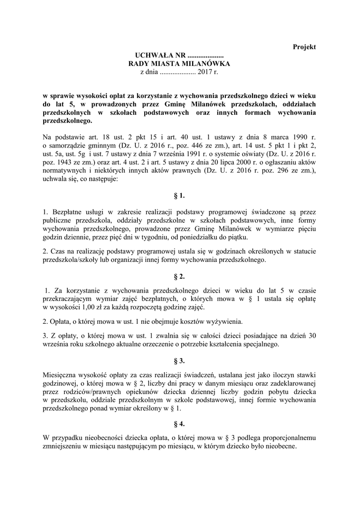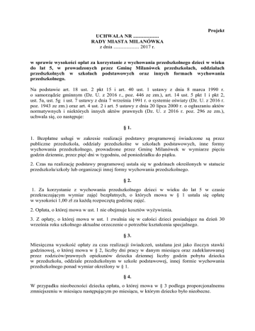Projekt UCHWAŁA NR .................... RADY MIASTA MILANÓWKA z dnia .................... 2017 r. w sprawie wysokości opłat za korzystanie z wychowania przedszkolnego dzieci w wieku do lat 5, w prowadzonych przez Gminę Milanówek przedszkolach, oddziałach przedszkolnych w szkołach podstawowych oraz innych formach wychowania przedszkolnego. Na podstawie art. 18 ust. 2 pkt 15 i art. 40 ust. 1 ustawy z dnia 8 marca 1990 r. o samorządzie gminnym (Dz. U. z 2016 r., poz. 446 ze zm.), art. 14 ust. 5 pkt 1 i pkt 2, ust. 5a, ust. 5g i ust. 7 ustawy z dnia 7 września 1991 r. o systemie oświaty (Dz. U. z 2016 r. poz. 1943 ze zm.) oraz art. 4 ust. 2 i art. 5 ustawy z dnia 20 lipca 2000 r. o ogłaszaniu aktów normatywnych i niektórych innych aktów prawnych (Dz. U. z 2016 r. poz. 296 ze zm.), uchwala się, co następuje: § 1. 1. Bezpłatne usługi w zakresie realizacji podstawy programowej świadczone są przez publiczne przedszkola, oddziały przedszkolne w szkołach podstawowych, inne formy wychowania przedszkolnego, prowadzone przez Gminę Milanówek w wymiarze pięciu godzin dziennie, przez pięć dni w tygodniu, od poniedziałku do piątku. 2. Czas na realizację podstawy programowej ustala się w godzinach określonych w statucie przedszkola/szkoły lub organizacji innej formy wychowania przedszkolnego. § 2. 1. Za korzystanie z wychowania przedszkolnego dzieci w wieku do lat 5 w czasie przekraczającym wymiar zajęć bezpłatnych, o których mowa w § 1 ustala się opłatę w wysokości 1,00 zł za każdą rozpoczętą godzinę zajęć. 2. Opłata, o której mowa w ust. 1 nie obejmuje kosztów wyżywienia. 3. Z opłaty, o której mowa w ust. 1 zwalnia się w całości dzieci posiadające na dzień 30 września roku szkolnego aktualne orzeczenie o potrzebie kształcenia specjalnego. § 3. Miesięczna wysokość opłaty za czas realizacji świadczeń, ustalana jest jako iloczyn stawki godzinowej, o której mowa w § 2, liczby dni pracy w danym miesiącu oraz zadeklarowanej przez rodziców/prawnych opiekunów dziecka dziennej liczby godzin pobytu dziecka w przedszkolu, oddziale przedszkolnym w szkole podstawowej, innej formie wychowania przedszkolnego ponad wymiar określony w § 1. § 4. W przypadku nieobecności dziecka opłata, o której mowa w § 3 podlega proporcjonalnemu zmniejszeniu w miesiącu następującym po miesiącu, w którym dziecko było nieobecne. § 5. Warunki korzystania z wychowania przedszkolnego, wysokość opłat za korzystanie z wychowania przedszkolnego w czasie przekraczającym wymiar zajęć bezpłatnych oraz opłat za wyżywienie, określa umowa cywilnoprawna zawierana pomiędzy dyrektorem przedszkola/szkoły a rodzicami/prawnymi opiekunami dziecka. § 6. Traci moc Uchwała Nr 412/XXXV/14 Rady Miasta Milanówka z dnia 13 lutego 2014 r. w sprawie wysokości opłaty za świadczenia udzielane przez przedszkole publiczne prowadzone przez Gminę Milanówek (Dz. Urz. Woj. Maz. poz. 3227). § 7. Wykonanie uchwały powierza się Burmistrzowi Miasta Milanówka. § 8. Uchwała wchodzi w życie z dniem ogłoszenia w Dzienniku Urzędowym Województwa Mazowieckiego z mocą obowiązującą od dnia 1 stycznia 2017 r. Przewodnicząca Rady Miasta Milanówka mgr Małgorzata Trębińska Uzasadnienie Dnia 9 grudnia 2016 r., weszła w życie ustawa z dnia 1 grudnia 2016 r. o zmian o dochodach jednostek samorządu terytorialnego oraz niektórych innych ustaw (Dz. U. z 2016 r. poz. 1985), która wprowadziła zmiany w finansowaniu wychowania przedszkolnego. Zgodnie z w/w ustawą, począwszy od roku 2017, dzieci sześcioletnie uczęszczające do przedszkoli, innych form wychowania przedszkolnego i oddziałów przedszkolnych w szkołach podstawowych zostaną objęte subwencją oświatową. Jednocześnie, nowelizacja znosi możliwość pobierania przez organ prowadzący opłat za korzystanie z wychowania przedszkolnego dzieci w wieku 6 lat. Na podstawie zmienionego art. 14 ust. 5 pkt 1 ustawy z dnia 7 września 1991 r. o systemie oświaty (Dz. U. z 2016 r., poz. 446, 1579) rada gminy określa wysokość opłat za korzystanie z wychowania przedszkolnego dzieci w wieku do lat 5 w prowadzonych przez gminę publicznych przedszkolach, oddziałach przedszkolnych w szkołach podstawowych oraz innych formach wychowania przedszkolnego. Przy określaniu wysokości opłat, rada gminy uwzględnia czas bezpłatnego nauczania, wychowania i opieki nie krótszy niż 5 godzin dziennie oraz może ustalić warunki częściowego lub całkowitego zwolnienia z opłat. Uchwała zawiera uregulowania odnoszące się do zmienionego stanu prawnego oraz zachowuje wysokość dotychczas obowiązującej w Gminie Milanówek opłaty. Wprowadza jednocześnie w § 2 nowe zapisy dotyczące całkowitego zwolnieniu z opłat niektórych dzieci. Zgodnie z § 2 ust. 3 uchwały, z opłaty zwalnia się posiadające na dzień 30 września roku szkolnego aktualne orzeczenie o potrzebie kształcenia specjalnego. Zwolnienie takie zaproponowano z uwagi na fakt, iż na dzieci niepełnosprawne, wykazane w bazie danych Systemu Informacji Oświatowej wg stanu na dzień 30 września roku poprzedzającego rok budżetowy, gmina otrzymuje dodatkową część oświatową subwencji ogólnej z przeznaczeniem na realizację zadań związanych kształceniem tych dzieci. Wychowanie dziecka niepełnosprawnego niesie ze sobą ogromny wysiłek nie tylko organizacyjny, ale także finansowy dla rodziców/prawnych opiekunów niepełnosprawnych dzieci, dlatego zastosowanie proponowanego zwolnienia jest w pełni zasadne. Uchwała wchodzi w życie z dniem ogłoszenia w Dzienniku Urzędowym Województwa Mazowieckiego z mocą obowiązującą od dnia 1 stycznia 2017 r. Zgodnie z art. 4 ust. 2 ustawy z dnia 20 lipca 2000 r. o ogłaszaniu aktów normatywnych i niektórych innych aktów prawnych (Dz. U. z 2016 r. poz. 296 i 1579), w uzasadnionych przypadkach akty normatywne, z zastrzeżeniem ust. 3 ww. ustawy, mogą wchodzić w życie w terminie krótszym ni