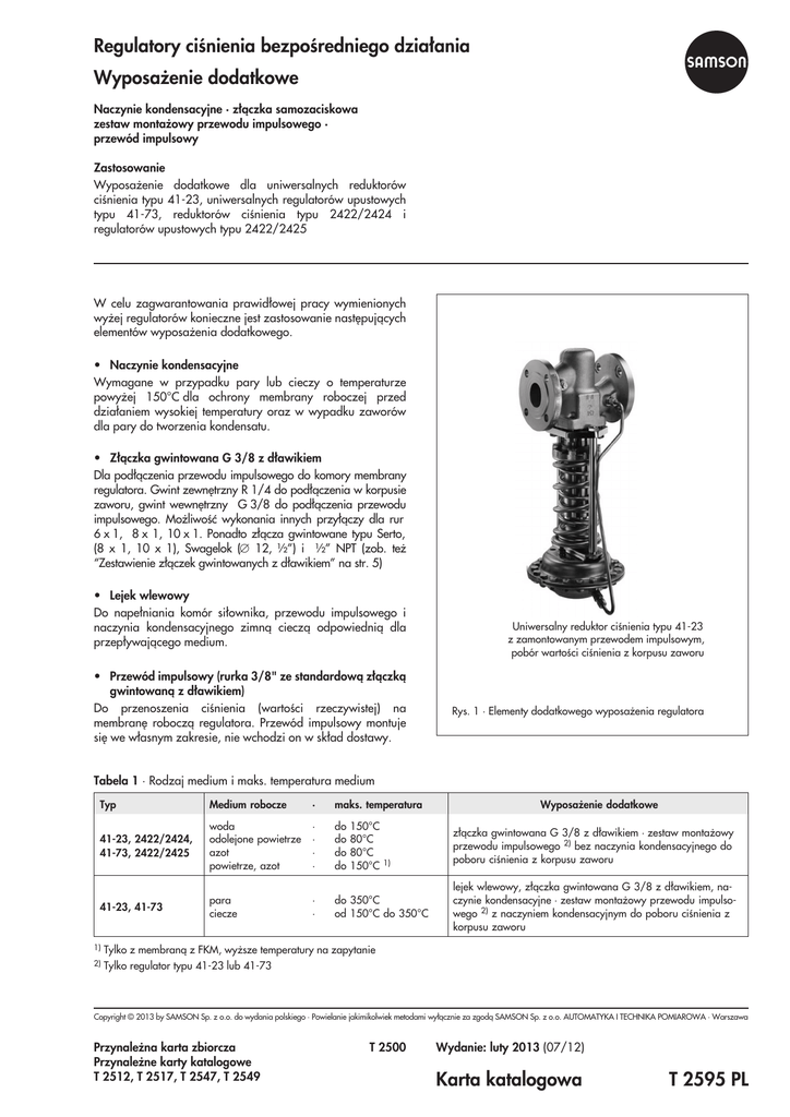 Regulatory ciœnienia bezpoœredniego dzia³ania Wyposa¿enie dodatkowe Naczynie kondensacyjne · z³¹czka samozaciskowa zestaw monta¿owy przewodu impulsowego · przewód impulsowy Zastosowanie Wyposa¿enie dodatkowe dla uniwersalnych reduktorów ciœnienia typu 41-23, uniwersalnych regulatorów upustowych typu 41-73, reduktorów ciœnienia typu 2422/2424 i regulatorów upustowych typu 2422/2425 W celu zagwarantowania prawid³owej pracy wymienionych wy¿ej regulatorów konieczne jest zastosowanie nastêpuj¹cych elementów wyposa¿enia dodatkowego. • Naczynie kondensacyjne Wymagane w przypadku pary lub cieczy o temperaturze powy¿ej 150°C dla ochrony membrany roboczej przed dzia³aniem wysokiej temperatury oraz w wypadku zaworów dla pary do tworzenia kondensatu. • Z³¹czka gwintowana G 3/8 z d³awikiem Dla pod³¹czenia przewodu impulsowego do komory membrany regulatora. Gwint zewnêtrzny R 1/4 do pod³¹czenia w korpusie zaworu, gwint wewnêtrzny G 3/8 do pod³¹czenia przewodu impulsowego. Mo¿liwoœæ wykonania innych przy³¹czy dla rur 6 x 1, 8 x 1, 10 x 1. Ponadto z³¹cza gwintowane typu Serto, (8 x 1, 10 x 1), Swagelok (∅ 12, ½”) i ½” NPT (zob. te¿ “Zestawienie z³¹czek gwintowanych z d³awikiem” na str. 5) • Lejek wlewowy Do nape³niania komór si³ownika, przewodu impulsowego i naczynia kondensacyjnego zimn¹ ciecz¹ odpowiedni¹ dla przep³ywaj¹cego medium. • Przewód impulsowy (rurka 3/8" ze standardow¹ z³¹czk¹ gwintowan¹ z d³awikiem) Do przenoszenia ciœnienia (wartoœci rzeczywistej) na membranê robocz¹ regulatora. Przewód impulsowy montuje siê we w³asnym zakresie, nie wchodzi on w sk³ad dostawy. Uniwersalny reduktor ciœnienia typu 41-23 z zamontowanym przewodem impulsowym, pobór wartoœci ciœnienia z korpusu zaworu Rys. 1 · Elementy dodatkowego wyposa¿enia regulatora Tabela 1 · Rodzaj medium i maks. temperatura medium Typ Medium robocze · maks. temperatura 41-23, 2422/2424, 41-73, 2422/2425 woda odolejone powietrze azot powietrze, azot · · · · do do do do 41-23, 41-73 para ciecze · · do 350°C od 150°C do 350°C 150°C 80°C 80°C 150°C 1) Tylko z membran¹ z FKM, wy¿sze temperatury na zapytanie 2) Tylko regulator typu 41-23 lub 41-73 1) Wyposa¿enie dodatkowe z³¹czka gwintowana G 3/8 z d³awikiem · zestaw monta¿owy przewodu impulsowego 2) bez naczynia kondensacyjnego do poboru ciœnienia z korpusu zaworu lejek wlewowy, z³¹czka gwintowana G 3/8 z d³awikiem, naczynie kondensacyjne · zestaw monta¿owy przewodu impulsowego 2) z naczyniem kondensacyjnym do poboru ciœnienia z korpusu zaworu Copyright © 2013 by SAMSON Sp. z o.o. do wydania polskiego · Powielanie jakimikolwiek metodami wy³¹cznie za zgod¹ SAMSON Sp. z o.o. AUTOMATYKA I TECHNIKA POMIAROWA · Warszawa Przynale¿na karta zbiorcza Przynale¿ne karty katalogowe T 2512, T 2517, T 2547, T 2549 T 2500 Wydanie: luty 2013 (07/12) Karta katalogowa T 2595 PL Naczynie kondensacyjne (rys. 2) Je¿eli warunki eksploatacyjne wymagaj¹ zamontowania naczynia kondensacyjnego, jego wielkoœæ i numer katalogowy nale¿y wybraæ w tabeli 2 w zale¿noœci od œrednicy nominalnej i wielkoœci si³ownika (powierzchnia membrany A). Przewody impulsowe nale¿y przyspawaæ do przy³¹czy do wspawania naczynia kondensacyjnego.. Tabela 3 · Wymiary naczyñ kondensacyjnych w mm, numer katalogowy Nr katalogowy Wys. zabudowy L Materia³ 1190-8788 1190-8789 1190-8790 105 195 285 blacha stalowa S235JR (St 37-2) Tabela 2 · Dobór naczynia kondensacyjnego, numer katalogowy Si³ownik Aw cm2 Numer katalogowy DN 15 do 50 DN 65 do 250 640 1190-8789 1190-8790 320 1190-8788 1190-8789 160/80/40 1190-8788 przy³¹cze dla przewodu impulsowego 3/8” Rys. 2 · Naczynie kondensacyjne w wykonaniu z przy³¹czami do wspawania Copyright © 2013 by SAMSON Sp. z o.o. do wydania polskiego · Powielanie jakimikolwiek metodami wy³¹cznie za zgod¹ SAMSON Sp. z o.o. AUTOMATYKA I TECHNIKA POMIAROWA · Warszawa 2 T 2595 PL Zestawy monta¿owe przewodu impulsowego dla regulatorów typu 41-23 lub 41-73 – wartoœci zadane ciœnienia ≥ 0,8 bar Zestaw monta¿owy przewodu impulsowego bez naczynia kondensacyjnego Dla poboru ciœnienia bezpoœrednio z korpusu zaworu wraz z zaworem d³awi¹cym dla powietrza i gazów o temperaturze do maks. 80°C, cieczy o temperaturze do maks. 150°C, powietrza i azotu o temperaturze do 150°C – o ile zastosowano membranê z FKM –. W po³¹czeniu z si³ownikami z mieszkami metalowymi i z membran¹ robocz¹ o powierzchni A = 33 cm2 wzglêdnie 62 cm2 ten zestaw monta¿owy mo¿na stosowaæ tak¿e w przypadku mediów o temperaturze do 350 °C. Tabela 4 · Zestaw monta¿owy przewodu impulsowego bez naczynia kondensacyjnego, numer katalogowy Reduktor ciœnienia typu 41-23 Powierzchnia membrany A w cm2 Si³ownik 33/62 40/80 160 Przewód impulsowy, kompletny (1) + z³¹czka gwintowana z d³awikiem, kompletna (2) Numer katalogowy Œrednica nominalna DN stal nierdzewna 1.4571 15 do 25 1400-8860 1400-8861 1400-8862 32 1400-8866 1400-8867 1400-8868 40/50 1400-8872 1400-8873 1400-8874 65/80 1400-8878 1400-8879 1400-8880 100 1400-8824 1400-8885 1400-8886 Regulator upustowy typu 41-73 1) Powierzchnia membrany A w cm2 Si³ownik 33/62 40/80 Przewód impulsowy, kompletny (1) + z³¹czka gwintowana z d³awikiem, kompletna (2) Œrednica nominalna DN przewód impulsowy, kompletny · rurka 6 x 1 mm numer materia³u: 1.4571 2 z³¹czka gwintowana z d³awikiem, kompletna · numer materia³u: 1.4571 3 z³¹czka samozaciskowa, numer materia³u: 1.4571 Numer katalogowy stal nierdzewna 1.4571 15 do 25 1400-7480 1400-7481 1400-7482 32 1400-7485 1400-7486 1400-7487 40/50 1400-7490 1400-7491 1400-7492 65/80 1400-7495 1400-7496 1400-7497 100 1400-7500 1400-7501 1400-7502 1) 1 160 Oferowane zestawy monta¿owe przewodów impulsowych pasuj¹ wy³¹cznie do regulatorów w wykonaniu standardowym Rys. 3 · Zestaw monta¿owy przewodu impulsowego bez naczynia kondensacyjnego 3 T 2595 PL Zestawy monta¿owe przew