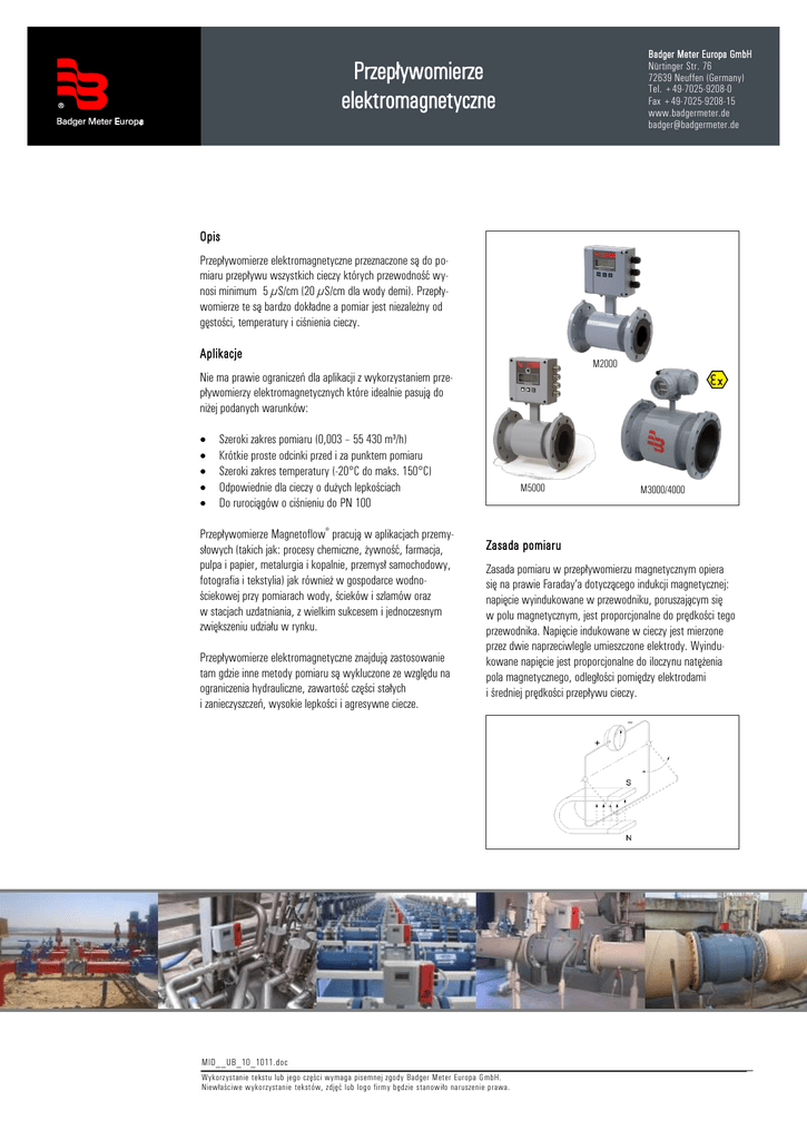 Badger Meter Europa GmbH Nürtinger Str. 76 72639 Neuffen (Germany) Tel. +49-7025-9208-0 Fax +49-7025-9208-15 www.badgermeter.de [email protected] Przepływomierze elektromagnetyczne Opis Przepływomierze elektromagnetyczne przeznaczone są do pomiaru przepływu wszystkich cieczy których przewodność wynosi minimum 5 µS/cm (20 µS/cm dla wody demi). Przepływomierze te są bardzo dokładne a pomiar jest niezależny od gęstości, temperatury i ciśnienia cieczy. Aplikacje M2000 Nie ma prawie ograniczeń dla aplikacji z wykorzystaniem przepływomierzy elektromagnetycznych które idealnie pasują do niżej podanych warunków: Szeroki zakres pomiaru (0,003 – 55 430 m³/h) Krótkie proste odcinki przed i za punktem pomiaru Szeroki zakres temperatury (-20°C do maks. 150°C) Odpowiednie dla cieczy o dużych lepkościach Do rurociągów o ciśnieniu do PN 100 Przepływomierze Magnetoflow® pracują w aplikacjach przemysłowych (takich jak: procesy chemiczne, żywność, farmacja, pulpa i papier, metalurgia i kopalnie, przemysł samochodowy, fotografia i tekstylia) jak również w gospodarce wodnościekowej przy pomiarach wody, ścieków i szlamów oraz w stacjach uzdatniania, z wielkim sukcesem i jednoczesnym zwiększeniu udziału w rynku. Przepływomierze elektromagnetyczne znajdują zastosowanie tam gdzie inne metody pomiaru są wykluczone ze względu na ograniczenia hydrauliczne, zawartość części stałych i zanieczyszczeń, wysokie lepkości i agresywne ciecze. M5000 M3000/4000 Zasada pomiaru Zasada pomiaru w przepływomierzu magnetycznym opiera się na prawie Faraday’a dotyczącego indukcji magnetycznej: napięcie wyindukowane w przewodniku, poruszającym się w polu magnetycznym, jest proporcjonalne do prędkości tego przewodnika. Napięcie indukowane w cieczy jest mierzone przez dwie naprzeciwlegle umieszczone elektrody. Wyindukowane napięcie jest proporcjonalne do iloczynu natężenia pola magnetycznego, odległości pomiędzy elektrodami i średniej prędkości przepływu cieczy. MID__UB_10_1011.doc Wykorzystanie tekstu lub jego części wymaga pisemnej zgody Badger Meter Europa G mbH. Niewłaściwe wykorzystanie tekstów, zdjęć lub logo firmy będzie stanowiło naruszenie prawa. Przetworniki ModMAG TM M2000 Przetwornik M2000 przeznaczony jest do dwukierunkowego pomiaru przepływu cieczy o przewodności > 5 µS/cm (> 20 µS/cm dla wody demi). M2000 charakteryzuje się wysoką dokładnością, jest łatwy w użyciu i może być użyty w szerokim spectrum aplikacji. 4-liniowy, podświetlany wyświetlacz pokazuje aktualne dane pomiarowe, ogólne i kompletne informacje włączając w to alarmy. W standardzie znajdują się 4 programowalne wyjścia cyfrowe, jedno cyfrowe wejście oraz (opcjonalnie) interfejs USB . Zintegrowane narzędzia testowe sprawiają że uruchomienie oraz serwisowanie staje się łatwiejsze. ModMAG™ M1000 Przetwornik typu M1000 jest przeznaczony do dwukierunkowego pomiaru przepływu cieczy o przewodności > 5 µS/cm (> 20 µS/cm przy wodzie demineralizowanej). M1000 wykazuje się wysoką dokładnością, jest łatwy w użyciu i może być użyty w szerokim spektrum aplikacji. Wszystkie informacje jak przepływ, suma lub informacje mogą być odczytane z podświetlanego wyświetlacza LCD. Standardowy model wyposażony jest w szeroki zakres wyjść, wejść i interfejsów dla wielu aplikacji. ModMAG® M1000 jest umieszczony w obudowie o stopniu ochrony IP67 dzięki czemu może być użyty nawet w ciężkich warunkach. ModMAG™ M3000/M4000 Przetwornik o modułowej budowie mogący dokonywać pomiaru w strefie 1 i 2 zagrożenia wybuchem zarówno w wersji kompaktowej jak i rozdzielnej. Aluminiowa, proszkowo malowana obudowa posiada stopień ochrony IP67 oraz osobną przestrzeń do połączeń elektrycznych. Programowanie może się odbywać przy zamkniętej obudowie dzięki użyciu klucza magnetycznego lub przy otwartej obudowie za pomocą 3 przycisków. 4-liniowy wyświetlacz dostarcza wszystkich niezbędnych danych jak bieżący przepływ, sumę oraz status. Programowalna częstotliwość pobudzenia pozwala na adaptację przepływomierza do trudnych aplikacji. Przetwornik posiada wysoką dokładność pomiaru w niskim zakresie przepływu. MID__UB_10_1011.doc Wykorzystanie tekstu lub jego części wymaga pisemnej zgody Badger Meter Europa G mbH. Niewłaściwe wykorzystanie tekstów, zdjęć lub logo firmy będzie stanowiło naruszenie prawa. Przetworniki ModMAG™ M5000 M5000 jest przepływomierzem elektromagnetycznym zasilanym bateryjnie z dużą dokładnością pomiaru nawet przy małych przepływach. Typowe aplikacje to detekcja przecieków w sieciach wodociągowych, zużycie wody, nawadnianie. Przepływomierz idealnie nadaje się do aplikacji gdzie występuje brak dostępu do zasilania a wymagany jest pomiar zużycia lub natężenia przepływu. Detektory Typ II Przyłącza kołnierzowe Detektor elektromagnetyczny typu II dostępny jest z różnymi typami przyłączy kołnierzowych (DIN, ANSI, JIS, AWWA, itp.) jak również z różnymi wykładzinami jak twarda i miękka guma, PTFE, PFA lub Halar. Dostępny w zakresie średnic od DN 6 do DN 1400 i nominalnym ciśnieniu do PN 100. Detektor typu II przeznaczony jest do szerokiej gamy aplikacji w przemyśle i gospodarce wodnościekowej. Przyłącza bezkołnierzowe Typ III Dzięki krótkiej długości zabudowy, detektory typu III jest często dobrą alternatywą dla wielu aplikacji. Dostarczany z wykładziną PTFE, detektor typu III posiada nominalne ciśnienie pracy PN 40. Typ Food Przyłącza Tri-Clamp®, DIN 11851, itp. Detektor w wersji spożywczej został stworzony do pomiaru przepływu ciekłej żywności. Model ten dostępny jest z przyłączami Tri-Clamp ®, DIN 11851 lub z innymi specjalnymi przyłączami wg specyfikacji klienta. Detektor w wersji spożywczy jest dostarczany w obudowie ze stali nierdzewnej i wykładziną PTFE. MID__UB_10_1011.doc Wykorzystanie tekstu lub jego części wymaga pisemn