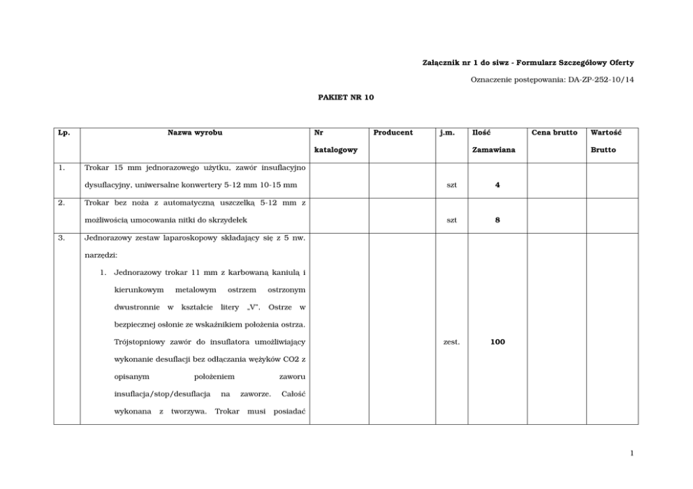Załącznik nr 1 do siwz - Formularz Szczegółowy Oferty Oznaczenie postępowania: DA-ZP-252-10/14 PAKIET NR 10 Lp. Nazwa wyrobu Nr Producent j.m. katalogowy 1. Zamawiana Wartość Brutto szt 4 szt 8 zest. 100 Trokar bez noŜa z automatyczną uszczelką 5-12 mm z moŜliwością umocowania nitki do skrzydełek 3. Cena brutto Trokar 15 mm jednorazowego uŜytku, zawór insuflacyjno dysuflacyjny, uniwersalne konwertery 5-12 mm 10-15 mm 2. Ilość Jednorazowy zestaw laparoskopowy składający się z 5 nw. narzędzi: 1. Jednorazowy trokar 11 mm z karbowaną kaniulą i kierunkowym dwustronnie metalowym w kształcie ostrzem litery „V”. ostrzonym Ostrze w bezpiecznej osłonie ze wskaźnikiem połoŜenia ostrza. Trójstopniowy zawór do insuflatora umoŜliwiający wykonanie desuflacji bez odłączania węŜyków CO2 z opisanym połoŜeniem insuflacja/stop/desuflacja wykonana z tworzywa. zaworu na zaworze. Trokar musi Całość posiadać 1 wbudowaną uszczelkę 5-11 mm. 2. Jednorazowa kaniula trójstopniowym 11 mm, zaworem karbowana insuflacyjnym z i wbudowaną uszczelką 5-11 mm kompatybilna z trokarem z pozycji1. 3. Jednorazowy trokar 5 mm z karbowana kaniulą i kierunkowym metalowym dwustronnie bezpiecznej ostrza. w kształcie osłonie ostrzem litery ze „V”. ostrzonym Ostrze wskaźnikiem Trójstopniowy zawór do w połoŜenia insulatora umoŜliwiający wykonanie desuflacji bez odłączania węŜyka CO2 Z opisanym połoŜeniem zaworu insuflacja/desuflacja za zaworze. Całość wykonana z tworzywa. 4. Jednorazowa trójstopniowym kaniula 5 mm, zaworem karbowana z insuflacyjnym, kompatybilna z trokarem z pozycji 3. 5. Jednorazowa igła Veressa 120 mm kaliber 14 G z sygnałem dźwiękowym i wizualnym określającym wejście do jamy brzusznej. Zestaw laparoskopowy dostarczony w opisanym kartonie, 2 który zapewnia bezpieczeństwo transportu i łatwość przechowywania. Dodatkowo kaŜdy produkt zapakowany w oddzielnym sterylnym opakowaniu. Wszystkie ww. narzędzia muszą być kompatybilne i pochodzić od jednego producenta. 4. Szew do narzędzia opakowaniu 12 szt, laparoskopowego długość 18 cm, do szycia, w wchłanialny i szt 24 niewchłanialny 0 i 2/0 Wartość brutto pakietu: ................................. zł Zastosowano stawkę VAT: .......... % Słownie: ................................................................................................................................................................... .................................................................... /podpis i pieczątka upowaŜnionego przedstawiciela / 3