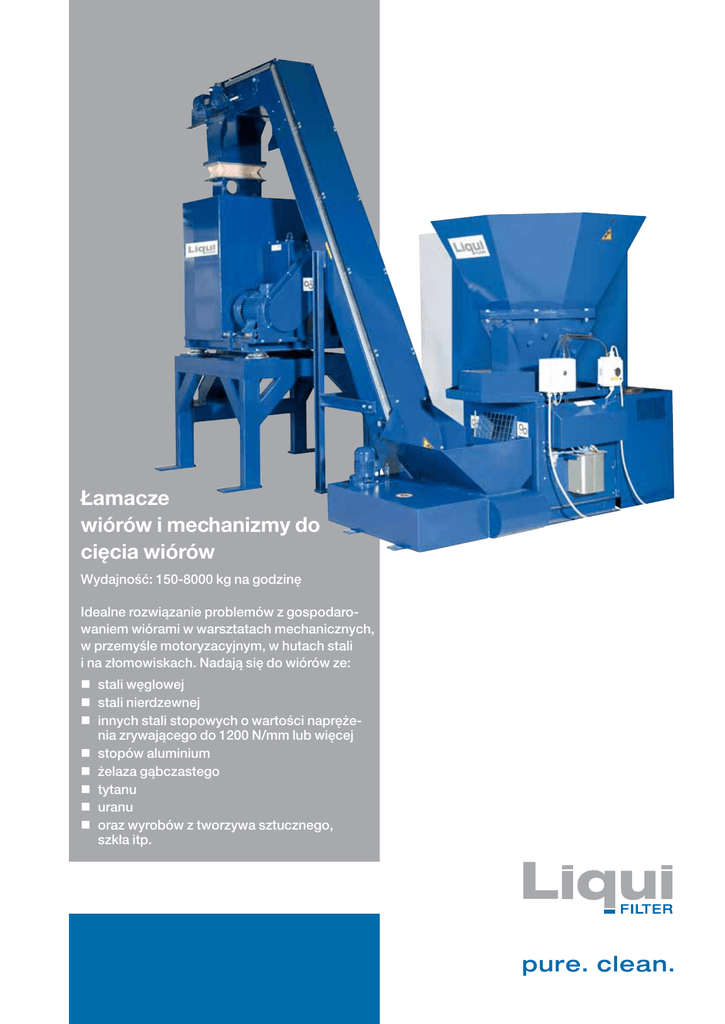 Łamacze wiórów i mechanizmy do cięcia wiórów Wydajność: 150-8000 kg na godzinę Idealne rozwiązanie problemów z gospodarowaniem wiórami w warsztatach mechanicznych, w przemyśle motoryzacyjnym, w hutach stali i na złomowiskach. Nadają się do wiórów ze: stali węglowej stali nierdzewnej innych stali stopowych o wartości naprężenia zrywającego do 1200 N/mm lub więcej stopów aluminium żelaza gąbczastego tytanu uranu oraz wyrobów z tworzywa sztucznego, szkła itp. pure. clean. Dane techniczne Model Ciągła zdolność produkcyjna * Wióry stalowe (kg/h) Wióry aluminiowe (kg/h) Wysokość całkowita bez leja (mm) Wymagane miejsce z lejem (mm) Moc silnika (kW) ** Prędkość obrotowa silnika (obr/min) Waga netto z silnikiem (kg) Separator części grubych SB700 SB1000 SB2500K SB2500G SB5000 SB8000 150-700 150-250 1095 1222 x 680 7,5 1450 900 Tak 800-1000 250-350 1315 1569 x 991 15 1460 1370 Tak 900-1400 250-450 1315 1569 x 991 30*** 1460 1800 Tak 1400-3000 650-1500 2093 1678 x 1380 30*** 1465 4780 Tak 2500-5000 650-1650 2093 1678 x 1578 30 1465 4400 Tak 5000-8000 1650-2650 2955 2800 x 2300 45*** 1480 7400 Tak * Zdolność produkcyjna jest uzależniona od ciężaru objętościowego zastosowanego materiału, wielkości i kształtu wiórów. ** Napędy hydrauliczne na życzenie. *** Wersja standardowa z agregatem hydraulicznym. Sposób pracy Ekonomiczność Wióry utrzymywane są w ruchu przy niskiej prędkości obrotowej ramienia obrotowego, a więc nie następuje bicie ani cięcie. Dzięki temu uzyskuje się niskie zużycie energii i niskie zużycie ścierne części łamacza. Uniwersalność Zasilanie może następować w sposób nieciągły przy użyciu urządzeń dźwigowych, podnośnikowych lub wywrotowych oraz wózka widłowego, jak i w sposób ciągły przy użyciu przenośników. Łamacze zabierają wióry niezależnie od ich kształtu. Niezawodność Łamacze nie są wrażliwe na zasilanie ich dużymi skrętkami i zwojami wiórów. Także łamacze o małej mocy silnika rozdrabniają niezawodnie zwoje wiórów. Niski poziom hałasu Wióry dostają się przez lej do o części częśśścii górnej g górne gó órn ór ó rn ne ejj łamacza. e łłam m Na ścianach stożkowej komory łamacza acz a cza cz za a zamo zzamocowane za am a mo m o są ukośnie ustawione zęby stalowe. U g obracającym góry gó órry óry ór yn na ao ob br br się wale łamacza znajduje się ramię mię m ę łła łam łamiące amiąc amią a am m mią iąc ią ące ce z n naspawanymi ostrzami. Na wale zamontowana tow to owana ow wana w wa ana na jje jes jest esstt ob es obra o obracająca brac braca bra b br rrac ra ac a ca aj się głowica łamiąca, a na części ci górnej ci g górn órrn ó rne nej n ejj zewnętrzny e zew zze zewn ewnę ew e wn w nę ętrzny trrrzzn nyy stały n pierścień łamiący jako część ćw współp współpracująca. ssp półp pó ółłłp ó łpracująca. pracu pr cu ują ąc ca a. Na skutek obrotu głowicy łamiącej wióry są rozrywane na drobne kawałki. Wióry są na bieżąco odprowadzane przez komorę łamiącą do dolnej części komory. W dolnej części komory łamania Komora łamania z wałem łamacza odbywa się ostateczne rozdrabnianie. Po połamaniu wióry ześlizgują się po rynnie w stojaku łamacza. Ważne jest, aby lej łamacza był zawsze napełniony, gdyż w przeciwnym razie przez narzędzia łamiące mogą przedostawać się dłuższe wióry. Poziom ciśnienia akustycznego łamaczy wiórów jest porównywalny z normalnym hałasem występującym w warsztatach pracy, a więc ustawienie obok maszyn oraz w halach produkcyjnych z reguły jest proste i nieproblematyczne. Separator części grubych Aby zapobiec zakleszczaniu się grubych części, np. końcówek prętów w narzędziach, łamacz jest wyposażony w dzielony pierścień łamiący. Gdy głowica łamiąca zostanie zablokowana przez grubą część, łamacz zatrzymuje się natychmiast i zmienia kierunek obrotów. Jedna część pierścienia łamiącego otwiera się i gruba część wypada z wiórami przez otwór. Łamacz zatrzymuje się i ponawia ruch do przodu. Otwór w pierścieniu jest zamykany za pomocą siłownika. Centralny układ usuwania wiórów dla urządzenia do łuskania prętów z próżniową śluzą ssawną i silosem do napełniania wagonów kolejowych Stan 02/2012. Zmiany techniczne zastrzeżone Liqui Filter GmbH Richard-Stocker-Strasse 19 D-78234 Engen Telefon +49 7733 9402-0 Fax +49 7733 9402-40 E-Mail [email protected] Internet www.liqui-filter.de