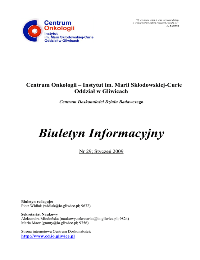 “If we knew what it was we were doing, it would not be called research, would it?” A. Einstein Centrum Onkologii – Instytut im. Marii Skłodowskiej-Curie Oddział w Gliwicach Centrum Doskonałości Działu Badawczego Biuletyn Informacyjny Nr 29; Styczeń 2009 Biuletyn redaguje: Piotr Widłak ([email protected]; 9672) Sekretariat Naukowy Aleksandra Miodońska ([email protected]; 9824) Maria Maor ([email protected]; 9756) Strona internetowa Centrum Doskonałości: http://www.cd.io.gliwice.pl 1. Informacja o zebraniach naukowych. ***************************************************************************** Seminaria Działu Badawczego (czwartki, godzina 9.15, Sala Wykładowa im. Święckiego) 8.01.2009 Dorota Ścieglińska (ZBN): Białko HSPA2 – w poszukiwaniu funkcji. 15.01.2009 Katarzyna Lisowska (ZBN): Rozwój technik biologii molekularnej. 22.01.2009 Joanna Łanuszewska (ZRDK): Szlaki sygnałowe uczestniczace w odpowiedzi na stres. 29.01.2009 Jerzy Hołowiecki (KOK): Terapia wykorzystująca przeszczepianie komórek krwiotwórczych – podstawy biologiczne. ****************************************************************************** Kliniczne Zebrania Naukowe (środy, godzina 8.15, Sala Konsyliarna Przychodni): 7.01.2009 Jerzy Hołowiecki (KOK): Transplantacja szpiku w epoce leczeń celowanych. Sebastian Giebel (KOK): Leczenie wysokodawkowe i immunoterapia komórkowa: dwie drogi do wyleczenia z zastosowaniem transplantacji szpiku. 14.01.2009 Hanna Grzbiela (III KRt): Mozart & Science, czyli są rzeczy na niebie i Ziemi, o których nie śniło się onkologom. 21.01.2009 Aleksandra Hołowiecka-Góral (KOK): Rola polimorfizmów genetycznych w transplantologii szpiku. 28.01.2009 Klinika Chirurgii Onkologicznej Ewa Grzybowska (ZBM): Genetyczne podłoże nowotworów piersi. ****************************************************************************** Redakcja Biuletynu prosi o nadsyłanie informacji dotyczących seminariów i zebrań naukowych odbywających się we wszystkich jednostkach naszego Instytutu. Przypominam, że udział w wykładach, seminariach i zebraniach naukowych należy do podstawowych obowiązków pracowników naukowych [pw]. ****************************************************************************** 2. Rozwój kadry naukowej ******************************************************************************* Stopień doktora nauk uzyskany w roku 2008 Nazwisko i Imię Rok Rada Naukowa Blamek Sławomir 2008 Śląski Uniwersytet Medyczny, Wydział Lekarski w Zabrzu Temat pracy doktorskiej Ocena wyników leczenia naczyniaków tętniczo- żylnych mózgu metodą radiochirurgii stereotaktycznej Grządziel Aleksandra 2008 Uniwersytetu Śląski w Katowicach, Instytut Fizyki im. A.Chełkowskiego Ocena metody weryfikacji planów leczenia w technikach dynamicznych radioterapii z zastosowaniem matryc detektorów półprzewodnikowych Kalinowska_Herok 2008 Magdalena Centrum Onkologii – Instytut, Warszawa Regulacja aktywności nukleazy apoptotycznej białka DFF40/CAD Półtorak Stanisław 2008 Śląski Uniwersytet Medyczny, Wydział Lekarski w Zabrzu Ocena skuteczności skojarzonego leczenia chorych na raka odbytnicy Urbańczyk Hubert 2008 Śląski Uniwersytet Medyczny, Wydział Lekarski w Zabrzu Wyniki konformalnej radioterapii chorych na raka gruczołu krokowego Stopień doktora habilitowanego uzyskany w roku 2008 Nazwisko i Imię Rok Rada Naukowa Lisowska Katarzyna 2008 Centrum Onkologii – Instytut, Warszawa Profil ekspresji genów w raku jajnika: znaczenie dziedzicznej mutacji genu BRCA1 na tle innych cech molekularnych i klinicznych guza Maciejewski Adam 2008 Centrum Onkologii – Instytut, Warszawa Ocena przydatności i skuteczności chirurgii rekonstrukcyjnej i mikronaczyniowej u chorych na zaawansowanego raka dolnego piętra twarzy naciekającego żuchwę Funkcje białek HSP70 i HSF1 w komórkach plemnikotwórczych; badania z wykorzystaniem myszy transgenicznych Widłak Wiesława 2008 Instytut Biologii Doświadczalnej im. M. Nenckiego PAN w Warszawie Włoch Jan 2008 Centrum Onkologii – Instytut, Warszawa Temat pracy habilitacyjnej Postępowanie chirurgiczne w dziedzicznym raku rdzeniastym tarczycy: modyfikacje wynikające z diagnostyki mutacji germinalnych protoonkogenu RET i badania profilu molekularnego guzów Ponadto, w roku 2008 tytuł naukowy profesora nauk medycznych uzyskał Leszek Miszczyk 3. Inne Informacje ********************************************************************************* W dniu 16 grudnia 2008 Rada Naukowa Centrum Onkologii, po przeprowadzeniu kolokwium i wysłuchaniu wykładu habilitacyjnego, przyznała stopień naukowy doktora habilitowanego nauk medycznych naszej koleżance, dr Katarzynie Lisowskiej. Gratulujemy! ************************************************************************************ Minister Nauki i Szkolnictwa Wyższego, w Komunikacie Nr 23 z dnia 28 listopada 2008 r., uzupełnił wykaz punktowanych czasopism naukowych. W uzupełnionym wykazie znalazło się, z ilością punktów 4, czasopismo Onkologia Info (wartość punktowa czasopism w tej części wykazu mieści się w granicach 1 do 6). Gratulujemy! Onkologia Info jest dwumiesięcznikiem wydawanym pod patronatem Zakładu Radioterapii Naszego Instytutu. Redaktorem Naczelnym czasopisma jest prof. Leszek Miszczyk, a Sekretarzem Redakcji dr Wojciech Majewski. Adres internetowy czasopisma: http://www.onkologia.resmedica.pl Redakcja zaprasza potencjalnych autorów prac do współpracy. ************************************************************************************ W dniach 16 i 17 stycznia 2009 Śląski Oddział Polskiego Towarzystwa Onkologicznego organizuje w Ustroniu zebranie naukowo-szkoleniowe poświęcone diagnostytce i wybranym zagadnieniom leczenia chłoniaków. Więcej informacji na stronie: http://www.pto.io.gliwice.pl ************************************************************************************ Przy zakupach oligonukleotydów/starterów reakcji PCR zam