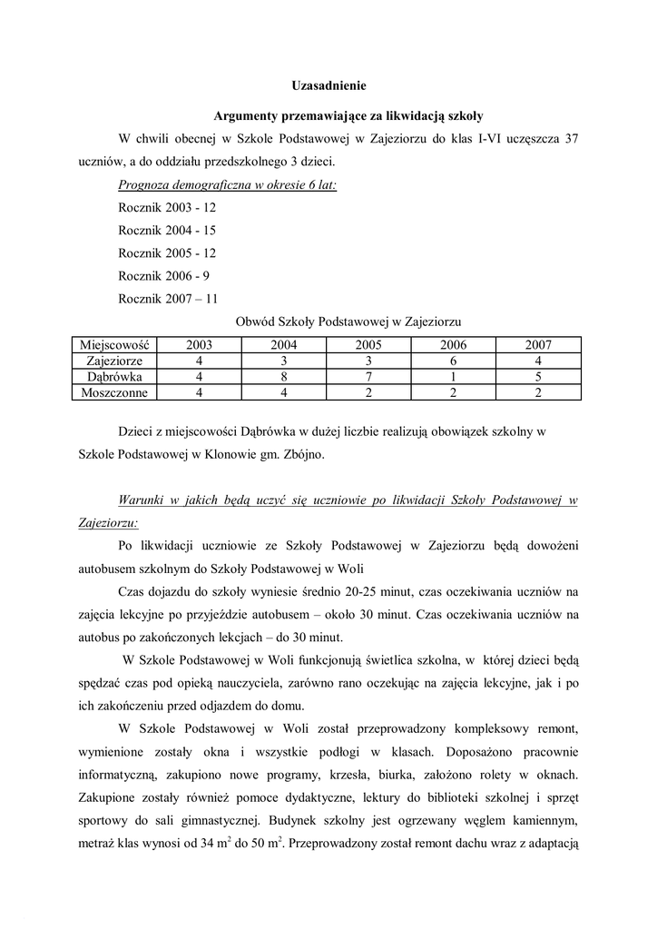 Uzasadnienie Argumenty przemawiające za likwidacją szkoły W chwili obecnej w Szkole Podstawowej w Zajeziorzu do klas I-VI uczęszcza 37 uczniów, a do oddziału przedszkolnego 3 dzieci. Prognoza demograficzna w okresie 6 lat: Rocznik 2003 - 12 Rocznik 2004 - 15 Rocznik 2005 - 12 Rocznik 2006 - 9 Rocznik 2007 – 11 Obwód Szkoły Podstawowej w Zajeziorzu Miejscowość Zajeziorze Dąbrówka Moszczonne 2003 4 4 4 2004 3 8 4 2005 3 7 2 2006 6 1 2 2007 4 5 2 Dzieci z miejscowości Dąbrówka w dużej liczbie realizują obowiązek szkolny w Szkole Podstawowej w Klonowie gm. Zbójno. Warunki w jakich będą uczyć się uczniowie po likwidacji Szkoły Podstawowej w Zajeziorzu: Po likwidacji uczniowie ze Szkoły Podstawowej w Zajeziorzu będą dowożeni autobusem szkolnym do Szkoły Podstawowej w Woli Czas dojazdu do szkoły wyniesie średnio 20-25 minut, czas oczekiwania uczniów na zajęcia lekcyjne po przyjeździe autobusem – około 30 minut. Czas oczekiwania uczniów na autobus po zakończonych lekcjach – do 30 minut. W Szkole Podstawowej w Woli funkcjonują świetlica szkolna, w której dzieci będą spędzać czas pod opieką nauczyciela, zarówno rano oczekując na zajęcia lekcyjne, jak i po ich zakończeniu przed odjazdem do domu. W Szkole Podstawowej w Woli został przeprowadzony kompleksowy remont, wymienione zostały okna i wszystkie podłogi w klasach. Doposażono pracownie informatyczną, zakupiono nowe programy, krzesła, biurka, założono rolety w oknach. Zakupione zostały również pomoce dydaktyczne, lektury do biblioteki szkolnej i sprzęt sportowy do sali gimnastycznej. Budynek szkolny jest ogrzewany węglem kamiennym, metraż klas wynosi od 34 m2 do 50 m2. Przeprowadzony został remont dachu wraz z adaptacją poddasza. Do nowopowstałych pomieszczeń zostały przeniesione: biblioteka, świetlica szkolna, oraz sala komputerowa. Na parterze powstała stołówka i pomieszczenie do wydawania posiłków. Po przyłączeniu uczniów ze Szkoły Podstawowej w Zajeziorzu do Szkoły Podstawowej w Woli klasy będą liczyły: I – 11 II – 32 III – 20 IV – 15 V – 27 VI – 28 Liczba uczniów w Szkole Podstawowej w Woli po zmianie od 1 września 2009 roku wynosić będzie 133 uczniów. Skala zwolnień nauczycieli: Gmina będzie starała się w miarę możliwości zapewnić zatrudnienie nauczycielom. Czynniki ekonomiczne: Znaczący wpływ na likwidację szkoły mają czynniki ekonomiczne. Roczny przybliżony koszt utrzymania ucznia w Szkole Podstawowej w Zajeziorzu w roku 2007wynosił 10007,38 zł.