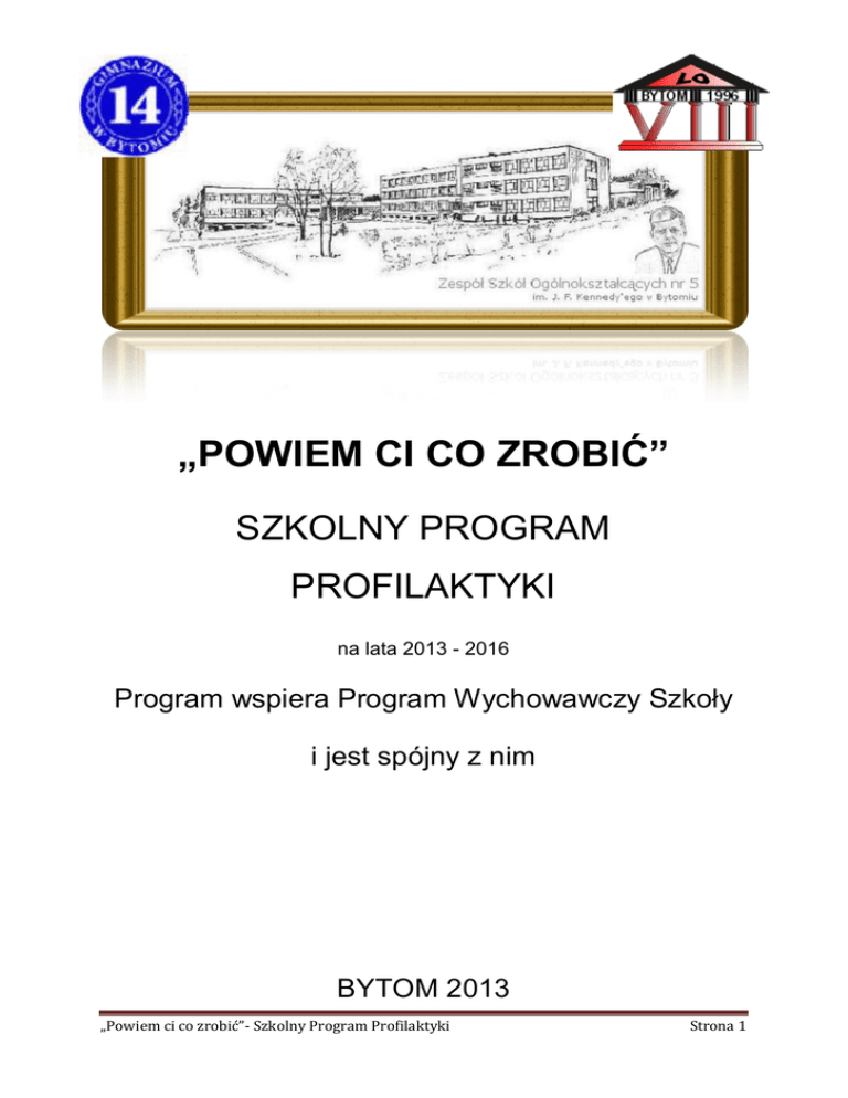 „POWIEM CI CO ZROBIĆ” SZKOLNY PROGRAM PROFILAKTYKI na lata 2013 - 2016 Program wspiera Program Wychowawczy Szkoły i jest spójny z nim BYTOM 2013 „Powiem ci co zrobić”- Szkolny Program Profilaktyki Strona 1 SPIS TREŚCI : 1. Podstawa prawna i odniesienia. 2. Cele programu. 3. Kryteria efektywności programu. 4. Obszary działań. 5. Formy działań. 6. Sposoby diagnozowania problemów profilaktycznych. 7. Metody ewaluacji programu. „Powiem ci co zrobić”- Szkolny Program Profilaktyki Strona 2 I.Podstawy prawne. Ogólne 1. Konwencja o Prawach Dziecka przyjęta przez Zgromadzenie Ogólne Narodów Zjednoczonych dnia 20 listopada 1989 roku, ratyfikowana przez Polskę 30 września 1991 r. (Dz. U. nr 120, poz. 526). W preambule Konwencji podkreśla się, że rodzina będąca naturalnym środowiskiem dzieci powinna być otoczona niezbędną ochroną oraz wsparciem, a dziecko wymaga szczególnej opieki, troski i ochrony prawnej zarówno przed jak i po urodzeniu. Wśród całego katalogu praw dziecka, można wskazać te, które ściślej odnoszą się do profilaktyki. Konwencja (art. 5, art. 27), zgodnie z zasadą pomocniczości, podkreśla, że odpowiedzialność za wychowanie dziecka i kierowanie nim w sposób odpowiadający rozwijającym się zdolnościom dziecka spoczywa głównie na rodzinie oraz akcentuje poszanowanie państwa dla tego prawa. Dalej mówi się o ochronie dziecka przed bezprawną ingerencją w sferę jego życia rodzinnego lub domowego (art. 16), o pomocy rodzinie w wykonywaniu obowiązków wychowawczych poprzez zapewnienie odpowiednich instytucji i usług (art. 18), oświaty zdrowotnej i poradnictwa (art. 24), programów socjalnych (art. 19). Konwencja zwraca uwagę na zapewnienie w możliwie maksymalnym zakresie warunków życia i rozwoju dziecka (art. 6). Wiąże się z tym prawo dziecka do kontaktu i więzi z obojgiem rodziców (art. 9), a także ochrona dziecka przed krzywdzeniem: przemocą fizyczną, psychiczną, wykorzystaniem seksualnym, zaniedbaniem, wyzyskiem (art. 19). Podkreśla się uznanie prawa „każdego dziecka do poziomu życia odpowiadającego jego rozwojowi fizycznemu, psychicznemu, duchowemu, moralnemu i społecznemu”. Przy istotnym dla profilaktyki budowaniu samorządności i demokracji szkolnej warto pamiętać o artykułach: 12, 13, 14 i 16 zobowiązujących państwo do zapewnienia dziecku „swobodnego wyrażania własnych poglądów we wszystkich sprawach dotyczących dziecka” stosownie do jego wieku oraz dojrzałości, do swobodnego wypowiadania się oraz swobody myśli, sumienia, wyznania, a także ochrony przed bezprawną ingerencją w sferę jego życia prywatnego oraz przed godzeniem w jego honor. Do artykułów od 12 do 16 Polska złożyła deklaracje, że wykonanie określonych w nich praw dziecka „dokonuje się z poszanowaniem władzy rodzicielskiej, zgodnie z polskimi zwyczajami i tradycjami dotyczącymi miejsca dziecka w rodzinie i poza rodziną”. 2. Konstytucja Rzeczypospolitej Polskiej z dnia 2 kwietnia 1997 r. (Dz. U. nr 78, poz. 483). „Każdy ma prawo do ochrony prawnej życia prywatnego, rodzinnego, czci i dobrego imienia do decydowania o swoim życiu osobistym.” (art. 47) „Rodzice mają prawo do wychowywania dzieci zgodnie z własnymi przekonaniami. Wychowanie to powinno uwzględniać stopień dojrzałości dziecka, a także wolność jego sumienia i wyznania oraz jego przekonania.” (art. 48) „Powiem ci co zrobić”- Szkolny Program Profilaktyki Strona 3 „Rodzice mają prawo do zapewnienia dzieciom wychowania i nauczania moralnego i religijnego zgodnie ze swoimi przekonaniami." (art. 53 ust. 3) „Władze publiczne są obowiązane do zapewnienia szczególnej opieki zdrowotnej dzieciom...” (art. 68) „Każdy ma prawo do nauki. Nauka do 18 roku życia jest obowiązkowa. Sposób wykonania obowiązku szkolnego określa ustawa. Nauka w szkołach publicznych jest bezpłatna.” (art. 70, ust. 1,2) „Władze publiczne zapewniają obywatelom powszechny i równy dostęp do wykształcenia. W tym celu tworzą i wspierają systemy indywidualnej pomocy finansowej i organizacyjnej dla uczniów i studentów. Warunki udzielania pomocy określa ustawa.” (art. 70, ust. 4) „Rzeczpospolita Polska zapewnia ochronę praw dziecka. Każdy ma prawo żądać od organów władzy publicznej ochrony dziecka przed przemocą, okrucieństwem, wyzyskiem i demoralizacją.” (art. 72, ust. 1) „Zadania publiczne służące zaspokajaniu potrzeb wspólnoty samorządowej są wykonywane przez jednostkę samorządu terytorialnego jako zadanie własne.” (art. 166) Prawo oświatowe 1 Ustawa o systemie oświaty ze zmianami wynikającymi z ustawy z dnia 19 marca 2009 r. o zmianie ustawy o systemie oświaty oraz o zmianie niektórych innych ustaw (Dz.U. nr 56, poz. 458) Zapis w preambule ustawy określa - "Szkoła winna zapewnić każdemu uczniowi warunki niezbędne do jego rozwoju...". Dla działań profilaktycznych duże znaczenie mogą mieć niektóre z tych warunków sprecyzowanych w art. 1: · treści, metody i organizacja nauczania powinny być dostosowane do możliwości psychofizycznych uczniów; a wychowanie i opieka powinny być odpowiednie do wieku i osiągniętego rozwoju( art.1 § 4 ) · szkoła powinna wspomagać wychowawczą rolę rodziny( art.1 § 2 ); · utrzymywanie bezpiecznych i higienicznych warunków nauki, wychowania i opieki w szkołach ( art.1 § 10 ); · należy zapewnić uczniom możliwość korzystania z pomocy psychologicznej i specjalnych form pracy dydaktycznej( art.1 § 4 ); · system oświaty zapewnia możliwość pobierania nauki we wszystkich typach szkół przez dzieci i młodzież niepełnosprawną i niedostosowaną społecznie(art.1 § 5); · zapewnia opiekę nad uczniami ze znacznymi lub sprzężonymi dysfunkcjami poprzez umożliwianie realizowania indywidualnych form i programów nauczania ( art.1 § 5a ); · opiekę uczniom pozostającym w trudnej sytuacji materialnej i życiowej (art. 1 §