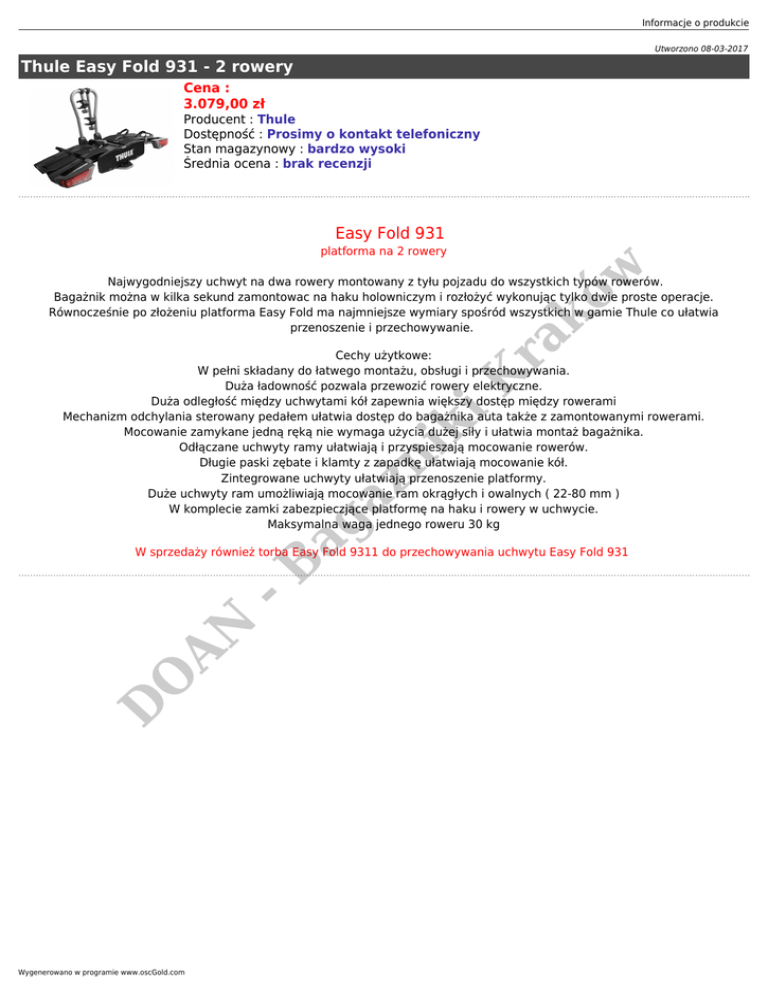 Informacje o produkcie Utworzono 08-03-2017 Thule Easy Fold 931 - 2 rowery Cena : 3.079,00 zł Producent : Thule Dostępność : Prosimy o kontakt telefoniczny Stan magazynowy : bardzo wysoki Średnia ocena : brak recenzji Easy Fold 931 ra kó w platforma na 2 rowery Najwygodniejszy uchwyt na dwa rowery montowany z tyłu pojzadu do wszystkich typów rowerów. Bagażnik można w kilka sekund zamontowac na haku holowniczym i rozłożyć wykonując tylko dwie proste operacje. Równocześnie po złożeniu platforma Easy Fold ma najmniejsze wymiary spośród wszystkich w gamie Thule co ułatwia przenoszenie i przechowywanie. -B ag aż n ik i K Cechy użytkowe: W pełni składany do łatwego montażu, obsługi i przechowywania. Duża ładowność pozwala przewozić rowery elektryczne. Duża odległość między uchwytami kół zapewnia większy dostęp między rowerami Mechanizm odchylania sterowany pedałem ułatwia dostęp do bagażnika auta także z zamontowanymi rowerami. Mocowanie zamykane jedną ręką nie wymaga użycia dużej siły i ułatwia montaż bagażnika. Odłączane uchwyty ramy ułatwiają i przyspieszają mocowanie rowerów. Długie paski zębate i klamty z zapadkę ułatwiają mocowanie kół. Zintegrowane uchwyty ułatwiają przenoszenie platformy. Duże uchwyty ram umożliwiają mocowanie ram okrągłych i owalnych ( 22-80 mm ) W komplecie zamki zabezpieczjące platformę na haku i rowery w uchwycie. Maksymalna waga jednego roweru 30 kg D O AN W sprzedaży również torba Easy Fold 9311 do przechowywania uchwytu Easy Fold 931 Wygenerowano w programie www.oscGold.com