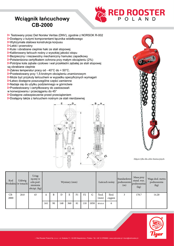 Wciągnik łańcuchowy CB-2000 Testowany przez Det Norske Veritas (DNV), zgodnie z NORSOK R-002 Dostępny z kutymi komponentami łącznika widełkowego Wytrzymała stalowa konstrukcja korpusu Lekki i przenośny Kute i obrabiane cieplnie haki ze stali stopowej Kalibrowany łańcuch nośny z wysokiej jakości stopu Bezpieczny i niezawodny mechaniczny hamulec zapadkowy Potwierdzona certyfikatem ochrona przy małym obciążeniu (2%) Potrójne koła zębate czołowe i wał przekładni zębatej ze stali stopowej są obrabiane cieplnie Zakres temperatur pracy od - 40°C do + 50°C. Przetestowany przy 1,5-krotnym obciążeniu znamionowym Może być przykuty łańcuchem w wypadku specyficznych wymagań Łatwo dostępne poszczególne części zamienne Nadaje się do użytku podziemnego w górnictwie Przetestowany i certyfikowany do zastosowań w konwojowaniu i przeciąganiu do 45° Dostępne zabezpieczenie przed przeciążeniem Dostępny także z łańcuchem nośnym ze stali nierdzewnej Zdjęcie tylko dla celów ilustracyjnych Uciąg ręczny w Kod Udźwig celu podProduktu (w tonach) niesienia obciąż. (kg) CB2000 20.0 43 Wymiary (mm) Łańcuch nośny A B D E F1 F2 G Śred. (mm) Ilość cięgien 161 90 148 360 81 110 1050 Ø10.0 6 Masa przy Standardowe Waga dod. metra stand. wys. podnoszenie podnoszenia podnoszenia (m) (kg) (kg) 3 178.7 14.20 ▪ Red Rooster Poland Sp. z o.o. ▪ ul. Grabska 11 ▪ 32-005 Niepołomice ▪ Polska ▪ Tel: +48 12 2785666 ▪ www.redrooster.pl ▪ [email protected] ▪ 1