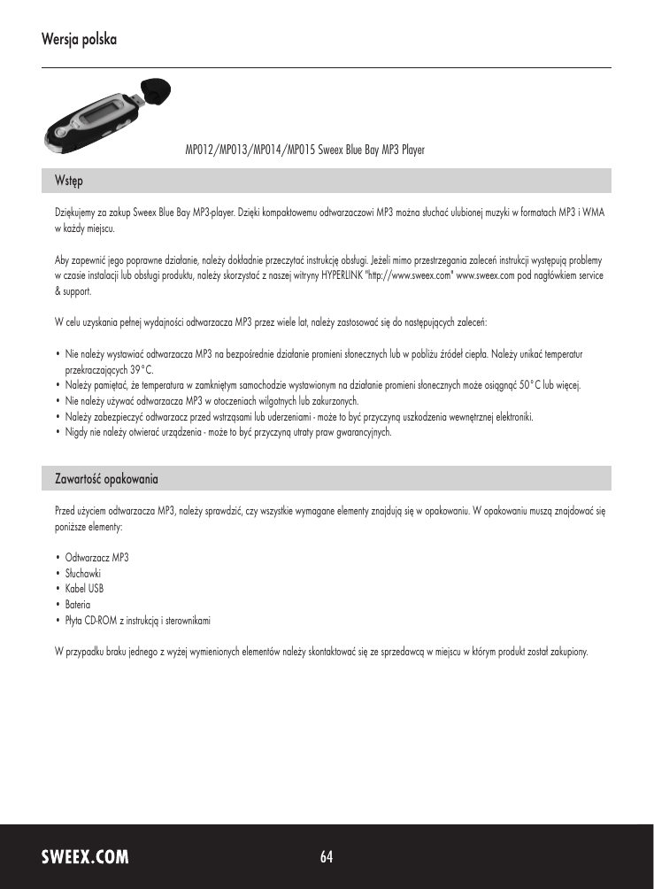 Wersja polska MP012/MP013/MP014/MP015 Sweex Blue Bay MP3 Player Wstęp Dziękujemy za zakup Sweex Blue Bay MP3-player. Dzięki kompaktowemu odtwarzaczowi MP3 można słuchać ulubionej muzyki w formatach MP3 i WMA w każdy miejscu. Aby zapewnić jego poprawne działanie, należy dokładnie przeczytać instrukcję obsługi. Jeżeli mimo przestrzegania zaleceń instrukcji występują problemy w czasie instalacji lub obsługi produktu, należy skorzystać z naszej witryny HYPERLINK "http://www.sweex.com" www.sweex.com pod nagłówkiem service & support. W celu uzyskania pełnej wydajności odtwarzacza MP3 przez wiele lat, należy zastosować się do następujących zaleceń: •Nie należy wystawiać odtwarzacza MP3 na bezpośrednie działanie promieni słonecznych lub w pobliżu źródeł ciepła. Należy unikać temperatur przekraczających 39°C. •Należy pamiętać, że temperatura w zamkniętym samochodzie wystawionym na działanie promieni słonecznych może osiągnąć 50°C lub więcej. •Nie należy używać odtwarzacza MP3 w otoczeniach wilgotnych lub zakurzonych. •Należy zabezpieczyć odtwarzacz przed wstrząsami lub uderzeniami - może to być przyczyną uszkodzenia wewnętrznej elektroniki. •Nigdy nie należy otwierać urządzenia - może to być przyczyną utraty praw gwarancyjnych. Zawartość opakowania Przed użyciem odtwarzacza MP3, należy sprawdzić, czy wszystkie wymagane elementy znajdują się w opakowaniu. W opakowaniu muszą znajdować się poniższe elementy: •Odtwarzacz MP3 •Słuchawki •Kabel USB •Bateria •Płyta CD-ROM z instrukcją i sterownikami W przypadku braku jednego z wyżej wymienionych elementów należy skontaktować się ze sprzedawcą w miejscu w którym produkt został zakupiony. 64 Wersja polska Dane techniczne •Pamięć Flash MP012: 256 MB •Pamięć Flash MP013: 512 MB •Pamięć Flash MP014: 1 GB •Pamięć Flash MP015: 2 GB •Obsługuje: Pliki MP3 i WMA •Interfejs: USB 2.0 •Opcja 5-pasmowego korektora •Nagrywanie dźwięku do pliku WAV •Wbudowany mikrofon •Maks. moc wyjściowa: 2 x 5,0 mW •Rozmiar ekranu LCD: 27 x 10 mm •Obsługuje: Windows 98SE, 2000 i XP •Dodatkowe dane techniczne •Częstotliwość wyjściowa: 20 Hz ~ 20 KHz •Bateria 1 x AAA 1,5V •Współczynnik S/N: 86 dB •Wymiary: 95 x 31 x 23 mm (d x sz x w) •Waga: 34 gramy (bez baterii) Rysunek urządzenia 65 Wersja polska Instalacja baterii Odtwarzacz MP3 Sweex używa baterii 1,5 V AAA. W celu zamontowania baterii należy postępować zgodnie z poniższymi instrukcjami: zdjąć pokrywę USB i ustawić pokrywę baterii z tyłu odtwarzacza MP3 - w dół. Włożyć baterię i wsunąć pokrywę baterii z powrotem w gniazdo. Założyć pokrywę USB. Podłączenie odtwarzacza MP3 do komputera Korzyści z połączenia USB 2.0 dla odtwarzacza MP3 Sweex. Oznacza to, że odtwarzacz MP3 można podłączyć bezpośrednio w Windows 2000 lub Windows XP. Odtwarzacz MP3 Sweex zostanie rozpoznany jako dodatkowy napęd dysku. W Windows, można w łatwy sposób skopiować lub usunąć z odtwarzacza pliki MP3 lub WMA. W celu użycia w Windows 98SE, należy najpierw zainstalować dostarczony sterownik. Instalacja w Windows 98SE została opisana poniżej. Po podłączeniu i rozpoznaniu odtwarzacza MP3 przez komputer, tekst USB pojawi się na wyświetlaczu odtwarzacza MP3. Oznacza to, że odtwarzacz MP3 jest gotowy do użycia. Na ekranie komputera pojawi się dodatkowa litera oznaczająca dysk (patrz poniższy rysunek). Litera oznaczająca dysk przydzielona do odtwarzacza MP3 Sweex może być inna od tej przedstawionej na rysunku powyżej. Instalacja sterownika w Windows 98SE Uwaga! Przed podłączeniem odtwarzacza MP3 do komputera należy zainstalować oprogramowanie w Windows 98SE. Włożyć płytę instalacyjną oprogramowania do napędu CD-ROM. Wybrać instalację sterownika Windows 98SE i postępować zgodnie z instrukcjami pojawiającymi się na ekranie. W celu zakończenia instalacji, należy zrestartować komputer. Po zrestartowaniu komputera, można podłączyć odtwarzacza MP3 Sweex, zostanie on rozpoznany jako oddzielny sterownik w Windows 98SE. 66 Wersja polska Włączanie i wyłączanie odtwarzacza MP3 Nacisnąć i przytrzymać przycisk Odtwarzaj/Pauza (Play/Pause button) przez 2 sekundy w celu włączenia odtwarzacza MP3 Sweex. Tekst “Sweex” pojawi się na wyświetlaczu. Po upływie 2 sekund pojawi się główne menu z szczegółowym informacjami, oprócz tego wyświetli się liczba utworów, ustawienia korektora, status baterii i czas odtwarzania wybranego utworu. Aby wyłączyć odtwarzacz MP3, należy nacisnąć i przytrzymać przycisk Odtwarzaj/Pauza (Play/Pause button) przez 2 sekundy. Tekst “Przytrzymaj, aby wyłączyć zasilanie” (Continue holding to power off) pojawi się na wyświetlaczu. Przed zwolnieniem przycisku należy odczekać do momentu wyświetlenia całego paska postępu. Odtwarzanie muzyki Po włączeniu odtwarzacza MP3, krótko nacisnąć przycisk Odtwarzaj/Pauza (Play/Pause button) w celu rozpoczęcia odtwarzania. Można odtwarzać inne pliki muzyczne naciskając przycisk trybu (mode) w prawo lub w lewo. Krótko nacisnąć przycisk Odtwarzaj/Pauza(Play/Pause button) , aby wstrzymać odtwarzanie. Krótko nacisnąć ponownie przycisk Odtwarzaj/Pauza (Play/ Pause button) , aby wznowić odtwarzanie. Menu Nacisnąć przycisk (menu) w celu uzyskania do niego dostępu. Przesuwając przycisk menu (menu) w prawo lub w lewo można przewijać przez opcje menu. Krótko nacisnąć przycisk menu (menu), aby wybrać opcję. Aby wyjść z menu, ponownie nacisnąć i przytrzymać przycisk przez 2 sekundy. Przycisk można nacisnąć z dowolnego miejsca menu. Opcje menu: Music - Voice - Record - Set - Erase - About - Exit Muzyka = Odtwarzanie plików muzycznych. Głos = Odtwarzanie nagrań, które zostały zapisane za pomocą funkcji Record. Record = Nagrywanie głosu. Można zapisać wiele nagrań. 67 Wersja polska Set = EQ - Playmode -