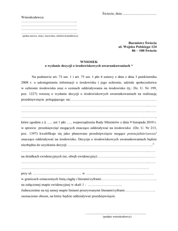 Świecie, dnia ...................................... Wnioskodawca: ……………………………………….. ……………………………………….. ……………………………………….. ……………………………………….. (pełna nazwa, imię i nazwisko, telefon kontaktowy) Burmistrz Świecia ul. Wojska Polskiego 124 86 – 100 Świecie WNIOSEK o wydanie decyzji o środowiskowych uwarunkowaniach * Na podstawie art. 73 ust. 1 i art. 75 ust. 1 pkt 4 ustawy z dnia z dnia 3 października 2008 r. o udostępnianiu informacji o środowisku i jego ochronie, udziale społeczeństwa w ochronie środowiska oraz o ocenach oddziaływania na środowisko (tj.: Dz. U. Nr 199, poz. 1227) wnoszę o wydanie decyzji o środowiskowych uwarunkowaniach na realizację przedsięwzięcia polegającego na:……………………………………………………………… ……………………………………………………………………………………………...…… ……………………………………………………………………………………………...…… …………………………………………………………………………………………..………, które zgodnie z § ….. ust 1 pkt ….. rozporządzenia Rady Ministrów z dnia 9 listopada 2010 r. w sprawie przedsięwzięć mogących znacząco oddziaływać na środowisko (Dz. U. Nr 213, poz. 1397) kwalifikuje się jako planowane przedsięwzięcie mogące potencjalnie/zawszei znacząco oddziaływać na środowisko. Decyzja o środowiskowych uwarunkowaniach będzie niezbędna do uzyskania decyzji ……………………………………………………………...ii ……………………………………………………………………………………………..…… na działkach ewidencyjnych (nr, obręb ewidencyjny) ………………………………………… ……………………………………………………………………………………………..…… ………………………………………………………………………………………….…. przy ul. ………………………………….. w ………………………………………………… w granicach oznaczonych linią ciągłą i literami/cyframi……………………………………….. na załączonej mapie ewidencyjnej w skali 1 : ……………………….. Jednocześnie na tej samej mapie liniami przerywanymi literami/cyframi…………………….. zaznaczono obszar, na który będzie oddziaływać przedsięwzięcie. …................................................................ (podpis wnioskodawcy) Załączniki: 1. Karta informacyjna przedsięwzięcia (3 egzemplarze + forma elektroniczna) lub raport o oddziaływaniu przedsięwzięcia na środowisko (3 egzemplarze + forma elektroniczna)iii; 2. Poświadczona przez właściwy organ kopia mapy ewidencyjnej obejmująca przewidywany teren, na którym będzie realizowane przedsięwzięcie, oraz obejmująca obszar, na który będzie ono oddziaływać lub mapa sytuacyjno wysokościowa w skali umożliwiającej szczegółowe przedstawienie przebiegu granic terenu, na którym zaplanowano przedsięwzięcie, oraz obejmującą obszar na który będzie ono oddziaływaćiv; 3. wypis z ewidencji gruntów obejmujący przewidywany teren, na którym będzie realizowane przedsięwzięcie oraz obszar, na który będzie ono oddziaływać. 4. wypis i wyrys z miejscowego planu zagospodarowania przestrzennego albo informacja o barku takiego planuv UWAGA! Niekompletnie wypełniony wniosek o wydanie decyzji środowiskowej nie będzie rozpatrywany. Wniosek winien być wypełniony czytelnie i w całości. Wniosek winien zawierać informacje wg najlepszej wiedzy składającego wniosek. i W przypadku przedsięwzięć wymienionych w § 3 ww. rozporządzenia należy wybrać pierwszą opcję: potencjalnie. Dla przedsięwzięć wymienionych w § 2 ww. rozporządzenia przeznaczono drugą opcję: zawsze. ii Należy tu wskazać rodzaj decyzji, o której mowa w art. 72 ust 1 ustawy ooś, które będą wymagać decyzji o środowiskowych uwarunkowaniach. iii Z reguły kartę informacyjną przedsięwzięcia załącza się do wniosku dla przedsięwzięć mogących potencjalnie znacząco oddziaływać na środowisko (wymienionych w § 3 ww. rozporządzenia) zaś raport będzie składany razem z wnioskiem tylko dla przedsięwzięć mogących zawsze znacząco oddziaływać na środowisko (wymienionych w § 2 ww. rozporządzenia). iv Mapa sytuacyjno wysokościowa będzie dołączana tylko dla przedsięwzięć ubiegających się o koncesje geologiczne lub decyzje określające szczegółowe warunki wydobywania kopaliny - prowadzonych w granicach przestrzeni niestanowiących części składowych nieruchomości gruntowych oraz przedsięwzięć dotyczących urządzeń piętrzących I, II i III klasy budowli, zaś mapa ewidencyjna stanowi załącznik do wniosków o decyzje o środowiskowych uwarunkowaniach dla pozostałych przedsięwzięć. v Wyrys i wypis z planu lub informacja o jego braku będzie załączana do wniosku tylko w przypadku przedsięwzięć, dla których organem prowadzącym postępowanie będzie regionalny dyrektor ochrony środowiska (poza drogami publicznymi, liniami kolejowymi o znaczeniu państwowym, przedsięwzięciami EURO 2012, przedsięwzięciami wymagającymi koncesji na poszukiwanie i rozpoznawanie złóż kopalin, inwestycji w zakresie terminalu oraz inwestycji związanych z regionalnymi sieciami szerokopasmowymi).