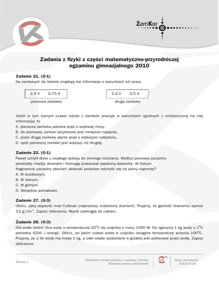 © Copyright by ZamKor P. Sagnowski i Wspólnicy sp. j. ul. Tetmajera 19, 31-352 Kraków tel. +48 12 623 25 00 faks +48 12 623 25 24 e-mail: [email protected] adres ser wisu: www.zamkor.pl wspólny cel... Zadania z fizyki z czêœci matematyczno-przyrodniczej egzaminu gimnazjalnego 2010 Zadanie 21. (0-1) Na ¿arówkach do latarek znajduj¹ siê informacje o warunkach ich pracy. 2,4 V 0,75 A pierwsza ¿arówka 2,4 V 0,5 A druga ¿arówka Je¿eli w tym samym czasie ka¿da z ¿arówek pracuje w warunkach zgodnych z umieszczon¹ na niej informacj¹, to A. pierwsza ¿arówka pobiera pr¹d o wiêkszej mocy. B. do pierwszej ¿arówki przy³o¿one jest mniejsze napiêcie. C. przez drug¹ ¿arówkê p³ynie pr¹d o wiêkszym natê¿eniu. D. opór pierwszej ¿arówki jest wiêkszy ni¿ drugiej. Zadanie 22. (0-1) Pawe³ uchyli³ drzwi z ciep³ego pokoju do zimnego korytarza. Wzd³u¿ pionowej szczeliny powsta³ej miêdzy drzwiami i framug¹ przesuwa³ zapalon¹ œwieczkê. W którym fragmencie szczeliny p³omieñ œwieczki powinien odchyliæ siê od pionu najmniej? A. W œrodkowym. B. W dolnym. C. W górnym. D. Wszêdzie jednakowo. Zadanie 27. (0-3) Oblicz, jak¹ objêtoœæ mia³ Cullinan (najwiêkszy znaleziony diament). Przyjmij, ¿e gêstoœæ diamentu wynosi 3,2 g cm 3 . Zapisz obliczenia. Wynik zaokr¹glij do ca³oœci. Zadanie 28. (0-3) Ola wla³a æwieræ litra wody o temperaturze 20oC do czajnika o mocy 1000 W. Do ogrzania 1 kg wody o 1oC potrzeba 4200 J energii. Oblicz, po jakim czasie woda w czajniku osi¹gnie temperaturê wrzenia 100oC. Przyjmij, ¿e 1 litr wody ma masê 1 kg, a ca³e ciep³o wydzielane w grza³ce jest pobierane przez wodê. Zapisz obliczenia. Strona 1 Dokument zosta³ pobrany z serwisu ZamKor. Wszelkie prawa zastrze¿one. ZamKor Data utworzenia: 2010-05-26 © Copyright by ZamKor P. Sagnowski i Wspólnicy sp. j. ul. Tetmajera 19, 31-352 Kraków tel. +48 12 623 25 00 faks +48 12 623 25 24 e-mail: [email protected] adres ser wisu: www.zamkor.pl wspólny cel... Informacje do zadañ 29. i 30. Pracownik ochrony chodzi wzd³u¿ ogrodzenia parkingu (w kszta³cie trapezu prostok¹tnego) ze sta³¹ prêdkoœci¹ 1 m/s. Obchód zaczyna od wartowni A. Na rysunku przedstawiono plan jego trasy, a obok podano wymiary parkingu. D C F AB = 125 m BC = 65 m CD = 100 m AD = 60 m F B A Zadanie 29. (0-2) Minê³o 10 minut od chwili rozpoczêcia obchodu. Na którym odcinku znajduje siê pracownik ochrony? Zapisz obliczenia. Informacje do zadañ 33. i 34. Roœliny wbudowuj¹ w swoje tkanki zarówno wêgiel 12 C, jak i promieniotwórczy wêgi 14 C. Na skutek samoistnego rozpadu 14 C jeden gram wêgla w ¿ywym drzewie emituje oko³o 16 cz¹stek beta na minutê. Kiedy roœlina obumiera, proces przyswajania wêgla ustaje i zawartoœæ izotopu 14 C w jej tkankach zaczyna maleæ. Czas po³owicznego rozpadu wêgla 14 C wynosi 5700 lat. Na wykresie przedstawiono, jak zmienia³a siê emisja cz¹stek beta ze 100 g wêgla w ci¹gu 23 000 lat po obumarciu drzewa. Liczba cz¹stek beta emitowanych przez 100 g wêgla na minutê w zale¿noœci od czasu, jaki up³yn¹³ od chwili obumarcia drzewa Strona 2 Dokument zosta³ pobrany z serwisu ZamKor. Wszelkie prawa zastrze¿one. ZamKor Data utworzenia: 2010-05-26 Zadanie 33. (0-1) Sto gramów wêgla zawartego w drewnie ze szcz¹tków prehistorycznych narzêdzi emituje 500 cz¹stek beta na minutê. Ile tysiêcy lat temu obumar³o drzewo, z którego wykonano te narzêdzia? Zadanie 34. (0-1) Przedstaw, uzupe³niaj¹c tabelê, jak zmienia³a siê emisja cz¹stek beta z 50 g wêgla w ci¹gu 17 100 lat od chwili obumarcia drzewa. Czas od chwili obumarcia drzewa w latach 0 5 700 Liczba cz¹stek beta wyemitowanych przez 50 g wêgla w ci¹gu minuty Strona 3 Dokument zosta³ pobrany z serwisu ZamKor. Wszelkie prawa zastrze¿one. 11 400 17 100 100 Data utworzenia: 2010-05-26 Rozwi¹zania zadañ z fizyki z czêœci matematyczno-przyrodniczej egzaminu gimnazjalnego 2010 Zadanie 21. (0-1) Moc urz¹dzenia wyra¿a siê wzorem P = UI Na tej podstawie wnioskujemy, ¿e pierwsza ¿arówka pracuje z wieksz¹ moc¹. OdpowiedŸ poprawna A. Zadanie 22. (0-1) Zadanie dotyczy zjawiska konwekcji. Jest to sposób transportu energii, któremu towarzyszy transport masy gazu lub cieczy. Gêstoœæ zimnego powietrza w korytarzu jest wiêksza od gêstoœci ciep³ego powietrza w pokoju. Przy pod³odze powietrze z korytarza przemieszcza siê do pokoju (tak, jak w zimie powietrze przez uchylone okno wp³ywa do pokoju i ch³odzi nasze stopy). P³omieñ umieszczonej tam œwieczki jest odchylony w stronê pokoju. Powietrze, wp³ywaj¹ce z korytarza jest ogrzewane, rozszerza siê, jego gêstoœæ maleje i zgodnie z prawem Archimedesa unosi siê w górê. Pod sufitem ciep³e powietrze przemieszcza siê do korytarza. P³omieñ umieszczonej pod sufitem œwieczki odchyla siê w stronê korytarza. Najwiêksza szansa na to, ¿e p³omieñ ustawi siê pionowo jest w œrodkowej czêœci szczeliny. OdpowiedŸ poprawna A. Zadanie 27. (0-3) Do rozwi¹zania tego zadania nale¿y skorzystaæ z „Informacji do zadañ 25–27”. g Dane: m = 3106× 0,2 g = 621,2 g, r = 3,2 cm 3 Szukane: V Rozwi¹zanie: m m sk¹d V = r= V r 621,2 g » 194 cm 3 g 3,2 cm 3 OdpowiedŸ: Cullinan mia³ objêtoœæ oko³o 194 cm 3 . V= Strona 4 Dokument zosta³ pobrany z serwisu ZamKor. Wszelkie prawa zastrze¿one. Data utworzenia: 2010-05-26 Zadanie 28. (0-3) Sposób rozwi¹zania zadania zale¿y od tego, czy uczeñ pozna³ w gimnazjum i rozumie pojêcie ciep³a w³aœciwego. Jeœli tak, to potrafi³ na podstawie tematu zadania wywnioskowaæ, ¿e ciep³o w³aœciwe wody wynosi J . Pozosta³e dane to: c w = 4200 kg×° C 1 kg, Dt = 100° C - 20° C = 80° C, P = 1000 W 4 Szukane: czas ogrzewania t Rozwi¹zanie: Praca W = P t wykonana przez pr¹d elektryczny p³yn¹cy w grza³ce czajnika powoduje wzrost energii wewnêtrznej DE w grza³ki. Na skutek ró¿nicy temperatur pomiêdzy grza³k¹ i wod¹, zostaje wodzie przekazane ciep³o: m= Q = DE 