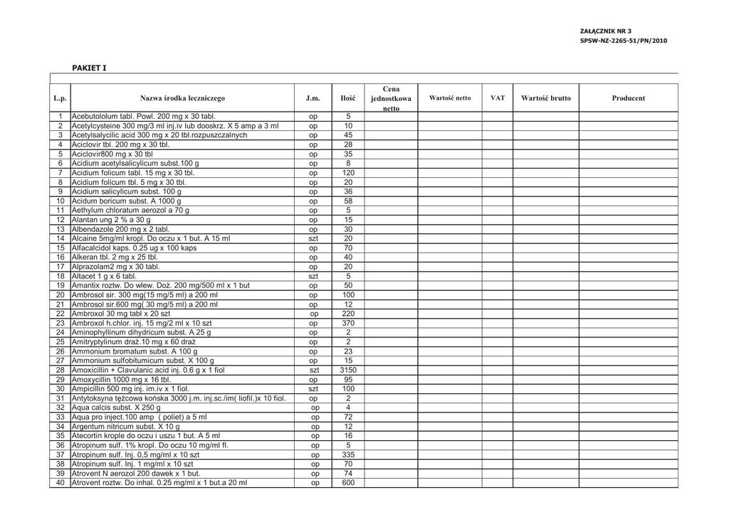 ZAŁĄCZNIK NR 3 SPSW-NZ-2265-51/PN/2010 PAKIET I L.p. 1 2 3 4 5 6 7 8 9 10 11 12 13 14 15 16 17 18 19 20 21 22 23 24 25 26 27 28 29 30 31 32 33 34 35 36 37 38 39 40 Nazwa środka leczniczego Acebutololum tabl. Powl. 200 mg x 30 tabl. Acetylcysteine 300 mg/3 ml inj.iv lub dooskrz. X 5 amp a 3 ml Acetylsalycilic acid 300 mg x 20 tbl.rozpuszczalnych Aciclovir tbl. 200 mg x 30 tbl. Aciclovir800 mg x 30 tbl Acidium acetylsalicylicum subst.100 g Acidium folicum tabl. 15 mg x 30 tbl. Acidium folicum tbl. 5 mg x 30 tbl. Acidium salicylicum subst. 100 g Acidum boricum subst. A 1000 g Aethylum chloratum aerozol a 70 g Alantan ung 2 % a 30 g Albendazole 200 mg x 2 tabl. Alcaine 5mg/ml kropl. Do oczu x 1 but. A 15 ml Alfacalcidol kaps. 0.25 ug x 100 kaps Alkeran tbl. 2 mg x 25 tbl. Alprazolam2 mg x 30 tabl. Altacet 1 g x 6 tabl. Amantix roztw. Do wlew. Doż. 200 mg/500 ml x 1 but Ambrosol sir. 300 mg(15 mg/5 ml) a 200 ml Ambrosol sir.600 mg( 30 mg/5 ml) a 200 ml Ambroxol 30 mg tabl x 20 szt Ambroxol h.chlor. inj. 15 mg/2 ml x 10 szt Aminophyllinum dihydricum subst. A 25 g Amitryptylinum draż.10 mg x 60 draż Ammonium bromatum subst. A 100 g Ammonium sulfobitumicum subst. X 100 g Amoxicillin + Clavulanic acid inj. 0.6 g x 1 fiol Amoxycillin 1000 mg x 16 tbl. Ampicillin 500 mg inj. im.iv x 1 fiol. Antytoksyna tężcowa końska 3000 j.m. inj.sc./im( liofil.)x 10 fiol. Aqua calcis subst. X 250 g Aqua pro inject.100 amp ( poliet) a 5 ml Argentum nitricum subst. X 10 g Atecortin krople do oczu i uszu 1 but. A 5 ml Atropinum sulf. 1% kropl. Do oczu 10 mg/ml fl. Atropinum sulf. Inj. 0,5 mg/ml x 10 szt Atropinum sulf. Inj. 1 mg/ml x 10 szt Atrovent N aerozol 200 dawek x 1 but. Atrovent roztw. Do inhal. 0.25 mg/ml x 1 but.a 20 ml J.m. Ilość op op op op op op op op op op op op op szt op op op szt op op op op op op op op op szt op szt op op op op op op op op op op 5 10 45 28 35 8 120 20 36 58 5 15 30 20 70 40 20 5 50 100 12 220 370 2 2 23 15 3150 95 100 2 4 72 12 16 5 335 70 74 600 Cena jednostkowa netto Wartość netto VAT Wartość brutto Producent 41 42 43 44 45 46 47 48 49 50 51 52 53 54 55 56 57 58 59 60 61 62 63 64 65 66 67 68 69 70 71 72 73 74 75 76 77 78 79 80 81 82 83 84 85 86 87 88 89 Azathioprine 50 mg x 50 tbl. Baclofen 10 mg x 50 tbl. Baclofen 25 mg x 50 tbl Balsamum peruvianum subst. X 100 g Benzocainum subst. A 25 g Benzyna apteczna płyn x 1000 ml Berodual N aer.wziew. ( 200 dawek) Berodual płyn do inh.x 1 but. A 20 ml Betahistine dihydrochloride 24 mg x 20 tabl Betahistine dihydrochloride 8 mg x 100 tabl Bisacodyl 5 mg x 30 tabl Bisoprolol 2.5 mg x 28 tabl Bisoprolol 1.25 mg x 28 tabl Bisoprololum fumarate tbl. 10 mg x 30 tbl. Bisoprolum fumarate 5 mg x 60 tabl. Bleomycin sulfate inj. 15 mg x 1 fiol. Bromhexine 8 mg x 40 tabl Bromocriptine tabl. 2,5 mg x 30 tabl. Butapirazol 250 mg czop. X 5 szt. Calcitonin 100 j.m./ml inj. X 5 amp. Calcium carb. Preacip. Subst. 1000 g Calcium lacticum subst. A 100 g Calcium Pliva 10 % inj. X 10 szt. A 5 ml Calciumfolinat inj.350 mg x 1 fiol CalciumResonium proszek doust. X 300 g Captopril 25 mg x 30 tabl Captoprilum 12.5 mg x 30 tbl Carbamazepin 200 mg x 50 tabl Carbo medicinalis 300 mg x 20 tabl Celiprolol 200 mg x 30 tabl Cetrizinum tbl.powl. 10 mg x 20 tbl. Chlorambucil tbl. 2 mg x 25 tbl. Chloramfenicol subst. A 25 g Chloramphenicol 1 % 10 mg/g ung. A 5 g Chloramphenicol 2% 20 mg/g ung a 5 g Cilazaprilum 0.5 mg x 30 tbl Cilazaprilum 1 mg x 30 tbl. Cilazaprilum 2.5 mg x 30 tbl. Cilazaprilum 5 mg x 30 tbl Cisapride 5 mg x 30 tbl. Cisplatin 10 mg inj.iv x 1 fiol Cisplatin 50 mg inj.iv. X 1 fiol Clarithromycin 500 mg x 14 tbl. Clemastin 1 mg x 30 tbl. Clemastin inj. 2 mg/2 ml x 5 szt Clemastin sir. 0.5 mg/5 ml x 1 but. A 100 ml Clonazepamum tbl. 0.5 mg x 30 tbl Clonazepamum tbl. 2 mg x 30 tbl Clotrimazol 100 mg x 6 tbl.dopochwow. op op op op op op op szt op op op op op op op szt op op op op op op op op op op op op op op op op op op op op op op op op op szt op op op op op op op 4 45 12 15 2 145 15 920 18 8 80 70 50 40 75 120 210 8 70 8 33 2 800 150 25 50 110 35 20 2 70 5 2 40 10 4 45 20 10 5 400 400 20 200 45 90 2 6 110 90 91 92 93 94 95 96 97 98 99 100 101 102 103 104 105 106 107 108 109 110 111 112 113 114 115 116 117 118 119 120 121 122 123 124 125 126 127 128 129 130 131 132 133 134 135 136 137 138 Clotrimazolum 1 % krem x 1 tuba a 20 mg Cloxacillin sod. inj.500 mg x 1 fiol. Codofix nr 3 x 1 m Codofix nr 4 x 1 m Codofix nr 6 x 1 m Codofix nr 8 x 1 m Coffeinum natrium benzoicum subst. A 25 g Colchicum-Dispert tabl. 0,5 mg x 50 tabl. Colistin inj.1 mln x1 szt Corneregel żel do oczu a 5 g Cosmofer inj.100 mg/1 ml a 5 amp Co-trimoxazole inj.480 mg/5 ml x 10 szt Co-trimoxazolum tabl.( 480 mg) x 20 tbl Co-trimoxazolum zaw.doustna(syrop) 240mg/5 ml a 100 ml Curosurf zaw. 120 mg/1.5 ml x 2 fiol. A 1.5 ml Cyclonamine 12.5 % inj. 250 mg/2 ml x 50 amp. A 2 ml Cyclonamine 250 mg x 30 tabl Cyclonamine inj. 250 mg/ 2 ml x 5 szt Depo-Medrol 40 mg/ml inj. X 1 fiol. Dexamethason tbl. 1 mg x 20 tbl Dexamytrex ung.opht. X 1 tub. A 3 g Diazepam 2 mg x 20 tbl. Diazepam 5 mg x 20 tbl. Diazepam inj. 10 mg/2 ml x 50 amp. A 2 ml Diclofenac 50 mg x 20 tbl.powl. Diclofenac inj. 75 mg/3ml x 5 amp. A 3 ml Diclofenac prolong. 100 mg x 20 tbl. Diclofenacl 25 mg x 20 tbl.powl. Dicortineff kropl. Do oczu i uszu x 1 but. A 5 ml Digoxin inj. 0.5 mg/2 ml x 5 amp. Digoxin tbl 0.25 mg x 30 tbl Digoxin tbl. 0.1 mg x 30 tbl. Diltiazem tbl. 60 mg x 60 tbl. Dimeticone 20 mg/ml ,krople doustne Dimeticone 50 mg x 100 kaps Diprophos inj. 7 mg/ml x 5 amp. A 1 ml Dithranol subst. 10 g Dobutaminum inj. 50 mg/ml x 1 amp. A 5ml Dolcontral inj. 100 mg/2 ml x 10 amp. A 2 ml Dopaminum h/chlor. 4 % inj. X 10 szt Dormicum 7.5 mg x 10 tabl. Doxepin 25 mg x 30 kaps Doxepin kaps. 10 mg x 30 Doxycyclinum inj. 20 mg/ml x 10 szt. a 5 ml Doxycyclinum tbl. 100 mg x 10 tbl. Dysport inj. 500 j.m. X 1 fiol Enfamil Premature prosz. 400 g x 1 pusz. Ephedrinum h/chlor. Inj. 25 mg/ml x 10 szt Ephedrinum h/chlor. Subst. 