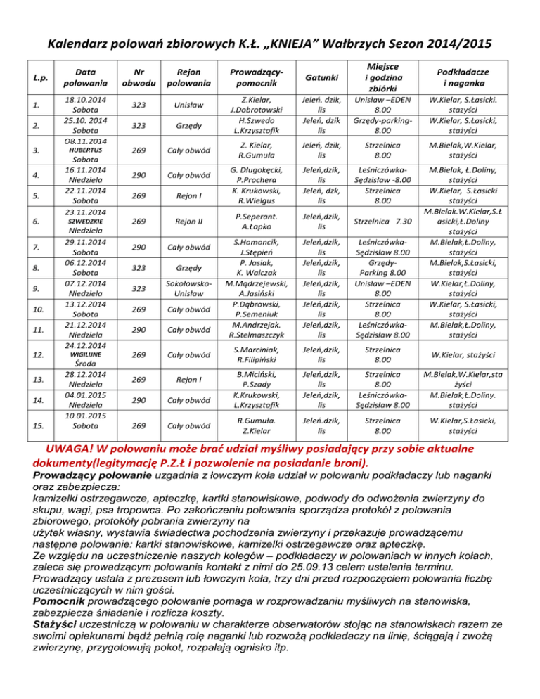 Kalendarz polowań zbiorowych K.Ł. „KNIEJA” Wałbrzych Sezon