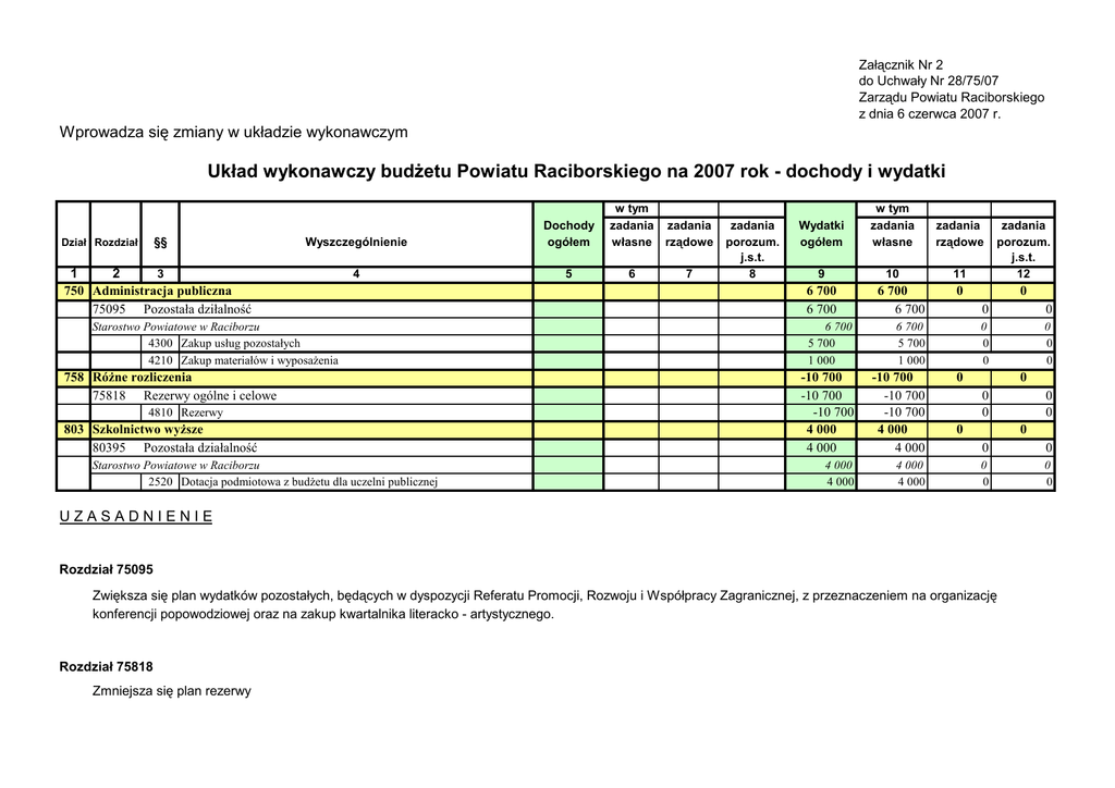 Załącznik Nr 2 do Uchwały Nr 28/75/07 Zarządu Powiatu Raciborskiego z dnia 6 czerwca 2007 r. Wprowadza się zmiany w układzie wykonawczym Układ wykonawczy budŜetu Powiatu Raciborskiego na 2007 rok - dochody i wydatki §§ Wyszczególnienie Dochody ogółem 1 2 3 750 Administracja publiczna 75095 Pozostała dziłalność 4 5 Dział Rozdział Starostwo Powiatowe w Raciborzu 4300 Zakup usług pozostałych 4210 Zakup materiałów i wyposaŜenia 758 RóŜne rozliczenia 75818 Rezerwy ogólne i celowe 4810 Rezerwy 803 Szkolnictwo wyŜsze 80395 Pozostała działalność Starostwo Powiatowe w Raciborzu 2520 Dotacja podmiotowa z budŜetu dla uczelni publicznej w tym zadania zadania własne rządowe 6 7 zadania porozum. j.s.t. 8 Wydatki ogółem 9 6 700 6 700 w tym zadania własne zadania rządowe 10 11 zadania porozum. j.s.t. 12 0 0 6 700 6 700 6 700 5 700 1 000 6 700 5 700 1 000 -10 700 -10 700 -10 700 4 000 4 000 -10 700 -10 700 -10 700 4 000 4 000 4 000 4 000 4 000 4 000 0 0 0 0 0 0 0 0 0 0 0 0 0 0 0 0 0 0 0 0 UZASADNIENIE Rozdział 75095 Zwiększa się plan wydatków pozostałych, będących w dyspozycji Referatu Promocji, Rozwoju i Współpracy Zagranicznej, z przeznaczeniem na organizację konferencji popowodziowej oraz na zakup kwartalnika literacko - artystycznego. Rozdział 75818 Zmniejsza się plan rezerwy 0 0 Rozdział 80395 Zwiększa się plan dotacji, będących w dyspozycji Referatu Edukacji, Kultury i Sportu, z przeznaczeniem na dofinansowanie kosztów udziału raciborskich studentów w Akademickich Mistrzostwach Europy w Rijece (Chorwacja)
