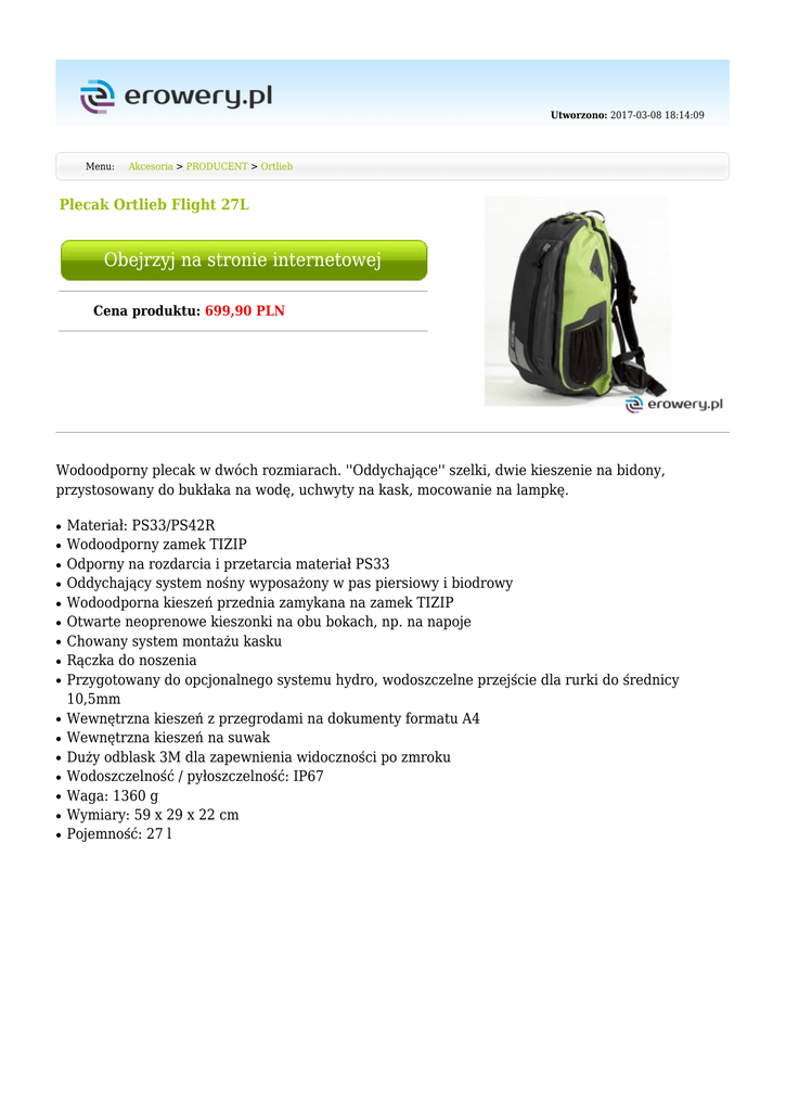 Utworzono: 2017-03-08 18:14:09 Menu: Akcesoria > PRODUCENT > Ortlieb Plecak Ortlieb Flight 27L Obejrzyj na stronie internetowej Cena produktu: 699,90 PLN Wodoodporny plecak w dwóch rozmiarach. ''Oddychające'' szelki, dwie kieszenie na bidony, przystosowany do bukłaka na wodę, uchwyty na kask, mocowanie na lampkę. ● ● ● ● ● ● ● ● ● ● ● ● ● ● ● ● Materiał: PS33/PS42R Wodoodporny zamek TIZIP Odporny na rozdarcia i przetarcia materiał PS33 Oddychający system nośny wyposażony w pas piersiowy i biodrowy Wodoodporna kieszeń przednia zamykana na zamek TIZIP Otwarte neoprenowe kieszonki na obu bokach, np. na napoje Chowany system montażu kasku Rączka do noszenia Przygotowany do opcjonalnego systemu hydro, wodoszczelne przejście dla rurki do średnicy 10,5mm Wewnętrzna kieszeń z przegrodami na dokumenty formatu A4 Wewnętrzna kieszeń na suwak Duży odblask 3M dla zapewnienia widoczności po zmroku Wodoszczelność / pyłoszczelność: IP67 Waga: 1360 g Wymiary: 59 x 29 x 22 cm Pojemność: 27 l Producent Kolor Ortlieb Zielony_#008000 Mimo dołożenia wszelkich starań nie gwarantujemy, że publikowane opisy i specyfikacje techniczne niezawierają uchybień lub błędów, które nie mogą jednak być podstawą do roszczeń. W przypadku jakichkolwiek wątpliwości, przed podjęciem decyzji prosimy o kontakt. Adres: www.erowery.pl Telefon: 605 515 185, 34 361 16 71 Email: [email protected]