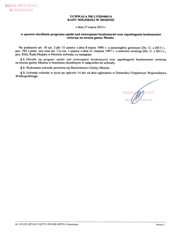 RADA MEJS(A W MOSE UCHWAŁA NR LVIII/406/14 RADY MIEJSKIEJ W MOSINIE z dnia 27 marca 2014 r. w sprawie określenia programu opieki nad zwierzętami bezdomnymi oraz zapobiegania bezdomności zwierząt na terenie gminy Mosina Na podstawie art. 18 ust. 2 pkt 15 ustawy z dnia 8 marca 1990 r. o samorządzie gminnym (Dz. U. z 2013 r., poz. 594 z późn. zm) oraz art. 1 la ust. 1 ustawy z dnia 21 sierpnia 199”7 r. o ochronie zwierząt (Dz. U. z 2013 r., poz. 856), Rada Miejska w Mosinie uchwala, co następuje: 1. Określa się program opieki nad zwierzętami bezdomnymi oraz zapobiegania bezdomności zwierząt na terenie gminy Mosina w brzmieniu określonym w załączniku do uchwały. 2. Wykonanie uchwały powierza się Burmistrzowi Gminy Mosina. 3. Uchwała wchodzi w życie po upływie 14 dni od dnia ogłoszenia w Dzienniku Urzędowym Województwa Wielkopolskiego. RADY 14 Id: XYLST-ZPYAP-YQYTy-PUFGB-EJETN. Uchwalony Strona 1 Uzasadnienie Zgodnie z art. 11 a ustawy z dnia 21 sierpnia 1997 r. o ochronie zwierząt (Dz. U. z 2013 r., poz. 856 z późn. zm.), rada gminy określa w drodze uchwały, corocznie do dnia 31 marca, program opieki nad zwierzętami bezdomnymi oraz zapobiegania bezdomności zwierząt. Stanowi to wypełnienie obowiązku zapewnienia opieki bezdomnym zwierzętom przez gminę, wynikającego z art. 11 ust. I ustawy. Stosownie do zapisów art. II ust. I ustawy z dnia 21 sierpnia 1997 r. o ochronie zwierząt, wyłapywanie bezdomnych zwierząt oraz zapewnienie im opieki należy do zadań własnych gminy. W związku z koniecznością wykonywania obowiązków ustawowych w zakresie opieki nad zwierzętami bezdomnymi, podjęcie niniejszej uchwaly przez Radę Miejskąw Mosinie jest uzasadnione. R\[ )Y id: XYLST-ZPYAP-YQYTy-PUFGB-EIETN. Uchwalony Strona 1 Zalącznik do Uchwały Nr LVIII/406/14 Rady Miejskiej w Mosinie z dnia 27 marca 2014 r. Program opieki nad zwierzętami bezdomnymi oraz zapobiegania bezdomności zwierząt na terenie gminy Mosina 1. Program ma zastosowanie w stosunku do bezdomnych zwierząt znajdujących się w granicach administracyjnych gminy Mosina, w tym szczególności psów i kotów. 2. Celem programu jest: 1) zapobieganie bezdomności zwierząt; 2) wyłapywanie bezdomnych zwierząt i doprowadzenie ich do schroniska; 3) ograniczenie niekontrolowanego rozrodu; 4) poprawa bezpieczeństwa i porządku publicznego; 5) edukacja społeczeństwa w zakresie obowiązków spoczywających na właścicielach zwierząt. 3. Gmina zapobiega bezdomności zwierząt poprzez: 1) Zapewnienie bezdomnym zwierzętom miejsca w schronisku dla zwierząt. Gmina Mosina jest członkiem Związku Międzygminnego „Schronisko dla Zwierząt SCHRONISKO” z siedzibą w Kostrzynie. Planowany termin realizacji inwestycji, polegającej na budowie schroniska dla zwierząt w Skałowie, określono na 2014 r. Do chwili powstania schroniska, miejscem, do którego trafiają zwierzęta bezdomne, jest przytulisko dla zwierząt, zlokalizowane przy ul. Krotowskiego 16, 62-050 Mosina. Na podstawie porozumienia, obsługę przedmiotowego przytuliska Burmistrz Gminy Mosina powierzył Zakładowi Ushg Komunalnych Sp. z o. o. w Mosinie. 2) Opiekę nad wolno żyjącymi kotami, w tym ich dokarmianie. Opieka nad kotami wolno żyjącymi docelowo realizowana będzie w ramach Związku Międzygminnego „Schronisko dla Zwierząt SCHRONISKO”. W chwili obecnej opieką nad wolno żyjącymi kotami oraz ich dokarmianiem, w sytuacji zaistnienia takiej konieczności, zajmuje się przytulisko dla zwierząt. 3) Odławianie bezdomnych zwierząt. a) Zasady wyłapywania bezdomnych zwierząt, dotyczą zwierząt, które uciekły, zabłąkały się lub zostały porzucone, a nie istnieje możliwość ustalenia właściciela lub innej osoby, pod której opieką zwierzę dotąd pozostawało lub które stwarzają bezpośrednie zagrożenie dla Życia, zdrowia lub bezpieczeństwa ludzi, innych zwierząt lub mienia oraz dalszego postępowania z tymi zwierzętami; b) Wyłapywanie zwierząt ma charakter stały i przeprowadzane będzie według zaistniałych potrzeb oraz posiadanych środków, na podstawie obserwacji ilości bezdomnych zwierząt znajdujących się na terenie gminy lub zawiadomień o ich występowaniu; c) Wyłapywanie zwierząt ma formę doraźnego wyłapania określonego zwierzęcia w razie naglącej potrzeby lub stwarzania przez zwierzę bezpośredniego zagrożenia dla życia lub zdrowia ludzkiego, innych zwierząt lub mienia; d) Działanie, o którym mowa w pkt 3, realizuje podmiot, z którym Gmina Mosina zawrze stosowną umowę przy współpracy z Gminnym Centrum Zarządzania Kryzysowego lub Straży Miejskiej Gminy Mosina; e) Wyłapane zwierzęta będą docelowo umieszczane w schronisku dla zwierząt; — — 1 W przypadku pokąsania człowieka przez zwierzę przed lub w trakcie wyłapywania, powiadamia się Powiatowego Lekarza Weterynarii w Poznaniu, który podejmuje decyzję o dalszym postępowaniu z tym zwierzęciem; g) W przypadku uzasadnionego podejrzenia wścieklizny lub innej choroby zakaźnej u schwytanego zwierzęcia, niezwłocznie powiadamia się Powiatowego Lekarza Weterynarii w Poznaniu, który zdecyduje o dalszym postępowaniu z tym zwierzęciem; h) Wyłapane zwierzęta podlegają, w szczególności, następującym czynnościom i zabiegom: ocenie stanu zdrowotnego przez służbę weterynaryjn oznakowaniu; niezbędnym szczepieniom profilaktycznym; niezbędnemu leczeniu w przypadkach tego wymagających. 4) Obligatoryjną sterylizację albo kastrację zwierząt w schroniskach dla zwierząt. a) Zwierzęta pozostające w przytulisku dłużej niż 3 miesiące mogą być poddane zabiegowi sterylizacji lub kastracji. b) Do czasu wybudowania przez Związek Międzygminny „Schronisko dla Zwierząt SCHRONISKO” schroniska w Skałowie, sterylizacja albo kastracja zwierząt przeprowadzana będzie przez przytulisko na podstawie porozumienia zawartego między Gminą Mosina i Zakładem Usług Komunalnych Sp. z o. o. w Mosinie. Z