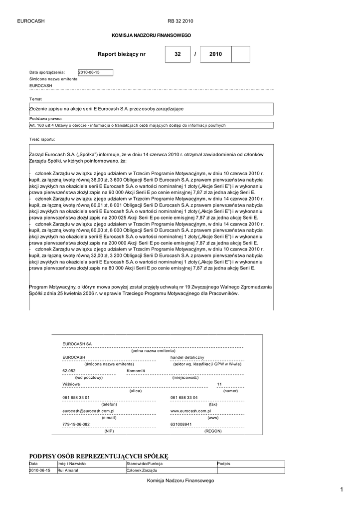 EUROCASH RB 32 2010 KOMISJA NADZORU FINANSOWEGO Raport bieżący nr 32 / 2010 2010-06-15 Data sporządzenia: Skróc ona nazwa emitenta EUROCASH Temat Złożenie zapisu na akcje serii E Eurocash S.A. przez osoby zarządzające Podstawa prawna Art. 160 ust 4 Ustawy o obroc ie - informac ja o transakc jac h osób mając yc h dostęp do informac ji poufnyc h Treść raportu: Zarząd Eurocash S.A. („Spółka”) informuje, że w dniu 14 czerwca 2010 r. otrzymał zawiadomienia od członków Zarządu Spółki, w których poinformowano, że: - członek Zarządu w związku z jego udziałem w Trzecim Programie Motywacyjnym, w dniu 10 czerwca 2010 r. kupił, za łączną kwotę równą 36,00 zł, 3 600 Obligacji Serii D Eurocash S.A. z prawem pierwszeństwa nabycia akcji zwykłych na okaziciela serii E Eurocash S.A. o wartości nominalnej 1 złoty („Akcje Serii E”) i w wykonaniu prawa pierwszeństwa złożył zapis na 90 000 Akcji Serii E po cenie emisyjnej 7,87 zł za jedna akcję Serii E. - członek Zarządu w związku z jego udziałem w Trzecim Programie Motywacyjnym, w dniu 14 czerwca 2010 r. kupił, za łączną kwotę równą 80,01 zł, 8 001 Obligacji Serii D Eurocash S.A. z prawem pierwszeństwa nabycia akcji zwykłych na okaziciela serii E Eurocash S.A. o wartości nominalnej 1 złoty („Akcje Serii E”) i w wykonaniu prawa pierwszeństwa złożył zapis na 200 025 Akcji Serii E po cenie emisyjnej 7,87 zł za jedna akcję Serii E. - członek Zarządu w związku z jego udziałem w Trzecim Programie Motywacyjnym, w dniu 14 czerwca 2010 r. kupił, za łączną kwotę równą 80,00 zł, 8 000 Obligacji Serii D Eurocash S.A. z prawem pierwszeństwa nabycia akcji zwykłych na okaziciela serii E Eurocash S.A. o wartości nominalnej 1 złoty („Akcje Serii E”) i w wykonaniu prawa pierwszeństwa złożył zapis na 200 000 Akcji Serii E po cenie emisyjnej 7,87 zł za jedna akcję Serii E. - członek Zarządu w związku z jego udziałem w Trzecim Programie Motywacyjnym, w dniu 10 czerwca 2010 r. kupił, za łączną kwotę równą 32,00 zł, 3 200 Obligacji Serii D Eurocash S.A. z prawem pierwszeństwa nabycia akcji zwykłych na okaziciela serii E Eurocash S.A. o wartości nominalnej 1 złoty („Akcje Serii E”) i w wykonaniu prawa pierwszeństwa złożył zapis na 80 000 Akcji Serii E po cenie emisyjnej 7,87 zł za jedna akcję Serii E. Program Motywacyjny, o którym mowa powyżej został przyjęty uchwałą nr 19 Zwyczajnego Walnego Zgromadzenia Spółki z dnia 25 kwietnia 2006 r. w sprawie Trzeciego Programu Motywacyjnego dla Pracowników. EUROCASH SA (pełna nazwa emitenta) EUROCASH handel detalic zny (skróc ona nazwa emitenta) 62-052 (sektor wg. klasyfikac ji GPW w W-wie) Komorniki (kod poc ztowy) (miejsc owość ) Wiśniowa 11 (ulic a) (numer) 061 658 33 01 061 658 33 04 (telefon) (fax) euroc ash@euroc ash.c om.pl www.euroc ash.c om.pl (e-mail) (www) 779-19-06-082 631008941 (NIP) (REGON) PODPISY OSÓB REPREZENTUJĄCYCH SPÓŁKĘ Data Imię i Nazwisko Stanowisko/Funkc ja 2010-06-15 Rui Amaral Członek Zarządu Podpis Komisja Nadzoru Finansowego 1 EUROCASH 2010-06-15 RB 32 2010 Arnaldo Guerreiro Członek Zarządu Komisja Nadzoru Finansowego 2
