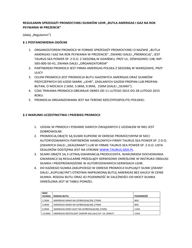 REGULAMIN SPRZEDAŻY PROMOCYJNEJ SILNIKÓW LEHR „BUTLA AMERIGAS I GAZ NA ROK PŁYWANIA W PREZENCIE” (dalej „Regulamin”) § 1 POSTANOWIENIA OGÓLNE 1. ORGANIZATOREM PROMOCJI W FORMIE SPRZEDAŻY PROMOCYJNEJ O NAZWIE „BUTLA AMERIGAS I GAZ NA ROK PŁYWANIA W PREZENCIE”, ZWANEJ DALEJ „PROMOCJĄ”, JEST TAURUS SEA POWER SP. Z O.O. Z SIEDZIBĄ W GDAŃSKU, PRZY UL. DŹWIGOWEJ 13B, NIP: 583-000-50-41, ZWANA DALEJ „ORGANIZATOREM” 2. PARTNEREM PROMOCJI JEST FIRMA AMERIGAS POLSKA Z SIEDZIBĄ W WARSZAWIE, PRZY ULICY 3. CELEM PROMOCJI JEST PROMOCJA BUTLI GAZOWYCH AMERIGAS ORAZ SILNIKÓW PRZYCZEPNYCH DO ŁODZI MARKI „LEHR”, ZASILANYCH GAZEM PROPAN LUB PROPANBUTAN, O MOCACH 2.5KM, 5.0KM, 9.9KM, 15KM (DALEJ „SILNIKI”). 4. CZAS TRWANIA PROMOCJI OBEJMUJE OKRES OD 11 LUTEGO 2015 DO 28 LUTEGO 2015 ROKU. 5. PROMOCJA ORGANIZOWANA JEST NA TERENIE RZECZYPOSPOLITEJ POLSKIEJ. § 2 WARUNKI UCZESTNICTWA I PRZEBIEG PROMOCJI 1. UDZIAŁ W PRMOCJI I PODANIE DANYCH ZWIĄZANYCH Z UDZIAŁEM W NIEJ JEST DOBROWOLNE. 2. PROMOCJĄ OBJĘTE SĄ SILNIKI KUPIONE W OKRESIE PROMOCYJNYM W SIECI AUTORYZOWANYCH PARTNERÓW HANDLOWYCH FIRMY TAURUS SEA POWER SP. Z O.O. (ZWANYCH DALEJ „DEALERAMI”) LUB W FIRMIE TAURUS SEA POWER SP. Z O.O. LISTA DEALERÓW DOSTĘPNA JEST NA STRONIE WWW.TAURUS.GDA.PL . 3. SILNIKI OBJĘTE SĄ 3-LETNIĄ GWARANCJĄ PRODUCENTA. WARUNKIEM DOCHOWANIA GWARANCJI SĄ REGULARNE PRZEGLĄDY SERWISOWE OKREŚLONE W INSTRUKJI OBSŁUGI SILNIKA I PRZEPROWADZONE W AUTORYZOWANYCH SERWISACH LEHR. 4. DO KAŻDEGO SILNIKA ZAKUPIOEGO W OKRESIE PROMOCJI KUPUJĄCY SILNIK (ZWANY DALEJ „KUPUJĄCYM”) OTRZYMA NAPEŁNIONĄ BUTLĘ AMERIGAS BEZ KAUCJI W CENIE SILNIKA. RODZAJ BUTLI ORAZ JEJ POJEMNOŚĆ W ZALEŻNOŚCI OD MOCY SILNIKA OKREŚLONA JEST W TABELI PONIŻEJ. MOC SILNIKA RODZAJ BUTLI POJEMNOŚĆ 2.5KM AMERIGAS NANO NA SZYBKOZŁĄCZKĘ 27MM 8KG 5.0KM AMERIGAS NANO NA SZYBKOZŁĄCZKĘ 27MM 8KG 9.9KM AMERIGAS DOM LIGHT NA SZYBKOZŁĄCZKĘ 27MM 11KG 15.0KM AMERIGAS MOTOLIGHT ZAWÓR W21,8x1/14'' LH, DIN477 11KG 5. ILOŚĆ KOLEJNYCH WYMIAN BUTLI, MOŻLIWA NA ZASADACH PROMOCYJNYCH, W ZALEŻNOŚCI OD MOCY SILNIKA OKREŚLA TABELA PONIŻEJ. MOC (KM) ILOŚĆ KOLEJNYCH WYMIAN POJEMNOŚĆ BUTLI NA ZASADACH BUTLI (L) PROMOCYJNYCH 2.5 16 (8kg) 2 5.0 16 (8kg) 4 9.9 22 (11kg) 7 15 22 (11kg) 10 6. ŁĄCZNIE KUPUJĄCY OTRZYMA GAZ NA 100 GODZIN PŁYWANIA PRZY CZYM ZUŻYCIE PALIWA LICZONE JEST WEDŁUG DANYCH PRODUCENTA SILNIKÓW PRZY OBROTACH 3000 RPM. MOC (KM) RPM ZUŻYCIE GAZU (L/GODZ.) PALIWO NA 100 GODZIN (L) POJEMNOŚĆ ILOŚĆ PEŁNYCH BUTLI NA BUTLI (L) ZASADACH PROMOCYJNYCH 2.5 3000 obr/min 0.4 40 16 (8kg) 3 5.0 3000 obr/min 0.8 80 16 (8kg) 5 9.9 3000 obr/min 1.7 170 22 (11kg) 8 15 3000 obr/min 2.5 250 22 (11kg) 11 7. KUPUJĄCY MOŻE WYMIENIĆ BUTLĘ NA PEŁNĄ NA ZASADACH PROMOCYJNYCH W SIECI PARTERA PROMOCJI, FIRMY AMERIGAS. PUNKTY WYMIANY AMERIGAS DOSTĘPNE SĄ NA STRONIE WWW.NANO.AMERIGAS.PL DLA BUTLI NANO, WWW.DOM-LIGHT.AMERIGAS.PL DLA BUTLI DOM LIGHT ORAZ WWW.AMERIGAS.PL DLA BUTLI MOTOLIGHT. 8. W MOMENCIE WYMIANY BUTLI KUPUJĄCY ZOBOWIĄZANY JEST DO ZAPŁATY ZA GAZ W PUNKCIE WYMIANY. 9. KUPUJĄCEMY PRZYSŁUGUJE JEDNORAZOWY ZWROT KOSZTÓW ZAKUPU GAZU NA PODSTAWIE PARAGONÓW/FAKTUR NA ZAKUP GAZU. CENA GAZU NIE MOŻE ODBIEGAĆ ZNACZĄCO OD CENY RYNKOWEJ W MOMENCIE ZAKUPU GAZU. 10. DO ROZLICZENIA ZWROTU BĘDĄ BRANE TYLKO PARAGONY/FAKTURY WYSTAWIONE PRZED 1 STYCZNIA 2016 ROKU. 11. KUPUJĄCY ZOBOWIĄZANY JEST DO PRZESŁANIA SKANÓW PARAGONÓW/FAKTUR ZA ZAKUP GAZU ORAZ SKANU PARAGONU/FAKTURY ZA ZAKUP SILNIKA NA ADRES [email protected] DO 14 STYCZNIA 2016, CELEM ICH ROZLICZENIA. TYTUŁ EMAILA POWINIEN BRZMIEĆ „ROZLICZENIE PROMOCJI LEHR 2015”. W TREŚCI E-MAILA NALEŻY PODAĆ: a. IMIĘ I NAZWISKO KUPUJĄCEGO b. ADRES ZAMIESZKANIA c. NUMER TELEFONU d. NUMER SERYJNY SILNIKA e. NUMER RACHUNKU BANKOWEGO NA KTÓRY DOKONANY ZOSTANIE ZWROT KOSZTÓW ZAKUPU GAZU. 12. ZWROT KOSZTÓW REALIZOWANY BĘDZIE DO 31 STYCZNIA 2016. 13. CENY SILNIKÓW OKREŚLA AKTUALNIE OBOWIĄZUJĄCY CENNIK LEHR. ORGANIZATOR ZASTRZEGA SOBIE PRAWO DO ZMIANY CEN W OKRESIE TRWANIA PROMOCJI. § 3 POSTĘPOWANIE REKLAMACYJNE 1. WSZELKIE REKLAMACJE DOTYCZĄCE SPOSOBU PRZEPROWADZENIA PROMOCJI UCZESTNICY WINNI ZGŁASZAĆ E-MAILEM NA ADRES [email protected] 2. PISEMNA REKLAMACJA POWINNA ZAWIERAĆ IMIĘ, NAZWISKO I DOKŁADNY ADRES KUPUJĄCEGO ORAZ DOKŁADNY OPIS I UZASADNIENIE REKLAMACJI. 3. REKLAMACJE ROZPATRYWANE BĘDĄ PRZEZ ORGANIZATORA W TERMINIE 14 (CZTERNASTU) DNI OD DATY ICH OTRZYMANIA. 4. KUPUJĄCY ZOSTANIE POWIADOMIONY O SPOSOBIE ROZPATRZENIA REKLAMACJI EMAILEM ZWROTNYM W TERMINIE 14 (CZTERNASTU) DNI OD DATY ROZPATRZENIA DANEJ REKLAMACJI. 5. ROSZCZENIA NIEROZPATRZONE LUB NIEUWZGLĘDNIONE W POSTĘPOWANIU REKLAMACYJNYM MOGĄ BYĆ DOCHODZONE PRZEZ SĄDEM POWSZECHNYM. § 3 POSTANOWIENIA KOŃCOWE 1. NINIEJSZY REGULAMIN DOSTĘPNY JEST U DEALERÓW, KTÓRZY SPRZEDAJĄ SILNIKI ORAZ NA STRONIE WWW.TAURUS.GDA.PL 2. ORGANIZATOR ZASTRZEGA SOBIE PRAWO WPROWADZENIA ZMIAN W NINIEJSZYM REGULAMINIE, W KAŻDYM CZASIE BEZ PODANIA PRZYCZYNY. ZMIANY W REGULAMINIE NIE BĘDĄ JEDNAK NARUSZAĆ PRAW NABYTYCH PRZEZ KUPUJĄCYCH.