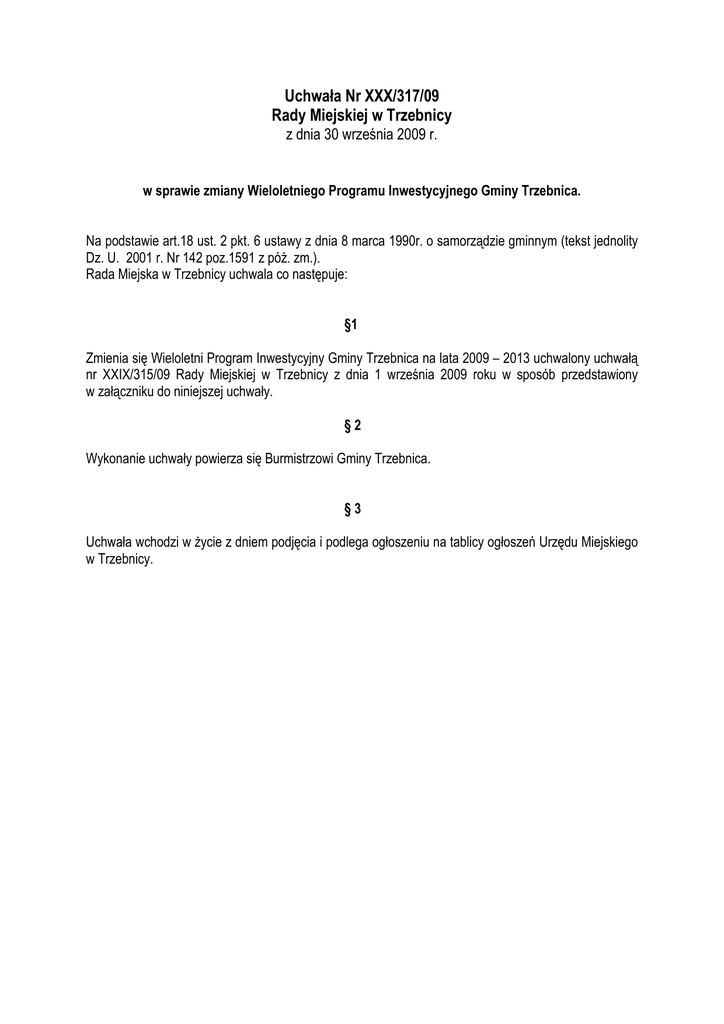 Uchwała Nr XXX/317/09 Rady Miejskiej w Trzebnicy
