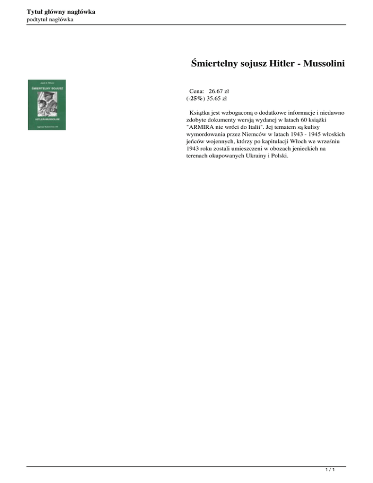 Tytuł główny nagłówka podtytuł nagłówka Śmiertelny sojusz Hitler - Mussolini Cena: 26.67 zł (-25%) 35.65 zł Książka jest wzbogaconą o dodatkowe informacje i niedawno zdobyte dokumenty wersją wydanej w latach 60 książki "ARMIRA nie wróci do Italii". Jej tematem są kulisy wymordowania przez Niemców w latach 1943 - 1945 włoskich jeńców wojennych, którzy po kapitulacji Włoch we wrześniu 1943 roku zostali umieszczeni w obozach jenieckich na terenach okupowanych Ukrainy i Polski. 1/1 Powered by TCPDF (www.tcpdf.org)