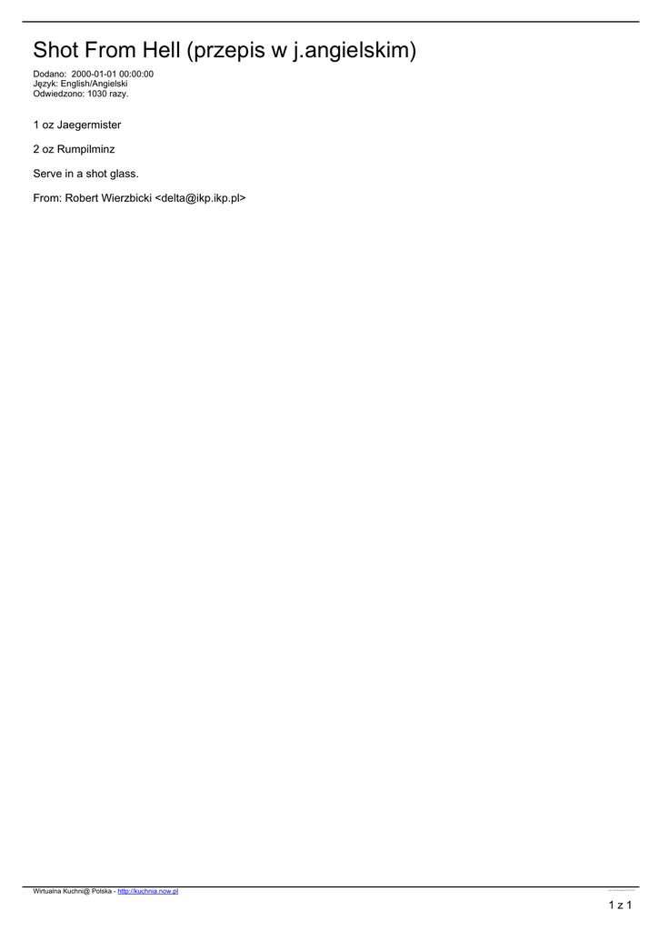 Shot From Hell (przepis w j.angielskim) Dodano: 2000-01-01 00:00:00 Język: English/Angielski Odwiedzono: 1030 razy. 1 oz Jaegermister 2 oz Rumpilminz Serve in a shot glass. From: Robert Wierzbicki <[email protected]> Wirtualna Kuchni@ Polska - http://kuchnia.now.pl przepis nr 4033, plik wygenerowano 2017.03.08 19:14 1z1