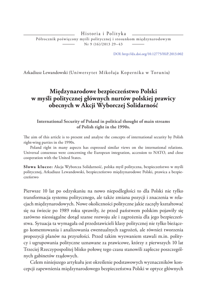 H i s tor i a i Pol it y k a Pó ł roc zni k poś w ię c ony my śli polit yc znej i stosu n kom m ię d z y na rodow y m Nr 9 (16 )/2013 29 – 43 DOI: http://dx.doi.org/10.12775/HiP.2013.002 Arkadiusz Lewandowski (Un i we r s y t e t M i k o ł aja K op e r n i k a w Tor u n iu) Międzynarodowe bezpieczeństwo Polski w myśli politycznej głównych nurtów polskiej prawicy obecnych w Akcji Wyborczej Solidarność International Security of Poland in political thought of main streams of Polish right in the 1990s. The aim of this article is to present and analyse the concepts of international security by Polish right-wing parties in the 1990s. Poland right in many aspects has expressed similar views on the international relations. Universal consensus were concerning the European integration, accession to NATO, and close cooperation with the United States. S ł o w a k lu c z e : Akcja Wyborcza Solidarność, polska myśl polityczna, bezpieczeństwo w myśli politycznej, Arkadiusz Lewandowski, bezpieczeństwo międzynarodowe Polski, prawica a bezpieczeństwo Pierwsze 10 lat po odzyskaniu na nowo niepodległości to dla Polski nie tylko transformacja systemu politycznego, ale także zmiana pozycji i znaczenia w relacjach międzynarodowych. Nowe okoliczności polityczne jakie zaczęły kształtować się na świecie po 1989 roku sprawiły, że przed państwem polskim pojawiły się zarówno nieosiągalne dotąd szanse rozwoju ale i zagrożenia dla jego bezpieczeństwa. Sytuacja ta wymagała od przedstawicieli klasy politycznej nie tylko bieżącego komentowania i analizowania ewentualnych zagrożeń, ale również tworzenia propozycji planów na przyszłości. Przed takim wyzwaniem stawali m.in. politycy i ugrupowania polityczne uznawane za prawicowe, którzy z pierwszych 10 lat Trzeciej Rzeczypospolitej blisko połowę tego czasu stanowili zaplecze poszczególnych gabinetów rządowych. Celem niniejszego artykułu jest określenie podstawowych wyznaczników koncepcji zapewnienia międzynarodowego bezpieczeństwa Polski w optyce głównych 30 H i s t or i a i Pol it y k a • n r 9 (16 )/2 013 Bezpieczeńst wo międ z y na rodowe i wewnętr zne środowisk i partii prawicowych w latach 90. XX wieku. Cezurę czasową przyjętą w artykule dookreślają z jednej strony: początek transformacji systemowej w Polsce z drugiej zaś rok 2001 i wygrana Sojuszu Lewicy Demokratycznej oraz atak terrorystyczny w Nowym Jorku, który zmienił znacząco postrzeganie zagadnienia bezpieczeństwa międzynarodowego. Na potrzeby tekstu za środowiska i partie prawicowe rozumieć będziemy przedstawicieli ugrupowań, które współtworzyły nurty: chrześcijańsko-demokratyczny, konserwatywny oraz chrześcijańsko-narodowy, czyli te które na koniec dekady instytucjonalnie „okrzepły” stanowiąc podstawę Akcji Wyborczej Solidarność w postaci odpowiednio: Porozumienia Polskich Chrześcijańskich Demokratów, Stronnictwa Konserwatywno-Ludowego oraz Zjednoczenia Chrześcijańsko-Narodowego. Samo pojęcie prawicy i jego znaczenie budzi kontrowersje w obrębie nauk o polityce. Pojęcie to (podobnie jak i „lewica”) współcześnie uznawane jest niekiedy za nieadekwatne do opisu rzeczywistości politycznej. Kierunki tej krytyki, według Waldemara Wojtasika, skierowane zostały na nieprawidłowość samego podziału lewica–prawica, zbytnią ogólność tych pojęć i wzajemne przenikanie się elementów je różnicujących1. Roman Bäcker dodaje, że niemożliwym jest stworzenie „takiej definicji prawicy i lewicy, która obejmowałaby wszystkie przypadki ugrupowań, które są tak nazywane albo się autoidentyfikują jako takie”2. Co więcej, pojęcia te należałoby ujmować jako kontekstualne oraz ograniczone tak czasowo, jak i terytorialnie, co oznacza, że nie mogą być wykorzystywane jako kategorie teoretyczne. Konstatując można za autorem tej koncepcji stwierdzić: „Ich używanie (pojęć „prawica” i „lewica” – przyp. A. L.) jest sensowne tylko w sytuacji określania wobec siebie relacji ugrupowań parlamentarnych w danym systemie politycznym i danym czasie”3. Obok negatywnych opinii w dyskursie naukowym funkcjonują również głosy zwolenników aktualności diady lewica–prawica. Aleksander Hall sugeruje, że podział na te kategorie jest nadal aktualny w opisie rzeczywistości, choć nie do końca jest on taki sam jak kiedyś4. Zwolennikiem utrzymania aktualności tych pojęć był również Norberto Bobbio, autor książki o wiele mówiącym tytule „Prawica i Lewica”, który stwierdzał, że „Prawica i lewica to dwa terminy antytetyczne, od ponad dwóch stuleci używane powszechnie w celu wskazania sprzeczności po1 Zob. W. Wojtasik, Lewica i prawica w Polsce. Aspekty ekonomiczno-społeczne, Sosnowiec 2011, s. 31–34. 2 R. Bäcker, Nietradycyjna teoria polityki, Toruń 2011, s. 146. 3 Ibidem. 4 A. Hall, Historia francuskiej prawicy, Kraków 2009, s. 10. A r k a d iu s z L e w a n d o w s k i • Międzynarodowe bezpieczeństwo Polski... 31 między ideologiami i ruchami, na jakie podzielone jest głęboko skonfliktowane uniwersum myśli i działań politycznych”5. Określając pojęcie prawicy można za Wojtasikiem powiedzieć, że jest ono niedookreślone, co wynika ze zmieniających się sposobów jego pojmowania na przestrzeni rozwoju politycznego i społecznego6. Niemniej jednak prawicowość partii wiąże się z katalogiem wyrażanych prze nie postulatów7. Dzięki niemu możemy określić, definicyjne minimum. Według Jacka Bartyzela wspominany katalog tworzą: uznanie nadprzyrodzonego źródła władzy oraz prawno-naturalnego fundamentu społeczeństwa, państwa i prawa; instytucje, takie jak małżeństwo, rodzina, własność prywatna oraz ograniczona wobec nich rola państwa jedynie do funkcji ochronnych, silna władza i ograniczony rząd; poszanowanie dla tradycji i patriotyzmu8. Z kolei Aleksander Hall za Rogerem Scrutonem upatruje minimum prawicowości 