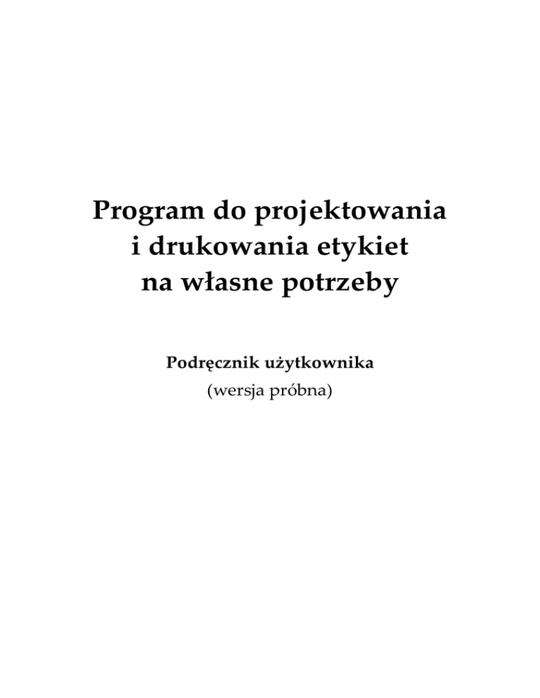 Program do projektowania i drukowania etykiet na własne potrzeby Podręcznik użytkownika (wersja próbna) Tworzenie projektu etykiety Głównym przeznaczeniem programu jest ułatwienie projektowania i drukowania etykiet dla roślin przechowywanych w bazie danych. Dla początkujących jednak łatwiejsze będzie dla zapoznania się z programem, a później do spostrzeżenia korzyści wynikających z korzystania z baz danych, utworzenie projektu etykiety zawierającej stałe elementy. Prosty projekt etykiety zawierającej tylko tekst Zaprojektujemy popularną etykietę pętelkową o wymiarach 210x12 mm o symbolu TF17 w katalogu produktów. Ta etykieta jest tak wąska, że zamieszczanie dodatkowych elementów graficznych może nie mieć większego sensu. Da się wprawdzie zmieścić małe logo lub kod kreskowy lecz będą mało widoczne. Wybierzmy zatem z paska menu Projekt/Nowy (skrót Ctrl+N). Zostanie wyświetlone okno z katalogiem szablonów etykiet. Do wyboru mamy kategorie szablonów: DisplayPrint, OfficePrint, SemiPrint, PepPrint, ChromoPrint i TagPrint. Wybieramy kategorię PepPrint – etykiety pętelkowe i szablon TF17 (TF_17_r8_210x12). Wybrany szablon etykiety pojawi się w oknie projektowym programu. Dalej korzystać będziemy z paska narzędziowego. Pasek ten podzielony jest na dwie części. Przyciski po lewej stronie służą do wstawiania stałych obiektów drukowanych na wszystkich etykietach. Najczęstsze zastosowanie to: nazwa i adres producenta, telefon, logo itp. stałe elementy, które chcemy, aby drukowane były na wszystkich etykietach. W prawej części paska narzędzi znajdują się przyciski do wstawiania obiektów, których źródłem jest baza danych. Będą to zwykle: nazwa rośliny, opis, cena kod kreskowy, fotografia. Na każdej etykiecie mogą być inne. Na naszej projektowanej etykiecie będzie tylko nazwa rośliny i nazwa producenta. Wstawmy zatem obiekt tekstowy, naciskając przycisk W oknie projektu etykiety pojawiło się zaznaczenie z tekstem „Wpisz swój tekst”. Właściwy tekst wpisujemy w polu Tekst znajdującym się w lewej części okna. Aby powiększyć pole wpisywania naciśnij przycisk z trzema kropkami: Zostanie wyświetlone okno z linijką tekstu do wpisania: Wpiszmy „Świerk kłujący 'Hoopsii'”. Po zatwierdzeniu przez naciśnięcie przycisku OK w oknie projektu pojawi się w wprowadzony tekst: Teraz pozostaje ten obiekt powiększyć i umieścić we właściwym miejscu etykiety: Zwiększymy teraz wielkość czcionki. W lewej części okna widoczny jest formularz z właściwościami obiektów wstawionych w projekcie etykiety. Rozmiar czcionki można zmienić na 3 sposoby: 1. wpisując żądaną wartość, 2. naciskając znajdujące się obok przyciski z małymi strzałkami lub 3. wywołując okno systemowe z właściwościami czcionki przez naciśnięcie przycisku z trzema kropkami znajdującego się obok pola: Oto wynik po wprowadzonych zmianach: zmianie wielkości i samej czcionki z domyślnej Arial na Arial Black. Następnie dodamy pole z nazwą i adresem producenta. Zamieszczanie tych danych na etykietach stanowi dodatkową reklamę. Mimo to jest wciąż niedoceniane przez producentów roślin. Specjalnie dla zademonstrowania możliwości dodawania koloru zmieniono tło ramki tekstowej na kolor żółty. Można uznać, że projekt etykiety został już zakończony. Pozostaje jeszcze sprawdzenie na podglądzie wydruku, czy wszystko jest tak, jak zaplanowane. W tym celu z paska menu programu należy wybrać Projekt/Podgląd lub przycisk Zostało wyświetlono okno Podgląd wydruku z widokiem arkusza zaprojektowanych etykiet. Okno można powiększyć do rozmiarów pulpitu i/lub zmienić skalę podglądu korzystając z przycisków: Jeśli projekt etykiety jest zgodny z naszymi oczekiwaniami można go zapisać do późniejszego wykorzystania lub modyfikacji. Z paska menu programu wybieramy Projekt/Zapisz. Zostanie wyświetlone okno Zapisz jako... z polami do podania nazwy i opisu projektu. Następnie zatwierdzamy naciskając przycisk OK i projekt etykiety zostaje zapisany na dysku komputera. Bazy danych Program umożliwia korzystanie z baz danych wielu formatów: Dbase, Paradox, Access, Excel, CSV. Dzięki tej uniwersalności do programu można podłączyć zewnętrzne bazy danych dostępne na rynku. Wraz z programem dostarczana jest także Osobista baza danych. Jest to właściwie tylko zalążek bazy danych. Nie zawiera w ogóle danych tylko niezbędne pola do samodzielnego uzupełniania we własnym zakresie. Dodatkowe pola danych można jednak łatwo dodać w razie potrzeby. Omawianie baz danych zacznę właśnie od tej bazy. Z paska menu programu wybierz Bazy danych, a następnie opcję Zarządzanie bazami danych. Zostanie wyświetlone okno Zarządzanie połączeniami z bazami danych. W wyświetlonym oknie widoczna jest lista baz danych połączonych z programem. W dopiero co zainstalowanym programie jest widoczna tylko jedna baza danych: Osobista baza danych. W prawej części okna widoczny jest pasek z przyciskami Otwórz, Zmień, Usuń, Utwórz, Wyjście. Naciśnięcie przycisku Otwórz spowoduje otwarcie zaznaczonej bazy danych. Dwa kolejne przyciski Zmień i Usuń są nieaktywne, ponieważ tej właśnie jednej wbudowanej bazy danych nie można usunąć ani zmienić właściwości istniejącego z nią połączenia. Naciśnięcie przycisku Utwórz spowoduje przejście do etapu tworzenia połączenia z zewnętrzną bazą danych ale o tym w dalszej części podręcznika. Naciśnięcie przycisku Wyjście spowoduje zamknięcie tego okna i powrót do widoku okna programu. Naciśnij przycisk Otwórz, aby otworzyć Osobistą bazę danych. Wyświetlone zostało okno Baza danych. Normalnie ta baza danych jest pusta. Dla potrzeb tego podręcznika wprowadziłem dwa rekordy. U góry w lewej części okna znajduje się arkusz danych z rekordami. Tutaj można dodawać rekordy (przycisk Nowy w prawej części okna) lub je zmieniać bezpośred