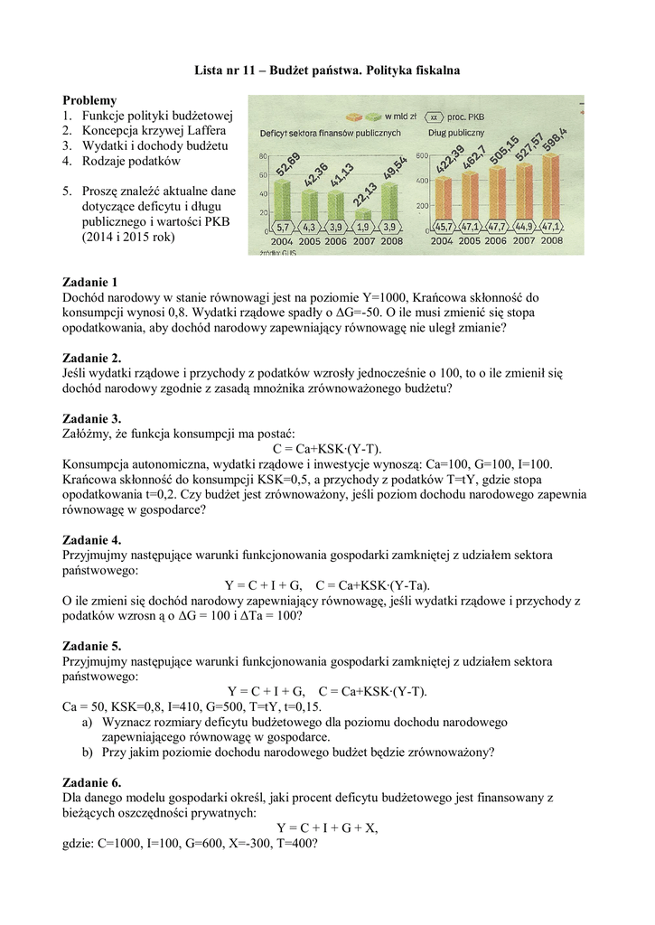 Lista nr 11 – Budżet państwa. Polityka fiskalna Problemy 1. Funkcje polityki budżetowej 2. Koncepcja krzywej Laffera 3. Wydatki i dochody budżetu 4. Rodzaje podatków 5. Proszę znaleźć aktualne dane dotyczące deficytu i długu publicznego i wartości PKB (2014 i 2015 rok) Zadanie 1 Dochód narodowy w stanie równowagi jest na poziomie Y=1000, Krańcowa skłonność do konsumpcji wynosi 0,8. Wydatki rządowe spadły o ΔG=-50. O ile musi zmienić się stopa opodatkowania, aby dochód narodowy zapewniający równowagę nie uległ zmianie? Zadanie 2. Jeśli wydatki rządowe i przychody z podatków wzrosły jednocześnie o 100, to o ile zmienił się dochód narodowy zgodnie z zasadą mnożnika zrównoważonego budżetu? Zadanie 3. Załóżmy, że funkcja konsumpcji ma postać: C = Ca+KSK·(Y-T). Konsumpcja autonomiczna, wydatki rządowe i inwestycje wynoszą: Ca=100, G=100, I=100. Krańcowa skłonność do konsumpcji KSK=0,5, a przychody z podatków T=tY, gdzie stopa opodatkowania t=0,2. Czy budżet jest zrównoważony, jeśli poziom dochodu narodowego zapewnia równowagę w gospodarce? Zadanie 4. Przyjmujmy następujące warunki funkcjonowania gospodarki zamkniętej z udziałem sektora państwowego: Y = C + I + G, C = Ca+KSK·(Y-Ta). O ile zmieni się dochód narodowy zapewniający równowagę, jeśli wydatki rządowe i przychody z podatków wzrosn ą o ΔG = 100 i ΔTa = 100? Zadanie 5. Przyjmujmy następujące warunki funkcjonowania gospodarki zamkniętej z udziałem sektora państwowego: Y = C + I + G, C = Ca+KSK·(Y-T). Ca = 50, KSK=0,8, I=410, G=500, T=tY, t=0,15. a) Wyznacz rozmiary deficytu budżetowego dla poziomu dochodu narodowego zapewniającego równowagę w gospodarce. b) Przy jakim poziomie dochodu narodowego budżet będzie zrównoważony? Zadanie 6. Dla danego modelu gospodarki określ, jaki procent deficytu budżetowego jest finansowany z bieżących oszczędności prywatnych: Y = C + I + G + X, gdzie: C=1000, I=100, G=600, X=-300, T=400?