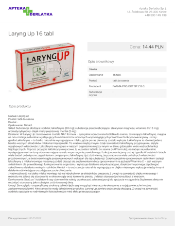 Apteka Derlatka Sp. j. Ul. Źródłowa 20, 25-335 Kielce +48 530 145 138 Laryng Up 16 tabl Cena: 14,44 PLN Opis słownikowy Dawka - Opakowanie 16 tabl. Postać tabl.do ssania Producent FARMA PROJEKT SP.Z O.O. Substancja czynna - Opis produktu Nazwa: Laryng up Postać: tabl.do ssania Dawka: Opakowanie: 16 tabl. Skład: Substancja słodząca: sorbitol; laktoferyna (30 mg); substancja przeciwzbrylająca: stearynian magnezu; witamina C (15 mg); aromaty:cytrynowy, olejek mięty pieprzowej; mentol (2 mg) Działanie: W Laryng Up zastosowana została NAP formuła – specjalnie opracowana tabletka do ssania, zawierająca laktoferynę, mająca na celu imitację naturalnie występujących mechanizmów obronnych wspomagających prawidłowe funkcjonowanie jamy ustnej i gardła.Laktoferyna – to białko naturalnie występujące w mleku, gdzie po raz pierwszy zostało wykryte. Laktoferyna to również jedenz bardzo ważnych składników mleka karmiącej matki. To właśnie między innymi dzięki zawartości laktoferyny przypisuje mu siętyle wyjątkowych właściwości. Laktoferyna występuje w naszym organizmie między innymi w ślinie, gdzie pełni wiele ważnych funkcji fizjologicznych. Poprzez przyjęcie laktoferyny miejscowo, tj. w postaci tabletki do ssania (NAP formuła), naśladuje się naturalnie występujące mechanizmy obronne mające na celu wspomaganie prawidłowego funkcjonowania jamy ustnej i gardła.W ostatnich latach wiele badań poświęcono zagadnieniom związanym z laktoferyną i już dziś wiemy, że posiada ona wiele unikalnych właściwości prozdrowotnych, a świat nauki ciągle poszukuje nowych wskazań dla tej substancji. Dzięki specjalnie opracowanym technikom izolacji laktoferyny z mleka krowiego możemy już dziś cieszyć się suplementami diety opracowanymi na jej bazieWitamina C – jest ważnym składnikiem dla prawidłowego funkcjonowania organizmu. Wykazuje działanie antyoksydacyjne, dziękiczemu pomaga zapobiegać szkodliwemu działaniu wolnych rodników.Mentol – to substancja naturalnie występująca w olejku miętowym, wykazuje między innymi działanie odświeżające oraz dająceuczucie chłodzenia. : Nadwrażliwość na białka mleka krowiego lub na którykolwiek ze składników preparatu.Z uwagi na zawartość olejku miętowego i mentolu nie zaleca się stosowania w okresie ciąży oraz karmienia piersią. U dzieci stosowaćpo konsultacji z lekarzem. Dawkowanie: Ssać po 1 tabletce 4 razy dziennie.Nie należy przekraczać zalecanej porcji do spożycia w ciągu dnia.Suplement diety nie możebyć stosowany jako substytut zróżnicowanej diety. Uwagi: Ze względu na specyficzną strukturę tabletki jej brzegi mogą być nieznacznie ukruszone, a na jej powierzchni można zaobserwowaćplamki. Nie stanowi to wady jakościowej produktu. Laryng Up zawiera substancję słodzącą. Z uwagi na zawartość sorbitolu spożycie w nadmiernych ilościach może mieć efekt przeczyszczający. Plik wygenerowano: 08-03-2017 Powered by TCPDF (www.tcpdf.org) Oprogramowanie sklepu: AptusShop