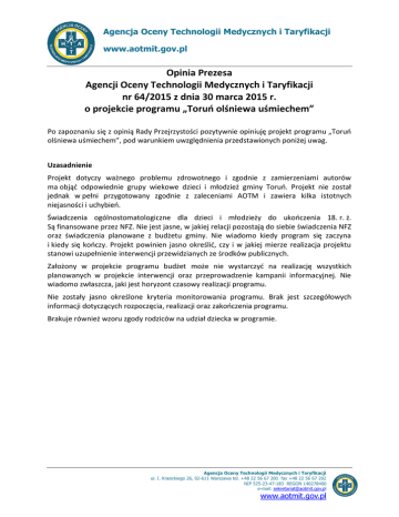 Agencja Oceny Technologii Medycznych i Taryfikacji www.aotmit.gov.pl Opinia Prezesa Agencji Oceny Technologii Medycznych i Taryfikacji nr 64/2015 z dnia 30 marca 2015 r. o projekcie programu „Toruo olśniewa uśmiechem” Po zapoznaniu się z opinią Rady Przejrzystości pozytywnie opiniuję projekt programu „Toruo olśniewa uśmiechem”, pod warunkiem uwzględnienia przedstawionych poniżej uwag. Uzasadnienie Projekt dotyczy ważnego problemu zdrowotnego i zgodnie z zamierzeniami autorów ma objąd odpowiednie grupy wiekowe dzieci i młodzież gminy Toruo. Projekt nie został jednak w pełni przygotowany zgodnie z zaleceniami AOTM i zawiera kilka istotnych niejasności i uchybieo. Świadczenia ogólnostomatologiczne dla dzieci i młodzieży do ukooczenia 18. r. ż. Są finansowane przez NFZ. Nie jest jasne, w jakiej relacji pozostają do siebie świadczenia NFZ oraz świadczenia planowane z budżetu gminy. Nie wiadomo kiedy program się zaczyna i kiedy się kooczy. Projekt powinien jasno określid, czy i w jakiej mierze realizacja projektu stanowi uzupełnienie interwencji przewidzianych ze środków publicznych. Założony w projekcie programu budżet może nie wystarczyd na realizację wszystkich planowanych w projekcie interwencji oraz przeprowadzenie kampanii informacyjnej. Nie wiadomo zwłaszcza, jaki jest horyzont czasowy realizacji programu. Nie zostały jasno określone kryteria monitorowania programu. Brak jest szczegółowych informacji dotyczących rozpoczęcia, realizacji oraz zakooczenia programu. Brakuje również wzoru zgody rodziców na udział dziecka w programie. Agencja Oceny Technologii Medycznych i Taryfikacji ul. I. Krasickiego 26, 02-611 Warszawa tel. +48 22 56 67 200 fax +48 22 56 67 202 NIP 525-23-47-183 REGON 140278400 e-mail: [email protected] www.aotmit.gov.pl Opinia Prezesa AOTMiT nr 64/2015 z dnia 30 marca 2015 r. Przedmiot opinii Przedmiotem opinii jest projekt programu polityki zdrowotnej gminy Toruo w zakresie poprawy stanu zdrowia jamy ustnej, zwiększenia świadomości prozdrowotnej dotyczącej nawyków higienicznych i żywieniowych dzieci i młodzieży uczęszczających do szkół podstawowych, gimnazjów i liceów (grupy wiekowe 8, 11, 14 i 17 lat) oraz przeprowadzenie instruktażu udzielania I pomocy w przypadku urazów zębów mlecznych i stałych wśród dzieci, rodziców, opiekunów, nauczycieli i pielęgniarek szkolnych. Nie określono precyzyjnie jaki jest czas realizacji programu (autorzy wskazują 3 horyzonty czasowe: 5 lat, 10 lat, bezterminowo). Planowany całkowity koszt realizacji programu został określony na ok. 150 000 zł. Ocena projektu programu polityki zdrowotnej gminy Toruo Znaczenie problemu zdrowotnego Projekt programu zdrowotnego odnosi się do ważnego problemu zdrowotnego, jakim jest profilaktyka pierwotna i wtórna próchnicy zębów oraz poprawa stanu zdrowia jamy ustnej w populacji dzieci. Założenia związane z projektem programu pokrywają się również z założeniami Narodowego Programu Zdrowia na lata 2007- 2015, gdzie jeden z celów operacyjnych dotyczy: intensyfikacji zapobiegania próchnicy zębów u dzieci i młodzieży. Zabrakło przedstawienia Cele i efekty programu Głównym celem Programu jest Poprawa stanu zdrowia jamy ustnej, zwiększenie świadomości prozdrowotnej dotyczącej nawyków higienicznych i żywieniowych dzieci i młodzieży uczęszczających do szkół podstawowych, gimnazjów i liceów (grupy wiekowe 8, 11, 14 i 17 lat) na terenie gminy Toruo oraz przeprowadzenie instruktażu udzielania I pomocy w przypadku urazów zębów mlecznych i stałych wśród dzieci, rodziców, opiekunów, nauczycieli i pielęgniarek szkolnych. Autorzy słusznie rozgraniczają populacje dzieci. Dodatkowo Wnioskodawca określa 9 celów szczegółowych, uzupełniających założenie główne programu. Odnosi się m.in. zwiększenia liczby dzieci, u których zastosowano profesjonalne metody profilaktyki stomatologiczne, przeciwdziałania rozwojowi próchnicy i chorób przyzębia oraz wadom zgryzu u dzieci, obalenia stereotypu, że zębów mlecznych nie należy leczyd, zmniejszenia zjawiska strachu przed wizytą w gabinecie stomatologicznym wśród dzieci, zwiększenia dostępności do świadczeo profilaktycznych, ograniczenia przypadków zaawansowanej próchnicy oraz utraty zębów u dzieci, zmniejszenia kosztów leczenia stomatologicznego w późniejszych latach, zwiększenia wiedzy dotyczącej udzielania I pomocy przez nauczycieli, pielęgniarki, szkolne i rodziców / opiekunów w przypadku urazów w obrębie jamy ustnej Mierniki efektywności programu będą mied większą wartośd informacyjną, jeśli zostaną odniesione do takich samych mierników określonych dla populacji docelowej na początku trwania programu. Przedstawienie liczb dla poszczególnych mierników bez kontekstu wcześniejszej sytuacji nie stanowi o efektywności działao w programie. Populacja docelowa Adresatami Programu są dzieci zamieszkujące gminy Toruo. W przypadku dzieci biorących udział w programie niezbędna jest pisemna zgoda rodziców/opiekunów prawnych dziecka. Wnioskodawca jasno stwierdza, że taka zgoda rodziców/opiekunów dziecka jest w nim 2/9 Opinia Prezesa AOTMiT nr 64/2015 z dnia 30 marca 2015 r. wymagana i niezbędna. Nie dołączono do projektu programu wzoru zgody na udział dziecka w programie. Wnioskodawca określił, że całościową populację dzieci w wieku 8, 11, 14 oraz 17 lat na terenie gminy Toruo stanowi ok 7 000 osób. Dane te pokrywają się z danymi GUS za 2013 r. Do II etapu programu szacuje się, że ma zostad włączonych ok. 70% populacji. Głównymi kryteriami kwalifikacji są miejsce zamieszkania oraz wyrażenie zgody przez rodzica/opiekuna. Należy zaznaczyd, że z opisu programu wynika iż będzie on mied wielopłaszczyznowy charakter tj. przewiduję się prowadzenie różnego typu pogadanek i akcji edukacyjnych, a także będą prowadzone akcje stricte związane z zabezpieczeniem zębów prz