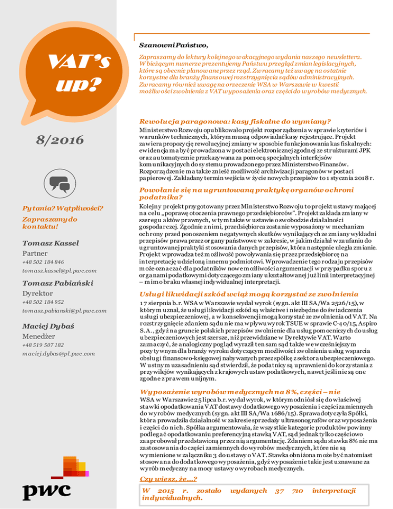 Szanowni Państwo, VAT’s up? Zapraszamy do lektury kolejnego wakacyjnego wydania naszego newslettera. W bieżącym numerze prezentujemy Państwu przegląd zmian legislacyjnych, które są obecnie planowane przez rząd. Zwracamy też uwagę na ostatnie korzystne dla branży finansowej rozstrzygnięcia sądów administracyjnych. Zwracamy również uwagę na orzeczenie WSA w Warszawie w kwestii możliwości zwolnienia z VAT wyposażenia oraz części do wyrobów medycznych. Rewolucja paragonowa: kasy fiskalne do wymiany? 8/2016 Ministerstwo Rozwoju opublikowało projekt rozporządzenia w sprawie kryteriów i warunków technicznych, którym muszą odpowiadać kasy rejestrujące. Projekt zawiera propozycję rewolucyjnej zmiany w sposobie funkcjonowania kas fiskalnych: ewidencja m a być prowadzona w postaci elektronicznej zgodnej ze strukturami JPK oraz automatycznie przekazywana za pom ocą specjalnych interfejsów kom unikacyjnych do sy stemu prowadzonego przez Ministerstwo Finansów. Rozporządzenie m a także znieść możliwość archiwizacji paragonów w postaci papierowej. Zakładany termin wejścia w życie nowych przepisów to 1 stycznia 2018 r. Powołanie się na ugruntowaną praktykę organów ochroni podatnika? Pytania? Wątpliwości? Zapraszamy do kontaktu! Tomasz Kassel Partner +48 502 184 846 tom [email protected] Tomasz Pabiański Dyrektor +48 502 184 952 tom [email protected] Maciej Dybaś Menedżer +48 519 507 182 m [email protected] Kolejny projekt przygotowany przez Ministerstwo Rozwoju to projekt ustawy mającej na celu „poprawę otoczenia prawnego przedsiębiorców”. Projekt zakłada zm iany w szeregu aktów prawnych, w tym także w ustawie o swobodzie działalności gospodarczej. Zgodnie z nimi, przedsiębiorca zostanie wyposażony w mechanizm ochrony przed ponoszeniem negatywnych skutków wynikających ze zm iany wykładni przepisów prawa przez organy państwowe w zakresie, w jakim działał w zaufaniu do ugruntowanej praktyki stosowania danych przepisów, która następnie uległa zm ianie. Projekt wprowadza też m ożliwość powoływania się przez przedsiębiorcę na interpretację udzieloną innemu podmiotowi. Wprowadzenie tego rodzaju przepisów m oże oznaczać dla podatników nowe m ożliwości argumentacji w przypadku sporu z organami podatkowymi dotyczącego zm iany ukształtowanej już linii interpretacyjnej – m im o braku własnej indywidualnej interpretacji. Usługi likwidacji szkód wciąż mogą korzystać ze zwolnienia 1 7 sierpnia b.r. WSA w Warszawie wydał wyrok (sygn. akt III SA/Wa 2526/15), w którym uznał, że usługi likwidacji szkód są właściwe i niezbędne do świadczenia usługi ubezpieczeniowej, a w konsekwencji mogą korzystać ze zwolnienia od VAT. Na rozstrzygnięcie zdaniem sądu nie ma wpływu wyrok TSUE w sprawie C-4 0/15, Aspiro S.A., gdyż na gruncie polskich przepisów zwolnienie dla usług pom ocniczych do usług ubezpieczeniowych jest szersze, niż przewidziane w Dyrektywie VAT. Warto zaznaczyć, że analogiczny pogląd wyraził ten sam sąd także we wcześniejszym pozy tywnym dla branży wyroku dotyczącym możliwości zwolnienia usług wsparcia obsługi finansowo-księgowej nabywanych przez spółkę z sektora ubezpieczeniowego. W ustnym uzasadnieniu sąd stwierdził, że podatnicy są uprawnieni do korzystania z przywilejów wynikających z krajowych ustaw podatkowych, nawet jeśli nie są one zgodne z prawem unijnym. Wyposażenie wyrobów medycznych na 8%, części – nie WSA w Warszawie 2 5 lipca b.r. wydał wyrok, w którym odniósł się do właściwej stawki opodatkowania VAT dostawy dodatkowego wyposażenia i części zamiennych do wyrobów medycznych (sygn. akt III SA/Wa 1686/15). Sprawa dotyczyła Spółki, która prowadziła działalność w zakresie sprzedaży ultrasonografów oraz wyposażenia i części do nich. Spółka argumentowała, że wszystkie kategorie produktów powinny podlegać opodatkowaniu preferencyjną stawką VAT, sąd jednak tylko częściowo zaaprobował przedstawioną przez nią argumentację. Zdaniem sądu stawka 8% nie ma zastosowania do części zamiennych do wyrobów medycznych, które nie są wymienione w załączniku 3 do ustawy o VAT. Stawka obniżona m oże być natomiast stosowana do dodatkowego wyposażenia, gdyż wyposażenie takie jest uznawane za wyrób m edyczny na mocy ustawy o wyrobach medycznych. Czy wiesz, że…? W 2015 r. zostało indywidualnych. wydanych 37 710 interpretacji