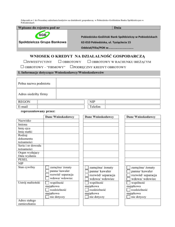 Załącznik nr 1 do Procedury udzielania kredytów na działalność gospodarczą w Pobiedzisko-Goślińskim Banku Spółdzielczym w Pobiedziskach Wpisano do rejestru pod nr Dnia Pobiedzisko-Gośliński Bank Spółdzielczy w Pobiedziskach 62-010 Pobiedziska, ul. Tysiąclecia 15 Oddział/Filia/POK w…………………………… WNIOSEK O KREDYT NA DZIAŁALNOŚĆ GOSPODARCZĄ INWESTYCYJNY OBROTOWY OBROTOWY – ”FIRMOWY” OBROTOWY W RACHUNKU BIEŻĄCYM PODRĘCZNY KREDYT OBROTOWY I. Informacje dotyczące Wnioskodawcy/Wnioskodawców Pełna nazwa podmiotu Adres siedziby firmy REGON NIP E-mail reprezentowany przez: Telefon Dane Wnioskodawcy Nazwisko Imiona Imię ojca Imię matki Rodzaj dokumentu tożsamości Seria i nr dowodu tożsamości Organ wydający Data wydania PESEL NIP Stan cywilny Ustrój małżeński Adres stałego zamieszkania zamężna/ żonaty panna/ kawaler rozwód/ separacja wdowa/ wdowiec wspólność majątkowa rozdzielność majątkowa nie dotyczy Dane Wnioskodawcy zamężna/ żonaty panna/ kawaler rozwód/ separacja wdowa/ wdowiec wspólność majątkowa rozdzielność majątkowa nie dotyczy Dane Wnioskodawcy zamężna/ żonaty panna/ kawaler rozwód/ separacja wdowa/ wdowiec wspólność majątkowa rozdzielność majątkowa nie dotyczy Numer telefonu II. Informacja o kredycie. Słownie złotych:………………………………………………………... ………………………………………………………………………….. …………………………złotych ………………………………………………………………………….. Kredyt przeznaczony jest na sfinansowanie:………………………………………………………………… ……………………………………………………………………………………………………………….. ……………………………………………………………………………………………………………….. Kwota wnioskowanego kredytu: Okres kredytowania – od……………………………….do………….……………………………………… Uruchomienie kredytu: jednorazowo w kwocie złotych…………………………..dnia………………………………….. w transzach: w kwocie złotych…………………………..dnia………………………...………... w kwocie złotych…………………………..dnia………………………………….. w kwocie złotych…………………………..dnia………………………………….. w formie: gotówkowej bezgotówkowej na rachunek nr …………………………….……………………………………. dane właściciela rachunku……………………………………………………………………….. Źródła finansowania przedsięwzięcia - wartość przedsięwzięcia ogółem…………….…..złotych, z tego środki własne…………………zł kredyt bankowy………………zł inne……..……………..zł Proponowane formy spłat kredytu: jednorazowo w:…………..ratach: miesięcznych kwartalnych półrocznych rocznych Proponowane formy spłat odsetek: miesięcznie kwartalnie półrocznie rocznie jednorazowo Okres karencji w spłacie kredytu:…………………………………………………………………………….. III. Proponowane formy zabezpieczenia kredytu: weksel własny in blanco wraz z deklaracją wekslową poręczenie wekslowe………………………………………………………………………………... poręczenie cywilne………………………………………………………………………………….. blokada środków pieniężnych na rachunku bankowym…………………………………………….. przewłaszczenie………………………………………………………………………………..... cesja praw z polisy ubezpieczeniowej……………………………………………………………… ............................................................................................................................................................ hipoteka na nieruchomości położonej:…………………………………księga wieczysta numer …………………………………………..stanowiącej własność……………………………………. ………………………………………………………………………………………………………. Inne formy zabezpieczenia………………………………………………………………………….. ………………………………………………………………………………………………………. IV. Posiadane zobowiązania. A) Posiadane kredyty Nazwa Banku Wysokość kredytu udzielony do spłaty Ostateczny termin spłaty Forma zabezpieczenia spłaty kredytu i odsetek B) Udzielone gwarancje i poręczenia, wystawione weksle, poręczenia wekslowe Nazwa beneficjenta (komu udzielono) Kwota Termin ważności/ zapłaty Forma zabezpieczenia 1. Oświadczam/y, że jestem (jesteśmy)*/nie jestem (nie jesteśmy)* członkiem Pobiedzisko-Goślińskiego Banku Spółdzielczego w Pobiedziskach i posiadam (posiadamy) ……..udziałów na kwotę…………….zł. V. Bank informuje, że: 1) Pana/ Pani/Państwa dane mogą być udostępniane przez Bank, bankom Spółdzielczej Grupy Bankowej w celu zawarcia i wykonania umowy konsorcjum bankowego; 2) Osoby, których dane są przetwarzane mają prawo dostępu do treści swoich danych oraz ich poprawiania; 3) Podanie danych jest dobrowolne, jednakże ich podanie warunkuje zawarcie i realizację umowy; 4) dane te przetwarzane będą przez Pobiedzisko-Gośliński Bank Spółdzielczy w Pobiedziskach w celu rozpatrzenia niniejszego wniosku oraz zawarcia i realizacji umowy kredytowej, a także w celach określonych w art. 23 ust. 1 pkt 5 ustawy o ochronie danych osobowych 5) na podstawie art.