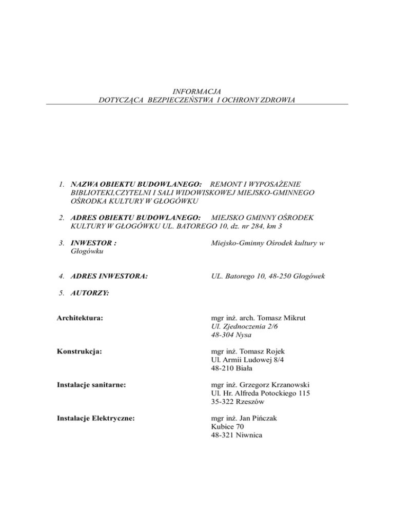 INFORMACJA DOTYCZĄCA BEZPIECZEŃSTWA I OCHRONY ZDROWIA 1. NAZWA OBIEKTU BUDOWLANEGO: REMONT I WYPOSAŻENIE BIBLIOTEKI,CZYTELNI I SALI WIDOWISKOWEJ MIEJSKO-GMINNEGO OŚRODKA KULTURY W GŁOGÓWKU 2. ADRES OBIEKTU BUDOWLANEGO: MIEJSKO GMINNY OŚRODEK KULTURY W GŁOGÓWKU UL. BATOREGO 10, dz. nr 284, km 3 3. INWESTOR : Głogówku Miejsko-Gminny Ośrodek kultury w 4. ADRES INWESTORA: UL. Batorego 10, 48-250 Głogówek 5. AUTORZY: Architektura: mgr inż. arch. Tomasz Mikrut Ul. Zjednoczenia 2/6 48-304 Nysa Konstrukcja: mgr inż. Tomasz Rojek Ul. Armii Ludowej 8/4 48-210 Biała Instalacje sanitarne: mgr inż. Grzegorz Krzanowski Ul. Hr. Alfreda Potockiego 115 35-322 Rzeszów Instalacje Elektryczne: mgr inż. Jan Pińczak Kubice 70 48-321 Niwnica CZEŚĆ OPISOWA DO INFORMACJI DOTYCZĄCEJ BEZPIECZEŃSTWA I OCHRONY ZDROWIA. 1/Zakres robót dla całego zamierzenia budowlanego oraz kolejność realizacji poszczególnych obiektów a/zakres robót : roboty ziemne roboty stanu surowego roboty murarskie roboty dekarskie roboty instalacyjne prace montażowe wykonywanie podkładów i posadzek wykonywanie ścianek działowych wraz z zamontowaniem stolarki drzwiowej wewnętrznej wykonywanie tynków i okładzin wewnętrznych i zewnętrznej malowanie wewnętrzne b/kolejność robót : -zabezpieczenie terenu budowy przed osobami postronnymi -oznakowanie , -rozpoczęcie robót 2/Wykaz istniejących obiektów Do terenu objętego zamierzeniem budowlanym nie przylega żaden obiekt 3/Wskazanie elementów zagospodarowania działki lub terenu , które mogą stwarzać zagrożenie bezpieczeństwa i zdrowia ludzi Na terenie przeznaczonym na plac budowy jak również na terenie działki budowlanej nie ma obiektów budowlanych mogących stwarzać zagrożenia dla pracujących jak i przebywających tam osób 4/Wskazanie dot. przewidywanych zagrożeń występujących podczas realizacji robót budowlanych określające skalę i rodzaje zagrożeń oraz miejsce i czas ich wystąpienia pracy przy robotach transportowych połączonych z załadunkiem i wyładunkiem towarów i materiałów budowlanych, prace związane z zagrożeniami przy robotach montażowych transportu materiałów budowlanych na placu budowy jako wewnętrznego z użyciem pojazdów mechanicznych, posługiwania się maszynami o napędzie elektrycznym jak również narzędziami ręcznymi o napędzie elektrycznym. pracy na wysokościach z użyciem rusztowań Na stanowiskach pracy zagrożenie należy przyjąć jako ciągłe natomiast przy pracach montażowych występować będzie jedynie w trakcie wykonywania prac montażowych przy użyciu sprzętu mechanicznego. Realizacja inwestycji zgodnie z projektem ,przepisami w zakresie bezpieczeństwa i higieny pracy przy wykonywaniu robót budowlanych , 5/ Wskazanie sposobu prowadzenia instruktażu pracowników przed przystąpieniem do realizacji robót szczególnie niebezpiecznych Instruktaż pracowników odbywał się będzie metodycznie w zależności od wykonywanych zadań. W dniu rozpoczęcia pracy jako rozpoczęcia budowy wszyscy pracownicy powinni posiadać wymagane badania lekarskie wraz z dopuszczeniem do pracy na wysokości. W poszczególne dni rozpoczęcia pracy należy zwracać uwagę na trzeźwość pracowników. W przeciwnym wypadku kierownik budowy nie może dopuścić pracownika do pracy i powinien go usunąć z placu budowy. Przed rozpoczęciem pracy kierownik budowy powinien przeprowadzić szkolenie o zasadach B.H.P. jako szkolenie ogólne. Powinno być przeprowadzone co najmniej raz w roku. Na poszczególnych stanowiskach pracy przed przystąpieniem do robót, zwłaszcza przed rozpoczęciem nowych prac z zastosowaniem nowych urządzeń , technologii czy sprzętu kierownik budowy powinien przeprowadzić instruktaż stanowiskowy dla poszczególnych robotników. Na budowie należy przestrzegać regulaminu pracy wynikającego z przepisów Kodeksy Pracy, zwłaszcza czasu pracy, który może mieć znaczący wpływ na bezpieczeństwo pracujących tam ludzi. Wszystkie instruktaże, szkolenia , zarządzenia kierownika budowy powinny być odnotowane pisemnie, a szkolenia okresowe i stanowiskowe powinny być potwierdzone podpisem pracownika o jego udziale. 6/Wskazanie środków technicznych i organizacyjnych ,zapobiegających niebezpieczeństwom wynikającym z wykonywania robót budowlanych w strefach szczególnego zagrożenia zdrowia lub w ich sąsiedztwie ,w tym zapewniających bezpieczną i sprawną komunikację ,umożliwiającą szybką ewakuację na wypadek pożaru ,awarii i innych zagrożeń . - Inwestor zobowiązany jest zawiadomić o zamiarze rozpoczęcia robót właściwy organ nadzoru budowlanego, na 7 dni przed rozpoczęciem budowy, - Na budowie powinny być stosowane środki ochrony indywidualnej zarówno dla pracujących tam ludzi jak i osób przebywających na placu budowy, - Bezpośredni nadzór nad bezpieczeństwem i higieną pracy na stanowiskach pracy sprawuje odpowiednio kierownik oraz brygadzista stosownie do ich zakresu obowiązków, - Do zabezpieczenia stanowisk pracy należy w szczególności zamontować balustrady, siatki ochronne i środki ochrony. - Przejścia i dojścia do stanowisk pracy oraz na placu budowy powinny być zabezpieczone odpowiednimi pomostami, daszkami ochronnymi itp. - Dokładnie na placu budowy należy zaznaczyć drogi ewakuacyjne poprzez umieszczenie tablic informujących o kierunku ewakuacji na wypadek pożaru, awarii i innych zagrożeń. - W łatwo dostępnym miejscu należy umieścić i odpowiednio oznaczyć apteczkę pierwszej pomocy medycznej. - Na tablicy informacyjnej należy umieścić numery telefonów pogotowia ratunkowego, straży pożarnej policji i powiatowego inspektoraty budowlanego, - Wszyscy uczestnicy procesu budowlanego powinni współdziałać ze sobą w zakresie B.H.P. Wszystkie prace na terenie placu budowy należy prowadzić zgodnie z: a).Rozporządzeniem Ministra Infrastruktury z dnia 6 lutego 2003 r. w sprawie bezpieczeństwa i higieny pracy podc