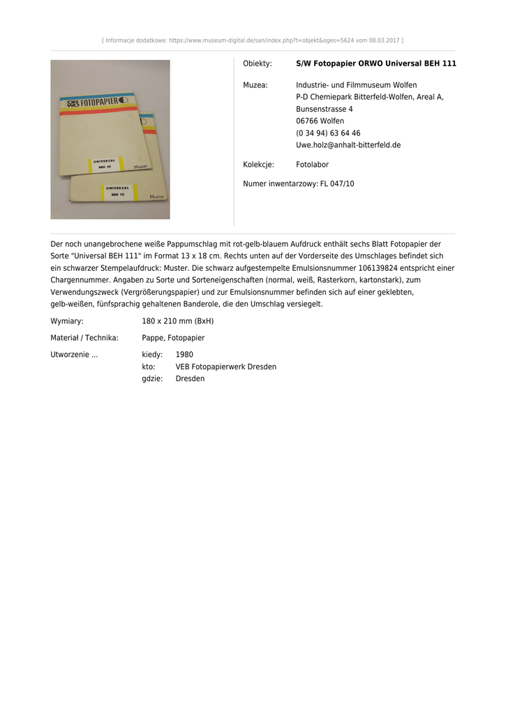 [ Informacje dodatkowe: https://www.museum-digital.de/san/index.php?t=objekt&oges=5624 vom 08.03.2017 ] Obiekty: S/W Fotopapier ORWO Universal BEH 111 Muzea: Industrie- und Filmmuseum Wolfen P-D Chemiepark Bitterfeld-Wolfen, Areal A, Bunsenstrasse 4 06766 Wolfen (0 34 94) 63 64 46 [email protected] Kolekcje: Fotolabor Numer inwentarzowy: FL 047/10 Der noch unangebrochene weiße Pappumschlag mit rot-gelb-blauem Aufdruck enthält sechs Blatt Fotopapier der Sorte "Universal BEH 111" im Format 13 x 18 cm. Rechts unten auf der Vorderseite des Umschlages befindet sich ein schwarzer Stempelaufdruck: Muster. Die schwarz aufgestempelte Emulsionsnummer 106139824 entspricht einer Chargennummer. Angaben zu Sorte und Sorteneigenschaften (normal, weiß, Rasterkorn, kartonstark), zum Verwendungszweck (Vergrößerungspapier) und zur Emulsionsnummer befinden sich auf einer geklebten, gelb-weißen, fünfsprachig gehaltenen Banderole, die den Umschlag versiegelt. Wymiary: 180 x 210 mm (BxH) Materiał / Technika: Pappe, Fotopapier Utworzenie ... kiedy: 1980 kto: VEB Fotopapierwerk Dresden gdzie: Dresden