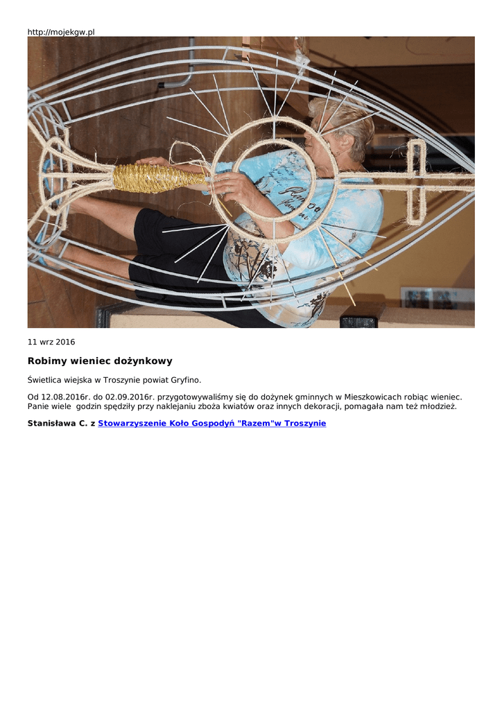 http://mojekgw.pl 11 wrz 2016 Robimy wieniec dożynkowy Świetlica wiejska w Troszynie powiat Gryfino. Od 12.08.2016r. do 02.09.2016r. przygotowywaliśmy się do dożynek gminnych w Mieszkowicach robiąc wieniec. Panie wiele godzin spędziły przy naklejaniu zboża kwiatów oraz innych dekoracji, pomagała nam też młodzież. Stanisława C. z Stowarzyszenie Koło Gospodyń "Razem"w Troszynie
