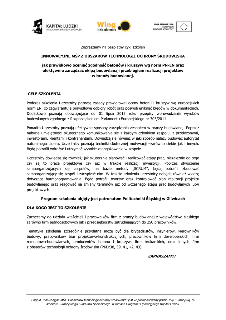 Zapraszamy na bezpłatny cykl szkoleń INNOWACYJNE MŚP Z OBSZARÓW TECHNOLOGII OCHRONY ŚRODOWISKA jak prawidłowo oceniać zgodność betonów i kruszyw wg norm PN-EN oraz efektywnie zarządzać ekipą budowlaną i przebiegiem realizacji projektów w branŜy budowlanej. CELE SZKOLENIA Podczas szkolenia Uczestnicy poznają zasady prawidłowej oceny betonu i kruszyw wg europejskich norm EN, co zagwarantuje prawidłowe odbiory robót oraz pozwoli uniknąć błędów w dokumentacjach. Dodatkowo poznają obowiązujące od 01 lipca 2013 roku przepisy wprowadzania wyrobów budowlanych zgodnego z Rozporządzeniem Parlamentu Europejskiego nr 305/2011 Ponadto Uczestnicy poznają efektywne sposoby zarządzania zespołem w branŜy budowlanej. Poprzez nabycie umiejętności skutecznego komunikowania się z kaŜdym członkiem zespołu, z przełoŜonymi, inwestorami, klientami i kontrahentami. Dowiedzą się równieŜ w jaki sposób naleŜy budować autorytet naturalnego Lidera. Uczestnicy poznają techniki skutecznej motywacji –zarówno siebie jak i innych. Będą potrafili wdroŜyć i utrzymać wysokie zaangaŜowanie w zespole. Uczestnicy dowiedzą się równieŜ, jak skutecznie planować i realizować etapy prac, niezaleŜnie od tego czy są to prace projektowe czy juŜ w trakcie realizacji inwestycji. Poprzez stworzenie samoorganizujących się zespołów, na bazie metody „SCRUM”, będą potrafili zbudować samoorganizujący się zespół i zarządzać nim. W trakcie szkolenia uczestnicy nabędą równieŜ wiedzę dotyczącą harmonogramowania. Będą potrafili tworzyć oraz kontrolować plan realizacji projektu budowlanego oraz reagować na zmiany terminów juŜ od wczesnego etapu prac budowlanych lub/i projektowych. Program szkolenia objęty jest patronatem Politechniki Śląskiej w Gliwicach DLA KOGO JEST TO SZKOLENIE Zachęcamy do udziału właścicieli i pracowników firm z branŜy budowlanej z województwa śląskiego zarówno firm jednoosobowych jak i przedsiębiorstw zatrudniających do 250 pracowników. Tematyka szkolenia szczególnie przydatna moŜe być dla brygadzistów, inŜynierów, kierowników budowy, pracowników biur projektowo-konstrukcyjnych, pracowników firm developerskich, firm remontowo-budowlanych, producentów betonu i kruszyw, firm brukarskich, oraz innych firm z obszarów technologii ochrony środowiska (PKD:38, 39, 41, 42, 43) ZAPRASZAMY! Projekt „Innowacyjne MŚP z obszarów technologii ochrony środowiska” jest współfinansowany przez Unię Europejską ze środków Europejskiego Funduszu Społecznego w ramach Programu Operacyjnego Kapitał Ludzki. PROGRAM SZKOLENIA: CZĘŚĆ I. Jak efektywnie zarządzać ekipą budowlaną (2 dni szkoleniowe) 1. Komunikacja w zespole, czyli jak ja się komunikuję i jak prawidłowo komunikować się z innymi - style komunikacji - jaki jest mój styl komunikacji - dostosowanie stylu komunikacji do rozmówcy 2. Feedback, czyli jak profesjonalnie przekazywać swoje oczekiwania lub uwagi. - model FUKOZ - model klasycznej informacji zwrotnej - w jaki sposób wpływać na zachowania innych - jak kreować kulturę feedback - jak zapobiegać konfliktom 3. Motywacja, czyli jak skutecznie motywować siebie i innych do działania - fakty i mity motywacji - teoria i modele profesjonalnej motywacji - w jaki sposób zwiększać wydajność własną i innych - jak przeciwdziałać wypaleniu zawodowemu - co robić, jak nie mogę motywować poprzez dawanie większych pieniędzy 4. Zasada WIN-WIN, czyli jak zyskać najwięcej na współpracy z innymi - jak współpracować i osiągać największe korzyści - jak negocjować, Ŝeby ugrać jak najwięcej i pozostawić uczucie wygranej takŜe partnerowi negocjacji 5. Etapy procesu grupowego, czyli od chaosu do efektywnie działających zespołów - w jaki sposób identyfikować etapy rozwoju zespołu pracowników - co ma wpływ na zmiany grupowe w zespole - jak szybko i efektywnie wyjść z etapu burzy w zespole CZĘŚĆ II. Jak planować i terminowo realizować inwestycje w branŜy budowlanej (1 dzień szkoleniowy) 1. Harmonogramowanie w projekcie, czyli jak planować i terminowo realizować inwestycje w branŜy budowlanej - w jaki sposób utworzyć dobry i realny harmonogram - jak identyfikować ryzyka na wczesnym etapie realizacji prac - w jaki sposób identyfikować ścieŜkę krytyczną w harmonogramie projektu - co zrobić, Ŝeby skrócić czas realizacji inwestycji, nadrobić opóźnienia - w jaki sposób szacować czas realizacji zadań w warunkach niepewności (np. pogodowej) 2. Efektywne zarządzanie ekipą budowlaną, czyli samoorganizujące się zespoły - AGILE – zwinne metodologie zarządzania zespołem - SCRUM – samoorganizujący się zespołów - jakie są role i obowiązki w zespołach zwinnych - jakie ceremonie towarzyszą realizacji prac metodologią SCRUM - w jaki sposób zespoły same zwiększają efektywność własnej pracy - w jaki sposób w przedsięwzięciach budowlanych wdroŜyć ideę samoorganizujących zespołów Projekt „Innowacyjne MŚP z obszarów technologii ochrony środowiska” jest współfinansowany przez Unię Europejską ze środków Europejskiego Funduszu Społecznego w ramach Programu Operacyjnego Kapitał Ludzki. CZĘŚĆ III. Jak prawidłowo oceniać zgodność betonów i kruszyw wg norm PN-EN 1. Europejskie normy betonów -(1 dzień szkoleniowy) - prawne aspekty norm betonów – dlaczego warto badać beton - jak pobierać próbki do badań - rodzaje badań i ich interpretacja - jak zagwarantować odbiór robót betonowych. 2. Europejskie normy kruszyw (1 dzień szkoleniowy ) - prawne aspekty norm kruszyw – dlaczego warto badać kruszywa - jak pobierać próbki do badań - rodzaje badań i ich interpretacja - jak zagwarantować odbiór robót z wykorzystaniem kruszyw. 3. Aktualne przepisy wprowadzania wyrobów budowlanych na terenie inwestycji wg. Rozporządzenia Parlamentu Europejskiego nr 305/2011 oraz prawne aspekty umów w branŜy budow