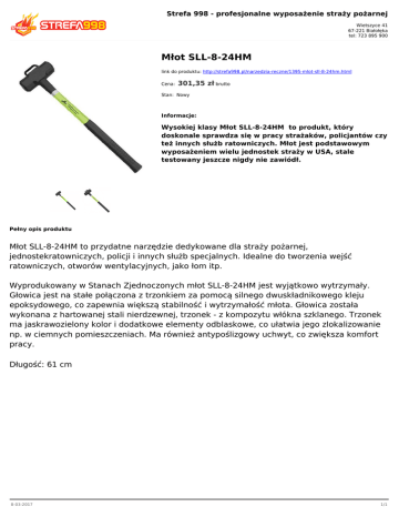 Strefa 998 - profesjonalne wyposażenie straży pożarnej Wietszyce 41 67-221 Białołęka tel: 723 895 900 Młot SLL-8-24HM link do produktu: http://strefa998.pl/narzedzia-reczne/1395-mlot-sll-8-24hm.html Cena: 301,35 zł brutto Stan: Nowy Informacje: Wysokiej klasy Młot SLL-8-24HM to produkt, który doskonale sprawdza się w pracy strażaków, policjantów czy też innych służb ratowniczych. Młot jest podstawowym wyposażeniem wielu jednostek straży w USA, stale testowany jeszcze nigdy nie zawiódł. Pełny opis produktu Młot SLL-8-24HM to przydatne narzędzie dedykowane dla straży pożarnej, jednostekratowniczych, policji i innych służb specjalnych. Idealne do tworzenia wejść ratowniczych, otworów wentylacyjnych, jako łom itp. Wyprodukowany w Stanach Zjednoczonych młot SLL-8-24HM jest wyjątkowo wytrzymały. Głowica jest na stałe połączona z trzonkiem za pomocą silnego dwuskładnikowego kleju epoksydowego, co zapewnia większą stabilność i wytrzymałość młota. Głowica została wykonana z hartowanej stali nierdzewnej, trzonek - z kompozytu włókna szklanego. Trzonek ma jaskrawozielony kolor i dodatkowe elementy odblaskowe, co ułatwia jego zlokalizowanie np. w ciemnych pomieszczeniach. Ma również antypoślizgowy uchwyt, co zwiększa komfort pracy. Długość: 61 cm 8-03-2017 1/1