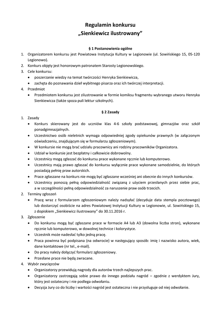 Regulamin konkursu „Sienkiewicz ilustrowany” 1. 2. 3. 4. § 1 Postanowienia ogólne Organizatorem konkursu jest Powiatowa Instytucja Kultury w Legionowie (ul. Sowińskiego 15, 05-120 Legionowo). Konkurs objęty jest honorowym patronatem Starosty Legionowskiego. Cele konkursu: poszerzanie wiedzy na temat twórczości Henryka Sienkiewicza, zachęta do poznawania dzieł wybitnego pisarza oraz ich twórczej interpretacji. Przedmiot Przedmiotem konkursu jest zilustrowanie w formie komiksu fragmentu wybranego utworu Henryka Sienkiewicza (także spoza puli lektur szkolnych). § 2 Zasady 1. Zasady Konkurs skierowany jest do uczniów klas 4-6 szkoły podstawowej, gimnazjów oraz szkół ponadgimnazjalnych. Uczestnictwo osób nieletnich wymaga odpowiedniej zgody opiekunów prawnych (w załączonym oświadczeniu, znajdującym się w formularzu zgłoszeniowym). W konkursie nie mogą brać udziału pracownicy ani rodziny pracowników Organizatora. Udział w konkursie jest bezpłatny i całkowicie dobrowolny. Uczestnicy mogą zgłaszać do konkursu prace wykonane ręcznie lub komputerowo. Uczestnicy mają prawo zgłaszać do konkursu wyłącznie prace wykonane samodzielnie, do których posiadają pełnię praw autorskich. Prace zgłaszane na konkurs nie mogą być zgłaszane wcześniej ani obecnie do innych konkursów. Uczestnicy ponoszą pełną odpowiedzialność związaną z użyciem przesłanych przez siebie prac, a w szczególności pełną odpowiedzialność za naruszenie praw osób trzecich. 2. Terminy zgłoszeń Pracę wraz z formularzem zgłoszeniowym należy nadsyłać (decyduje data stempla pocztowego) lub dostarczyć osobiście na adres Powiatowej Instytucji Kultury w Legionowie, ul. Sowińskiego 15, z dopiskiem „Sienkiewicz ilustrowany” do 30.11.2016 r. 3. Zgłoszenie Do konkursu mogą być zgłaszane prace w formacie A4 lub A3 (dowolna liczba stron), wykonane ręcznie lub komputerowo, w dowolnej technice i kolorystyce. Uczestnik może nadesłać tylko jedną pracę. Praca powinna być podpisana (na odwrocie) w następujący sposób: imię i nazwisko autora, wiek, dane kontaktowe (nr tel., e-mail). Do pracy należy dołączyć formularz zgłoszeniowy. Przesłane prace nie będą zwracane. 4. Wybór zwycięzców Organizatorzy przewidują nagrody dla autorów trzech najlepszych prac. Organizatorzy zastrzegają sobie prawo do innego podziału nagród – zgodnie z werdyktem Jury, który jest ostateczny i nie podlega odwołaniu. Decyzja Jury co do liczby i wartości nagród jest ostateczna i nie przysługuje od niej odwołanie. Jury Konkursu zostanie powołane przez Dyrektora Powiatowej Instytucji Kultury w Legionowie. Przy ocenie prac zostaną wzięte pod uwagę: oryginalność, technika, jakość, estetyka (stosownie do wieku uczestników) i poprawność ortograficzna. Wyniki – prace oraz nazwiska zwycięzców konkursu zostaną opublikowane na stronie Powiatowej Instytucji Kultury (pik.legionowski.pl) w Legionowie oraz na profilu w serwisie Facebook (www.facebook.com/powiatowa.instytucja.kultury). O wynikach i terminie wręczenia nagród Uczestnicy zostaną powiadomieni za pomocą poczty elektronicznej. 5. Wartość nagród I nagroda – o wartości 350,00 zł. II nagroda – o wartości 250,00 zł. III nagroda – o wartości 150,00 zł. 6. Nagrodzonym nie przysługuje prawo do żądania ekwiwalentu pieniężnego za przyznaną nagrodę rzeczową. Prawo do odbioru nagrody nie może być przeniesione na osoby trzecie. 7. Dodatkowo Jury może przyznać wyróżnienia. 1. 2. 3. 4. 5. 6. 7. 8. 9. §3 Postanowienia końcowe Nadesłanie pracy oznacza akceptację regulaminu Konkursu. Ostateczna interpretacja Regulaminu zależy od Organizatora i Jury. Organizator zastrzega sobie prawo do zmian w Regulaminie, przerwania lub odwołania konkursu bez podania przyczyny. Organizator zastrzega sobie prawo do dyskwalifikowania prac naruszających prawa osób trzecich lub prawo polskie, zawierających treści pornograficzne lub godzące w uczucia religijne. Organizator zastrzega sobie prawo do wyłączenia z udziału w Konkursie prac o niskiej jakości technicznej, niespełniających kryterium tematycznego oraz niespełniających wyżej wymienionych wymogów. Udział w Konkursie jest jednoznaczny z udzieleniem Organizatorowi na czas nieokreślony prawa do nieodpłatnego wykorzystania prac w celu działań promocyjnych w następujących formach: utrwalania, zwielokrotniania wszelkimi możliwymi technikami, w tym technikami drukarskimi, komputerowymi, cyfrowymi i odmianami tych technik, obróbki graficznej i komputerowej, wprowadzania do obrotu, wprowadzania do pamięci komputerowej, nadania za pomocą wizji przez stację naziemną oraz za pomocą satelity, rozpowszechniania w postaci drukowanej w dowolnej liczbie publikacji i w dowolnym nakładzie, rozpowszechniania za pomocą sieci internetowej i innych nośników elektronicznych ‒ ich publikacji w oficjalnej witrynie internetowej oraz w innych formach utrwaleń, a także innych działań promocyjnych Powiatowej Instytucji Kultury w Legionowie. Z chwilą nadesłania pracy i podpisanego Formularza zgłoszeniowego Uczestnik udziela Organizatorowi licencji niewyłącznej w zakresie nadesłanej pracy na polach ekspozycji wskazanych w zdaniu poprzednim. Udział w Konkursie jest równoznaczny z oświadczeniem Uczestnika, że praca zgłoszona do Konkursu jest jego autorstwa i nie została zgłoszona do innych konkursów i publikacji. Udział w Konkursie jest równoznaczny z wyrażeniem przez Uczestnika zgody na przetwarzanie przez Organizatora jego danych osobowych na potrzeby Konkursu. Uczestnicy, których prace zostaną wykorzystane do działań promocyjnych Powiatowej Instytucji Kultury w Legionowie, wyrażają zgodę na opublikowanie imienia i nazwiska autora pracy w opisie. Wypełnienie i podpisanie Karty zgłoszeniowej Konkursu jest równoznaczne ze zgodą na powyższe. Regulamin wchodzi w życie z dniem ogłoszenia.