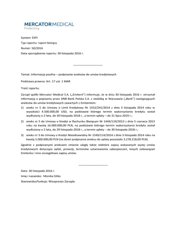 System: ESPI Typ raportu: raport bieżący Numer: 50/2016 Data sporządzenia raportu: 30 listopada 2016 r. __________________ Temat: Informacja poufna – podpisanie aneksów do umów kredytowych Podstawa prawna: Art. 17 ust. 1 MAR Treść raportu: Zarząd spółki Mercator Medical S.A. („Emitent”) informuje, że w dniu 30 listopada 2016 r. otrzymał informację o popisaniu przez DNB Bank Polska S.A. z siedzibą w Warszawie („Bank”) następujących aneksów do umów kredytowych zawartych z Emitentem: 1) aneks nr 5 do Umowy o Limit Kredytowy Nr 1552/241/2014 z dnia 3 listopada 2014 roku w wysokości 4.500.000,00 USD, na podstawie którego termin wykorzystania kredytu został wydłużony o 2 lata, do 30 listopada 2018 r., a termin spłaty – do 31 lipca 2019 r.; 2) aneks nr 5 do Umowy o Kredyt w Rachunku Bieżącym Nr 1444/119/2013 z dnia 5 czerwca 2013 roku na kwotę 16.000.000,00 PLN, na podstawie którego termin wykorzystania kredytu został wydłużony o 2 lata, do 29 listopada 2018 r., a termin spłaty – do 30 listopada 2018 r.; 3) aneks nr 3 do Umowy o Kredyt Nieodnawialny Nr 1549/114/2014 z dnia 3 listopada 2014 roku na kwotę 5.000.000,00 PLN (na dzień podpisania aneksu do spłaty pozostało 3.278.218,00 PLN). Zgodnie z podpisanymi aneksami zmianie uległy także niektóre zapisy wskazanych wyżej umów kredytowych dotyczące opłat, prowizji, terminów ustanowienia zabezpieczeń, innych zobowiązań Emitenta i inne szczegółowe zapisy umów. __________________ Data: 30 listopada 2016 r. Imię i nazwisko: Monika Sitko Stanowisko/funkcja: Wiceprezes Zarządu