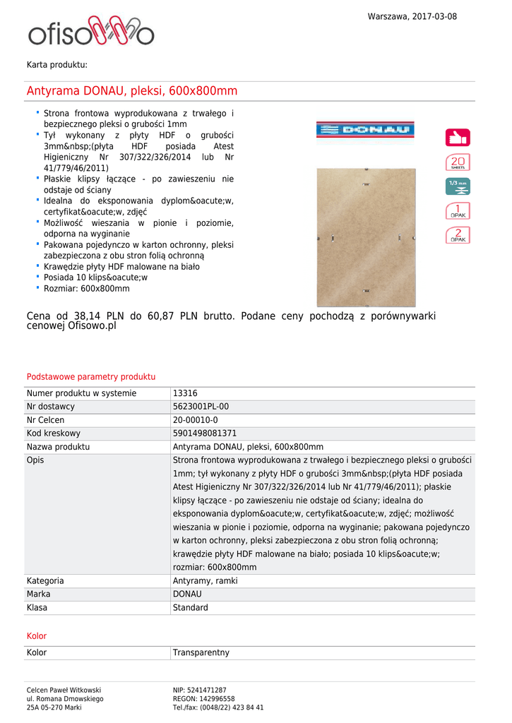 Warszawa, 2017-03-08 Karta produktu: Antyrama DONAU, pleksi, 600x800mm Strona frontowa wyprodukowana z trwałego i bezpiecznego pleksi o grubości 1mm Tył wykonany z płyty HDF o grubości 3mm (płyta HDF posiada Atest Higieniczny Nr 307/322/326/2014 lub Nr 41/779/46/2011) Płaskie klipsy łączące - po zawieszeniu nie odstaje od ściany Idealna do eksponowania dyplomów, certyfikatów, zdjęć Możliwość wieszania w pionie i poziomie, odporna na wyginanie Pakowana pojedynczo w karton ochronny, pleksi zabezpieczona z obu stron folią ochronną Krawędzie płyty HDF malowane na biało Posiada 10 klipsów Rozmiar: 600x800mm Cena od 38,14 PLN do 60,87 PLN brutto. Podane ceny pochodzą z porównywarki cenowej Ofisowo.pl Podstawowe parametry produktu Numer produktu w systemie 13316 Nr dostawcy 5623001PL-00 Nr Celcen 20-00010-0 Kod kreskowy 5901498081371 Nazwa produktu Antyrama DONAU, pleksi, 600x800mm Opis Strona frontowa wyprodukowana z trwałego i bezpiecznego pleksi o grubości 1mm; tył wykonany z płyty HDF o grubości 3mm (płyta HDF posiada Atest Higieniczny Nr 307/322/326/2014 lub Nr 41/779/46/2011); płaskie klipsy łączące - po zawieszeniu nie odstaje od ściany; idealna do eksponowania dyplomów, certyfikatów, zdjęć; możliwość wieszania w pionie i poziomie, odporna na wyginanie; pakowana pojedynczo w karton ochronny, pleksi zabezpieczona z obu stron folią ochronną; krawędzie płyty HDF malowane na biało; posiada 10 klipsów; rozmiar: 600x800mm Kategoria Antyramy, ramki Marka DONAU Klasa Standard Kolor Kolor Transparentny Celcen Paweł Witkowski ul. Romana Dmowskiego 25A 05-270 Marki NIP: 5241471287 REGON: 142996558 Tel./fax: (0048/22) 423 84 41 Warszawa, 2017-03-08 Karta katalogowa produktu cd. Antyrama DONAU, pleksi, 600x800mm Cecha W ofercie od 2013-01 Materiał Pleksi/HDF Produkt Antyrama Rodzaj B.d. Typ Nietłukąca Wymiary Format 600x800 Format 600x800 Grubość (mm) 1/3 Wymiary (mm) 600x800 Certyfikaty Hit Standard Ilość lat gwarancji 1 Nowy produkt w ofercie Standard Wspólny słownik zamówień CPV 39298200-9 Zamiennik Zamiennik KF15658 Serdecznie zapraszamy do współpracy zespół. Ofisowo.pl Celcen Paweł Witkowski ul. Romana Dmowskiego 25A 05-270 Marki NIP: 5241471287 REGON: 142996558 Tel./fax: (0048/22) 423 84 41