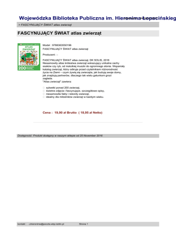 Utworzono : 08Łopacińskieg March 2017 Wojewódzka Biblioteka Publiczna im. Hieronima > FASCYNUJĄCY ŚWIAT atlas zwierząt FASCYNUJĄCY ŚWIAT atlas zwierząt Model : 9788363550196 FASCYNUJĄCY ŚWIAT atlas zwierząt Producent : FASCYNUJĄCY ŚWIAT atlas zwierząt, DK SOLIS, 2016 Niesamowity atlas królestwa zwierząt wskazujący unikalne cechy ssaków czy ryb, od malutkiej muszki do ogromnego słonia. Wspaniały katalog zwierząt, który odkryje przed czytelnikiem różnorodność życia na Ziemi – czym żywią się zwierzęta, jak budują swoje domy, jak znajdują partnerów, dlaczego tak wielu gatunkom grozi zagłada. "Atlas zwierząt" zawiera: � sylwetki ponad 200 zwierząt, � świetne zdjęcia i fascynujące, szczegółowe opisy, � niesamowite fakty i rekordy zwierząt, � idealny dla miłośników zwierząt w każdym wieku. Cena : 19,90 zł Brutto ( 18,95 zł Netto) Dostępność: Produkt dostępny w naszym sklepie od 25 November 2016 kontakt : - [email protected] Strona 1