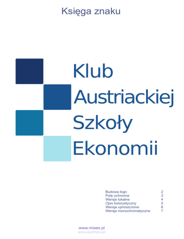 Ksiêga znaku Klub Austriackiej Szko³y Ekonomii Budowa logo Pole ochronne Wersje lokalne Opis kolorystyczny Wersja uproszczona Wersje monochromatyczne www.mises.pl www.austriacy.pl 2 3 4 5 6 7 Budowa logo 1/4 a a 1/2 a 1/4 a czcionka: DejaVu Sans odstêp miêdzy literami kolejno w rzêdach (wartoœci ujemne): -25%, -75%, -25%, -25% -2- www.mises.pl www.austriacy.pl Pole ochronne 1/2 a 3/4 a 3/4 a 1/2 a -3- www.mises.pl www.austriacy.pl Wersje lokalne 1/2 a w Krakowie zakropkowany obszar pomocniczy to pole tekstu, tekst z nazw¹ miasta jest wyœrodkowany w pionie i poziomie czcionka: DejaVu Sans, wielkoœæ ok. 75% wielkoœci czcionki w napisie Klub Austriackiej Szko³y Ekonomii, odleg³oœci¹ miêdzy literami mo¿na manipulowaæ, w zale¿noœci od d³ugoœci nazwy miasta -4- www.mises.pl www.austriacy.pl Opis kolorystyczny PANTONE 534 C CMYK: C:95 M:72 Y:9 K:38 RGB: R:46 G:64 B:107 + tekst PANTONE 647 C CMYK: C:96 M:53 Y:5 K:24 RGB: R:38 G:87 B:135 PANTONE 7468 C CMYK: C:94 M:16 Y:7 K:28 RGB: R:0 G:120 B:156 PANTONE 2975 C CMYK: C:35 M:0 Y:6 K:0 RGB: R:176 G:217 B:230 -5www.austriacy.pl Wersja uproszczona K A S E -6- www.mises.pl www.austriacy.pl Wersje monochromatyczne K A S E Wartoœci podane w skali szaroœci (od góry): 0 (czarny), 75, 150, 210. Tekst: 0 (czarny) -7- www.mises.pl www.austriacy.pl