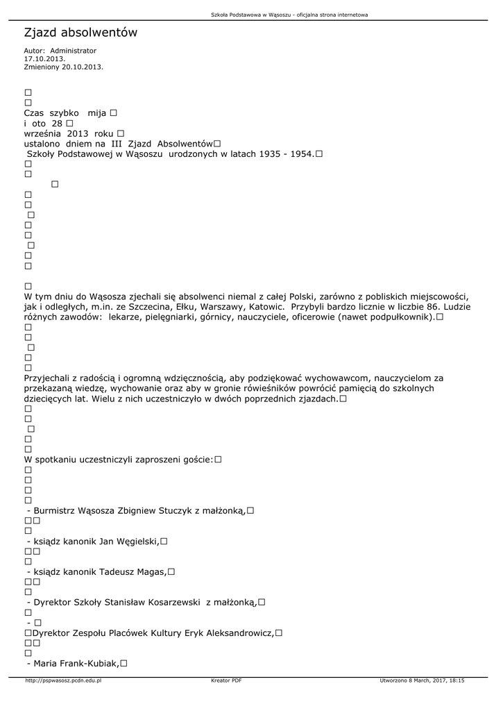 Szkoła Podstawowa w Wąsoszu - oficjalna strona internetowa Zjazd absolwentów Autor: Administrator 17.10.2013. Zmieniony 20.10.2013. Czas szybko mija i oto 28 września 2013 roku ustalono dniem na III Zjazd Absolwentów Szkoły Podstawowej w Wąsoszu urodzonych w latach 1935 - 1954. W tym dniu do Wąsosza zjechali się absolwenci niemal z całej Polski, zarówno z pobliskich miejscowości, jak i odległych, m.in. ze Szczecina, Ełku, Warszawy, Katowic. Przybyli bardzo licznie w liczbie 86. Ludzie różnych zawodów: lekarze, pielęgniarki, górnicy, nauczyciele, oficerowie (nawet podpułkownik). Przyjechali z radością i ogromną wdzięcznością, aby podziękować wychowawcom, nauczycielom za przekazaną wiedzę, wychowanie oraz aby w gronie rówieśników powrócić pamięcią do szkolnych dziecięcych lat. Wielu z nich uczestniczyło w dwóch poprzednich zjazdach. W spotkaniu uczestniczyli zaproszeni goście: - Burmistrz Wąsosza Zbigniew Stuczyk z małżonką, - ksiądz kanonik Jan Węgielski, - ksiądz kanonik Tadeusz Magas, - Dyrektor Szkoły Stanisław Kosarzewski z małżonką, - Dyrektor Zespołu Placówek Kultury Eryk Aleksandrowicz, - Maria Frank-Kubiak, http://pspwasosz.pcdn.edu.pl Kreator PDF Utworzono 8 March, 2017, 18:15 Szkoła Podstawowa w Wąsoszu - oficjalna strona internetowa - Cecylia Ławniczak-Bohdziewicz - nauczyciele: Aniela Wrotniak, Waleria Kosarzewska, Lidia Mrugała-Zygmunt, Władysław Góroński, Rudolf Darłak . III Zjazd Absolwentów rozpoczęto mszą w Kościele św. Józefa. Zebranych powitał ks. kan. Jan Węgielski – proboszcz parafii, który wspólnie z ks. kanonikiem Tadeuszem Magasem, absolwentem naszej szkoły, przystąpił do odprawienia Eucharystii. Wszyscy uczestnicy dziękowali Bogu za dar życia, a nauczycielom, wychowawcom za wiedzę i wychowanie. W ciszy modlono się za nauczycieli, pracowników szkoły, zmarłych kolegów. Mszę urozmaiciła muzyka organowa w wykonaniu pana Pawła Nawrockiego oraz piękny śpiew pani Aleksandry Sztor. W jej wykonaniu pieśń Ave Maryja dopełniła nastroju. W tym czasie, zgodnie z tradycją, na nagrobkach nauczycieli, pracowników szkoły płonęły znicze i leżały symboliczne kwiaty. Po mszy, tradycyjnie, na schodkach kościoła, wspólna fotografia. Następnie, przejazd autokarem i samochodami przed Zespół Placówek Kultury, gdzie wyświetlacz na ścianie witał przybyłych gości. Na sali uczestników zjazdu przywitali: Dyrektor Zespołu Placówek Kultury Pan Eryk Aleksandrowicz, w imieniu organizatorów, Pani Irena Hołodowa oraz Burmistrz Wąsosza Zbigniew Stuczyk. Przy bogato zastawionych stołach i zespole muzycznym pani Aleksandry Sztor bawiono się do godz. 400 rano. Pożegnaniom nie było końca. Wielu wyrażało chęć udziału w następnym zjeździe. Organizatorzy w składzie: pani Zofia Szałata, pani Maria Sobaniak, pani Zofia Matuszewska i pani Irena Hołodowa składają podziękowanie: Burmistrzowi Wąsosza Zbigniewowi Stuczykowi, ks. Proboszczowi Janowi Węgielskiemu, ks. Tadeuszowi Magasowi, Dyrektorowi Zespołu Placówek Kultury Erykowi Aleksandrowiczowi, pani Stanisławie Szczok oraz firmie Foto-Duet za pomoc w zorganizowaniu spotkania. Również dziękują wszystkim zaproszonym gościom i absolwentom za uczestnictwo w zjeździe. http://pspwasosz.pcdn.edu.pl Kreator PDF Utworzono 8 March, 2017, 18:15 Szkoła Podstawowa w Wąsoszu - oficjalna strona internetowa Irena Hołodowa Zobacz galerię zdjęć na: zpk.wasosz.gmina.pl http://pspwasosz.pcdn.edu.pl Kreator PDF Utworzono 8 March, 2017, 18:15