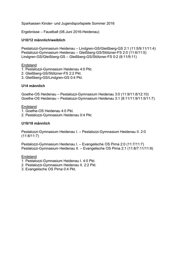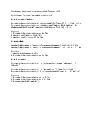 Sparkassen Kinder- und Jugendsportspiele Sommer 2016 Ergebnisse – Faustball (08.Juni 2016-Heidenau) U10/12 männlich/weiblich Pestalozzi-Gymnasium Heidenau – Lindgren-GS/Gleißberg-GS 2:1 (11:5/9:11/11:4) Pestalozzi-Gymnasium Heidenau – Gleißberg-GS/Stötzner-FS 2:0 (11:6/11:5) Lindgren-GS/Gleißberg-GS – Gleißberg-GS/Stötzner-FS 0:2 (8:11/9:11) Endstand 1. Pestalozzi-Gymnasium Heidenau 4:0 Pkt. 2. Gleißberg-GS/Stötzner-FS 2:2 Pkt. 3. Gleißberg-GS/Lindgren-GS 0:4 Pkt. U14 männlich Goethe-OS Heidenau – Pestalozzi-Gymnasium Heidenau 3:0 (11:9/11:8/12:10) Goethe-OS Heidenau – Pestalozzi-Gymnasium Heidenau 3:1 (8:11/11:9/11:5/11:7) Endstand 1. Goethe-OS Heidenau 4:0 Pkt. 2. Pestalozzi-Gymnasium Heidenau 0:4 Pkt. U16/18 männlich Pestalozzi-Gymnasium Heidenau I. – Pestalozzi-Gymnasium Heidenau II. 2:0 (11:8/11:7) Pestalozzi-Gymnasium Heidenau I. – Evangelische OS Pirna 2:0 (11:7/11:7) Pestalozzi-Gymnasium Heidenau II. – Evangelische OS Pirna 2:1 (11:8/7:11/11:9) Endstand 1. Pestalozzi-Gymnasium Heidenau I. 4:0 Pkt. 2. Pestalozzi-Gymnasium Heidenau II. 2:2 Pkt. 3. Evangelische OS Pirna 0:4 Pkt.