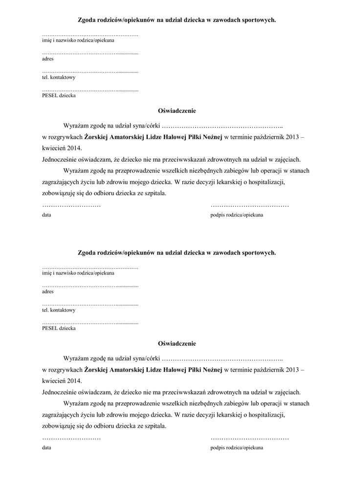 Zgoda rodziców/opiekunów na udział dziecka w zawodach sportowych. ……………………………………………… imię i nazwisko rodzica/opiekuna ……………………………………................ adres ……………………………………................ tel. kontaktowy ……………………………………................ PESEL dziecka Oświadczenie Wyrażam zgodę na udział syna/córki ……………………………………………….. w rozgrywkach Żorskiej Amatorskiej Lidze Halowej Piłki Nożnej w terminie październik 2013 – kwiecień 2014. Jednocześnie oświadczam, że dziecko nie ma przeciwwskazań zdrowotnych na udział w zajęciach. Wyrażam zgodę na przeprowadzenie wszelkich niezbędnych zabiegów lub operacji w stanach zagrażających życiu lub zdrowiu mojego dziecka. W razie decyzji lekarskiej o hospitalizacji, zobowiązuję się do odbioru dziecka ze szpitala. ……………………… ……………………………… data podpis rodzica/opiekuna Zgoda rodziców/opiekunów na udział dziecka w zawodach sportowych. ……………………………………………… imię i nazwisko rodzica/opiekuna ……………………………………................ adres ……………………………………................ tel. kontaktowy ……………………………………................ PESEL dziecka Oświadczenie Wyrażam zgodę na udział syna/córki ……………………………………………….. w rozgrywkach Żorskiej Amatorskiej Lidze Halowej Piłki Nożnej w terminie październik 2013 – kwiecień 2014. Jednocześnie oświadczam, że dziecko nie ma przeciwwskazań zdrowotnych na udział w zajęciach. Wyrażam zgodę na przeprowadzenie wszelkich niezbędnych zabiegów lub operacji w stanach zagrażających życiu lub zdrowiu mojego dziecka. W razie decyzji lekarskiej o hospitalizacji, zobowiązuję się do odbioru dziecka ze szpitala. ……………………… ……………………………… data podpis rodzica/opiekuna