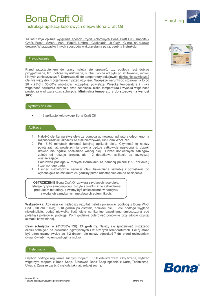 Bona Craft Oil Finishing Instrukcja aplikacji kolorowych olejów Bona Craft Oil Ta instrukcja opisuje wyłącznie sposób użycia kolorowych Bona Craft Oil (Graphite Grafit, Frost - Szron , Ash - Popiół, Umbra - Czekolada lub Clay - Glina), na surowe drewno. W przypadku innych sposobów wykorzystania patrz: osobna instrukcja. Przygotowanie Przed przystąpieniem do pracy należy się upewnić, czy podłoga jest dobrze przygotowana, tzn. dobrze wyszlifowana, sucha i wolna od pyłu po szlifowaniu, wosku i innych zanieczyszczeń. Doprowadzić do temperatury pokojowej i dokładnie wymieszać olej we wszystkich pojemnikach przed użyciem. Najlepsze warunki do stosowania to od 20 - 25°C i 30-60% wilgotności względnej powietrza. Wysoka temperatura i niska wilgotność powietrza skracają czas schnięcia, niska temperatura i wysoka wilgotność powietrza wydłużają czas schnięcia. Minimalna temperatura do stosowania wynosi 16°C. Systemy aplikacji • 1 - 2 aplikacje kolorowego Bona Craft Oil. Aplikacja 1. 2. 3. 4. Nałożyć cienką warstwę oleju za pomocą gumowego aplikatora odpornego na rozpuszczalniki, szpachli ze stali nierdzewnej lub Bona Wool Pad Po 15-30 minutach dokonać kolejnej aplikacji oleju. Czynność tę należy powtarzać, aż powierzchnia drewna będzie całkowicie nasycona tj. dopóki drewno nie będzie pochłaniać więcej oleju. Liczba koniecznych zabiegów zależy od rodzaju drewna, ale 1-2 dodatkowe aplikacje są zazwyczaj wystarczające. Polerować podłogę w różnych kierunkach za pomocą polerki (150 obr./min.) i czerwonego padu. Usunąć niezwłocznie nadmiar oleju bawełnianą szmatką i pozostawić do wyschnięcia na minimum 24 godziny przed udostepnieniem do obciążenia. OSTRZEŻENIE Bona Craft Oil zawiera szybkoschnące oleje. Istnieje ryzyko samozapłonu. Zużyte szmatki i inne zabrudzone produktem materiały, powinny być umieszczone w naczyniu z wodą lub zamykanych metalowych pojemnikach. Wskazówka: Aby uzyskać najlepszy rezultat, należy polerować podłogę z Bona Wool Pad (300 obr / min), 6-18 godzin po ostatniej aplikacji oleju. Jeśli podłoga wygląda niejednolicie, dodać niewielką ilość oleju na tkaninę bawełnianą umieszczoną pod polerką i polerować podłogę. Po 1 godzinie polerować ponownie przy użyciu czystej szmatki bawełnianej. Czas schnięcia (w 20°C/60% RH): 24 godziny. Należy się spodziewać dłuższego czasu schnięcia na drewnach egzotycznych i w niższych temperaturach. Pokój może być umeblowany zwykle po 1-2 dniach, ale należy odczekać 7 dni przed rozłożeniem dywanów lub myciem podłogi na mokro. Pielęgnacja Czyścić podłogę regularnie suchym mopem i / lub odkurzaczem. Gdy trzeba, wytrzeć wilgotnym mopem z Bona Soap. Stosować Bona Soap zgodnie z Kartą Techniczną. Uwaga: Zawsze czyścić metodą jak najbardziej suchą. Marzec 2013 Ta karta zastępuje wszystkie poprzednie wersje strona 1/2 Bona Craft Oil Finishing Instrukcja aplikacji kolorowych olejów Bona Craft Oil Do konserwacji Bona Craft Oil używać oleju Bona Care Oil. Aby przywrócić kolor w wytartych miejscach wskazane jest dodanie 20% oleju Bona Craft Oil Craft do Bona Oil Care. Częstotliwość tej operacji zależy od stopnia zużycia i może wynosić od co 3 lata w udomowionych środowiska do kilku razy w roku obiektach użyteczności publicznej. Szczegółowe informacje dotyczące pielegnacji znajdują się na www.bona.com Ważne uwagi Podane w tej Karcie informacje są przygotowane w oparciu o aktualny stan naszej wiedzy i nie stanowią gwarancji uzyskania właściwości produktu. Użytkownik jest odpowiedzialny za zastosowanie produktu, który zgodnie z zawartymi informacjami został stworzony do konkretnego celu oraz wymaga odpowiednich warunków podczas aplikacji. Bona jest odpowiedzialna za jakość dostarczonego wyrobu, natomiast profesjonalna aplikacja pozostaje w gestii wykonawcy i pozostaje poza naszą kontrolą. W razie wątpliwości przeprowadzić test lub próbę. Użytkownik jest zobowiązany do przeczytania i zrozumienia wszystkich informacji zawartych w Karcie Technicznej, etykietach na opakowaniach i w Karcie Charakterystyki przed użyciem lakieru. . Dalsze szczegółowe informacje o produkcie wraz z Kartą Charakterystyki Substancji Niebezpiecznej i Preparatu Niebezpiecznego można znaleźć na stronie internetowej www.bona.com. Marzec 2013 Ta karta zastępuje wszystkie poprzednie wersje strona 2/2