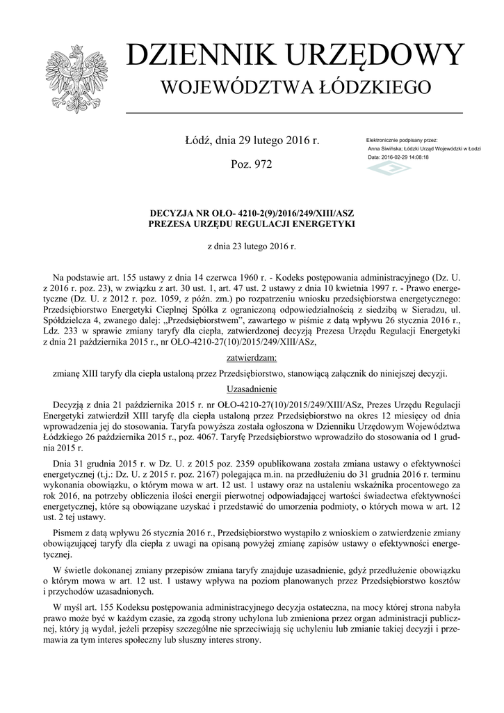 DZIENNIK URZĘDOWY WOJEWÓDZTWA ŁÓDZKIEGO Łódź, dnia 29 lutego 2016 r. Elektronicznie podpisany przez: Anna Siwińska; Łódzki Urząd Wojewódzki w Łodzi Poz. 972 Data: 2016-02-29 14:08:18 DECYZJA NR OŁO- 4210-2(9)/2016/249/XIII/ASZ PREZESA URZĘDU REGULACJI ENERGETYKI z dnia 23 lutego 2016 r. Na podstawie art. 155 ustawy z dnia 14 czerwca 1960 r. - Kodeks postępowania administracyjnego (Dz. U. z 2016 r. poz. 23), w związku z art. 30 ust. 1, art. 47 ust. 2 ustawy z dnia 10 kwietnia 1997 r. - Prawo energetyczne (Dz. U. z 2012 r. poz. 1059, z późn. zm.) po rozpatrzeniu wniosku przedsiębiorstwa energetycznego: Przedsiębiorstwo Energetyki Cieplnej Spółka z ograniczoną odpowiedzialnością z siedzibą w Sieradzu, ul. Spółdzielcza 4, zwanego dalej: „Przedsiębiorstwem”, zawartego w piśmie z datą wpływu 26 stycznia 2016 r., Ldz. 233 w sprawie zmiany taryfy dla ciepła, zatwierdzonej decyzją Prezesa Urzędu Regulacji Energetyki z dnia 21 października 2015 r., nr OŁO-4210-27(10)/2015/249/XIII/ASz, zatwierdzam: zmianę XIII taryfy dla ciepła ustaloną przez Przedsiębiorstwo, stanowiącą załącznik do niniejszej decyzji. Uzasadnienie Decyzją z dnia 21 października 2015 r. nr OŁO-4210-27(10)/2015/249/XIII/ASz, Prezes Urzędu Regulacji Energetyki zatwierdził XIII taryfę dla ciepła ustaloną przez Przedsiębiorstwo na okres 12 miesięcy od dnia wprowadzenia jej do stosowania. Taryfa powyższa została ogłoszona w Dzienniku Urzędowym Województwa Łódzkiego 26 października 2015 r., poz. 4067. Taryfę Przedsiębiorstwo wprowadziło do stosowania od 1 grudnia 2015 r. Dnia 31 grudnia 2015 r. w Dz. U. z 2015 poz. 2359 opublikowana została zmiana ustawy o efektywności energetycznej (t.j.: Dz. U. z 2015 r. poz. 2167) polegająca m.in. na przedłużeniu do 31 grudnia 2016 r. terminu wykonania obowiązku, o którym mowa w art. 12 ust. 1 ustawy oraz na ustaleniu wskaźnika procentowego za rok 2016, na potrzeby obliczenia ilości energii pierwotnej odpowiadającej wartości świadectwa efektywności energetycznej, które są obowiązane uzyskać i przedstawić do umorzenia podmioty, o których mowa w art. 12 ust. 2 tej ustawy. Pismem z datą wpływu 26 stycznia 2016 r., Przedsiębiorstwo wystąpiło z wnioskiem o zatwierdzenie zmiany obowiązującej taryfy dla ciepła z uwagi na opisaną powyżej zmianę zapisów ustawy o efektywności energetycznej. W świetle dokonanej zmiany przepisów zmiana taryfy znajduje uzasadnienie, gdyż przedłużenie obowiązku o którym mowa w art. 12 ust. 1 ustawy wpływa na poziom planowanych przez Przedsiębiorstwo kosztów i przychodów uzasadnionych. W myśl art. 155 Kodeksu postępowania administracyjnego decyzja ostateczna, na mocy której strona nabyła prawo może być w każdym czasie, za zgodą strony uchylona lub zmieniona przez organ administracji publicznej, który ją wydał, jeżeli przepisy szczególne nie sprzeciwiają się uchyleniu lub zmianie takiej decyzji i przemawia za tym interes społeczny lub słuszny interes strony. Dziennik Urzędowy Województwa Łódzkiego –2– Poz. 972 W świetle powyższych okoliczności, po przeprowadzeniu postępowania administracyjnego w niniejszej sprawie stwierdzono, że za uwzględnieniem wniosku Przedsiębiorstwa przemawia słuszny interes strony, a zmianie XIII taryfy dla ciepła nie sprzeciwiają się przepisy szczególne. Pozostałe ustalenia taryfy dla ciepła zatwierdzonej decyzją z dnia 21 października 2015 r., nr OŁO-421027(10)/2015/249/XIII/ASz pozostają bez zmian. W tym stanie rzeczy postanowiłem orzec, jak w sentencji. Pouczenie 1. Od niniejszej decyzji przysługuje odwołanie do Sądu Okręgowego w Warszawie – Sądu Ochrony Konkurencji i Konsumentów, za moim pośrednictwem, w terminie dwutygodniowym od dnia jej doręczenia (art. 30 ust. 2 i 3 ustawy – Prawo energetyczne oraz art. 47946 pkt 1 i art. 47947 § 1 Kodeksu postępowania cywilnego). 2. Odwołanie od decyzji powinno czynić zadość wymaganiom przepisanym dla pisma procesowego oraz zawierać oznaczenie zaskarżonej decyzji i wartości przedmiotu sporu, przytoczenie zarzutów, zwięzłe ich uzasadnienie, wskazanie dowodów, a także zawierać wniosek o uchylenie albo o zmianę decyzji - w całości lub części (art. 47949 Kodeksu postępowania cywilnego). Odwołanie należy przesłać na adres: Środkowo-Zachodniego Oddziału Terenowego Urzędu Regulacji Energetyki z siedzibą w Łodzi, ul. Żeromskiego 94C. 3. Stosownie do art. 47 ust. 3 w związku z art. 31 ust. 3 pkt 2 i ust. 4 ustawy – Prawo energetyczne, niniejsza decyzja zostanie skierowana do ogłoszenia w Dzienniku Urzędowym Województwa Łódzkiego. 4. Stosownie do art. 47 ust. 4 ustawy – Prawo energetyczne, Przedsiębiorstwo wprowadza zmianę taryfy do stosowania nie wcześniej niż po upływie 14 dni i nie później niż do 45 dnia od dnia jej opublikowania. z upoważnienia Prezesa Urzędu Regulacji Energetyki Dyrektor Środkowo-Zachodniego Oddziału Terenowego Urzędu Regulacji Energetyki z siedzibą w Łodzi Jadwiga Goździk Niniejsza decyzja zwolniona jest z opłaty skarbowej na podstawie art. 4 ustawy z dnia 16 listopada 2006 r. o opłacie skarbowej (Dz. U. z 2015 r. poz. 783, z późn. zm.) w związku z treścią załącznika do tej ustawy (część I pkt 53). Otrzymują: 1. Przedsiębiorstwo Energetyki Cieplnej Sp. z o.o., ul. Spółdzielcza 4, 98-200 Sieradz. 2. Wojewoda Łódzki. 3. a/a. Dziennik Urzędowy Województwa Łódzkiego –3– Poz. 972 Dziennik Urzędowy Województwa Łódzkiego –4– Poz. 972